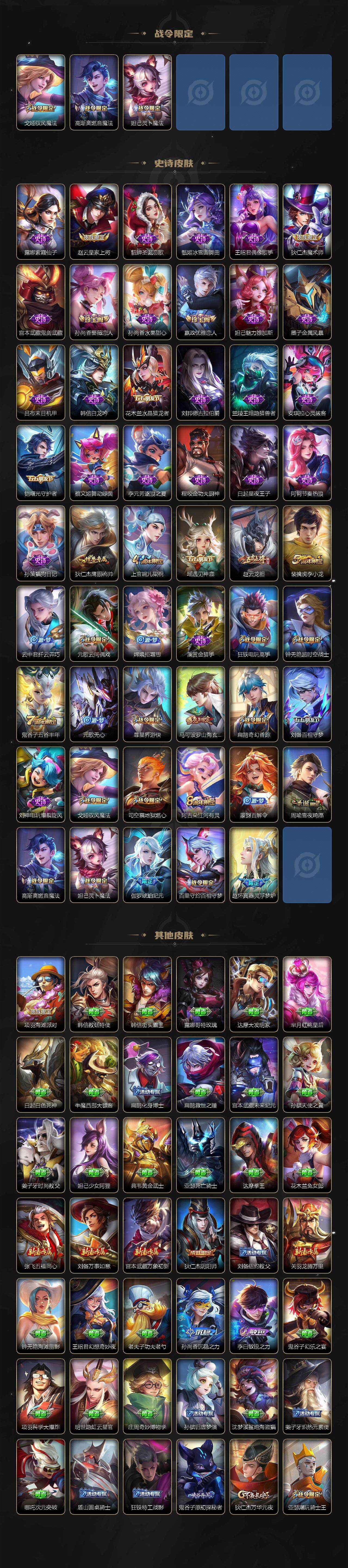 【限定皮肤】:狄仁杰阴阳师,赵云皇家上将,赵云龙胆,墨子神迹守卫,嬴政优雅恋人,孙尚香蔷薇恋人,钟无艳超时空战士,扁鹊奇幻香踪,元歌云间偶戏,元歌无心,马可波罗山海玄木吟,狄仁杰魔术师,狄仁杰万华元夜,项羽海滩派对,程咬金演武夺筹,亚瑟潮玩骑士王,刘备百相守梦,李元芳云中旅人,钟馗驱傩正仪,杨戬潮玩骑兵,鬼谷子原初探秘者,鬼谷子五谷丰年,苏烈千军破阵,裴擒虎李小龙,裴擒虎擒涛扼浪,狂铁电玩高手,云中君纤云弄巧,李信山海炽霜斩,上官婉儿梁祝,嫦娥拒霜思,嫦娥暖冬兔眠,西施玲珑珍味,鲁班大师探海日志,桑启海盐诗旅,暃星界游侠,戈娅驭风魔法,艾琳流音漫舞,司空震地狱燃心,阿古朵江河有灵,张良古海寻踪,蒙犽百解令,高渐离燃音魔法,妲己灵卜魔法,鬼谷子天穹祈灯,伽罗琥珀纪元,赵云乘龙铭钟鼎,沈梦溪龙舞盛年,刘邦剑破天穹,程咬金群星魔术团,周瑜熔金海岸