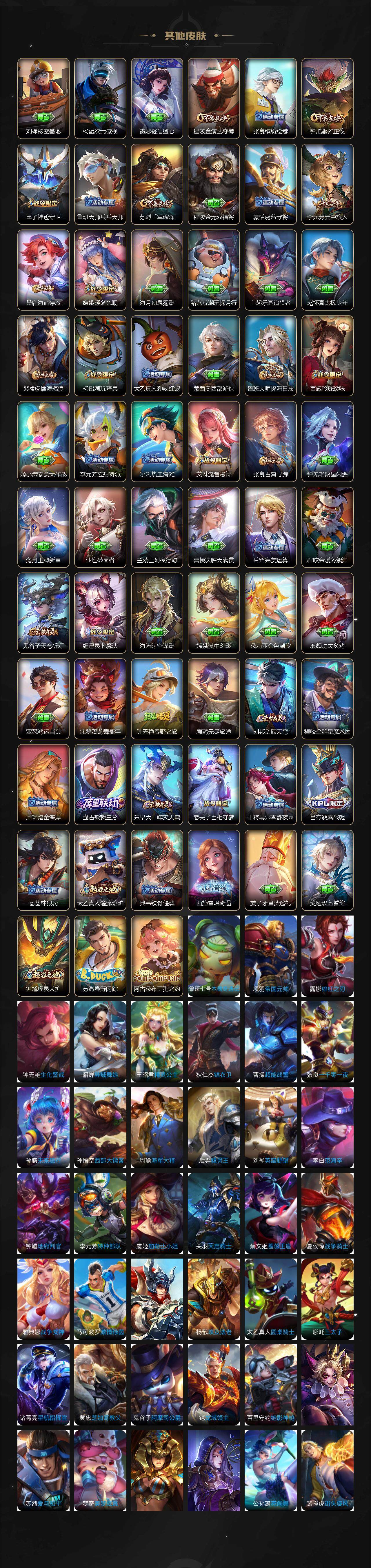 瑶遇见神鹿,李元芳逐浪之夏,孙策猫狗日记,阿轲节奏热浪,露娜紫霞仙子,王昭君偶像歌手,韩信白龙吟,吕布末日机甲,白起星夜王子,安琪拉心灵骇客,程咬金功夫厨神,刘邦德古拉伯爵,兰陵王暗隐猎兽者,宫本武藏鬼剑武藏,蔡文姬舞动绿茵,花木兰水晶猎龙者,铠曙光守护者,墨子金属风暴,貂蝉圣诞恋歌,嫦娥拒霜思,澜赏金猎手,刘备百相守梦,刘禅电玩·爆裂旋风,蒙犽百解令,周瑜雪夜绮愿,高渐离燃音魔法,伽罗琥珀纪元,赵怀真器灵·浮梦炉