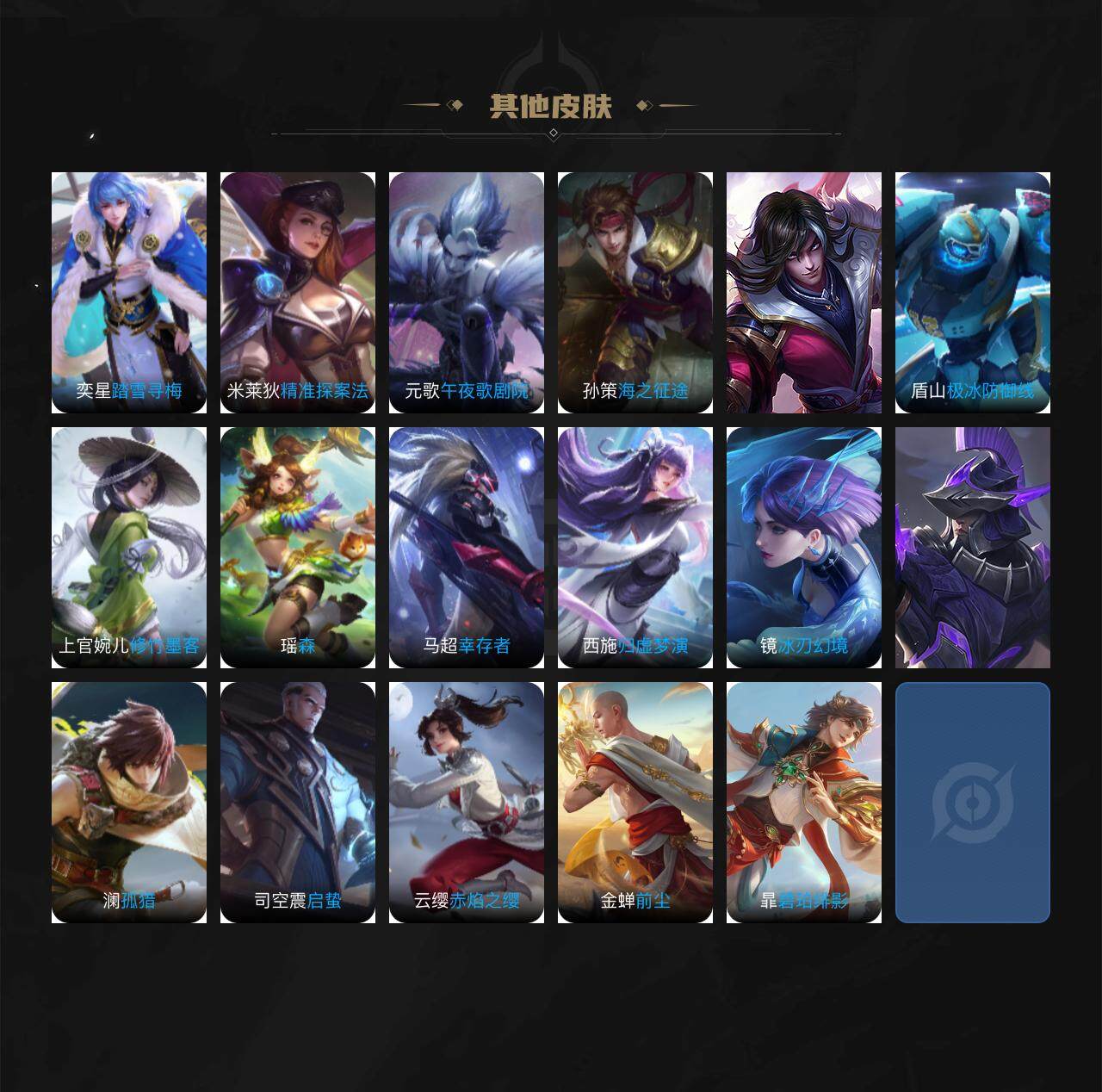 【赛季限定】:狄仁杰万华元夜,程咬金演武夺筹,张良古海寻踪,李元芳云中旅人,钟馗驱傩正仪,鬼谷子原初探秘者,苏烈千军破阵,裴擒虎擒涛扼浪,鲁班大师探海日志,桑启海盐诗旅,鬼谷子天穹祈灯,刘邦剑破天穹