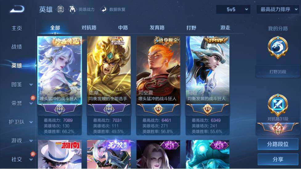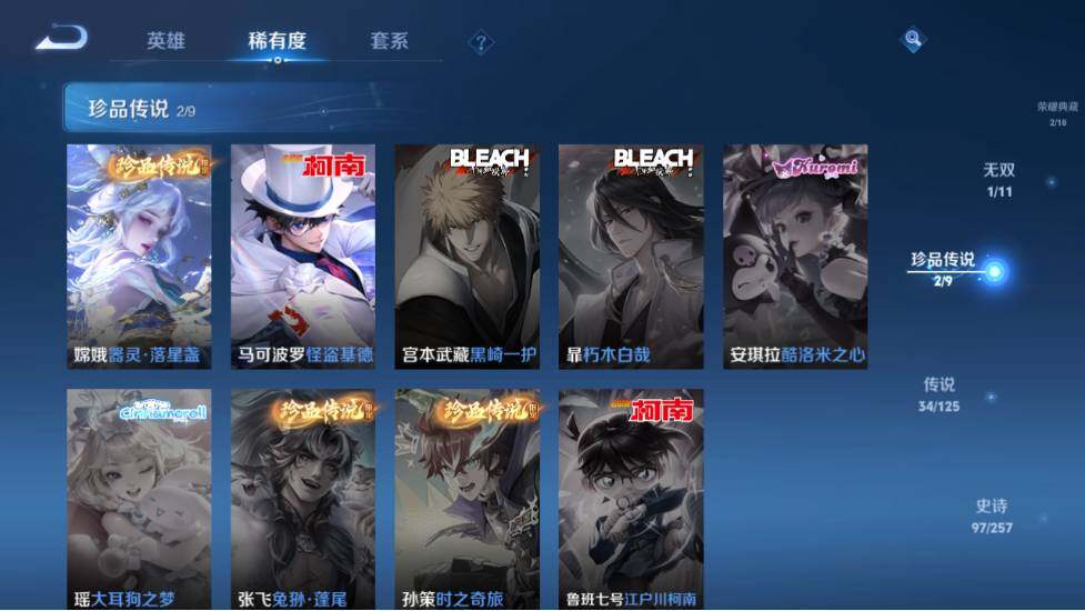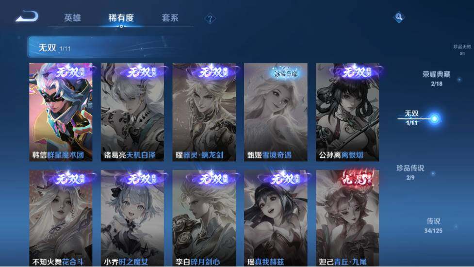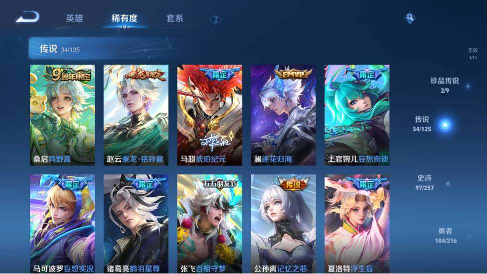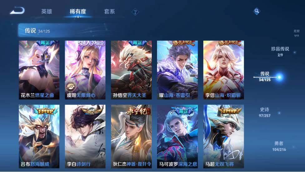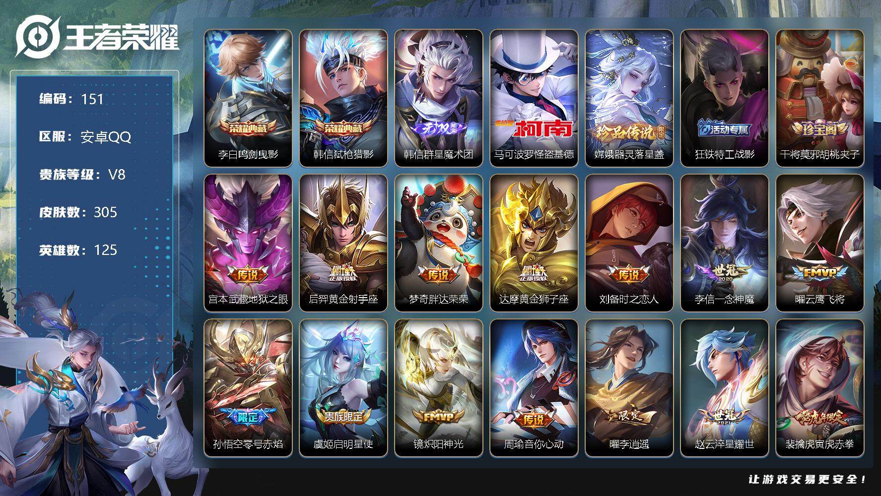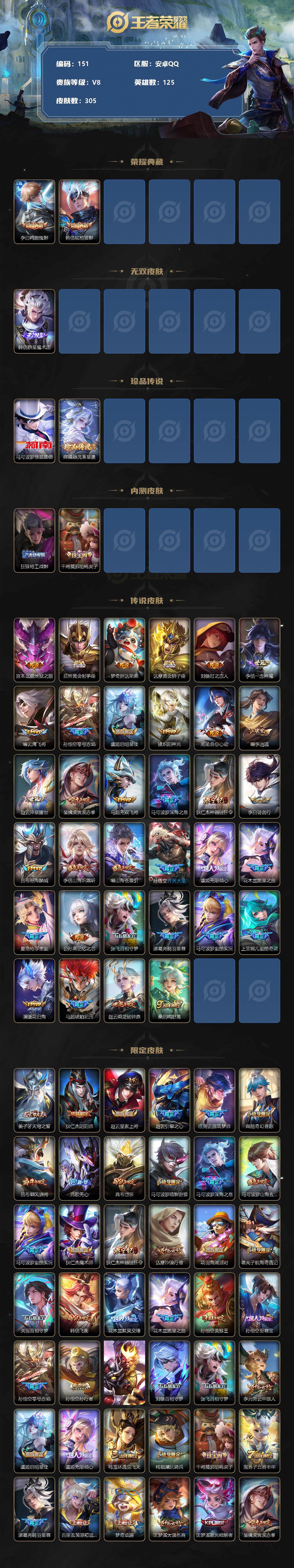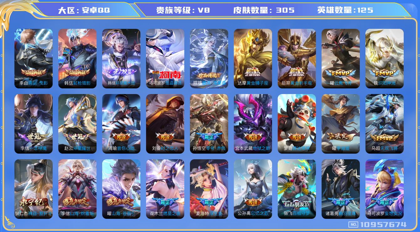 [10957674]【商品标题】:安卓Q-V8-至尊星耀IV段位-125英雄-305皮肤-2典藏-0珍品无双-1无双-2珍品传说-34传说-97史诗