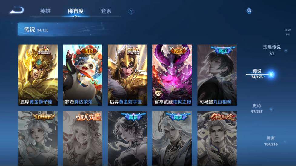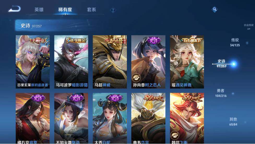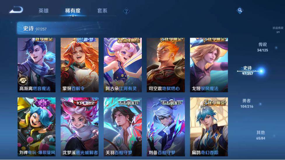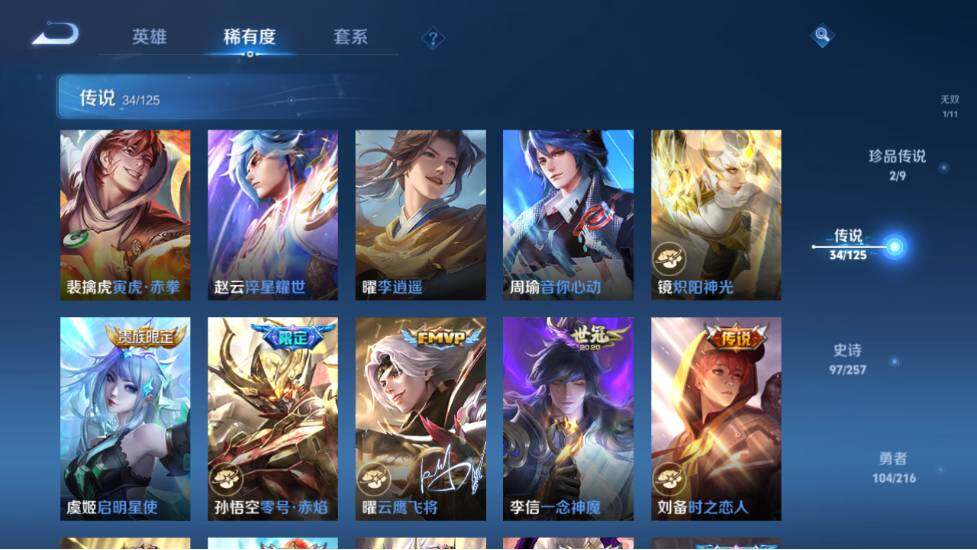 【传说皮肤】:宫本武藏地狱之眼,后羿黄金射手座,梦奇胖达荣荣,达摩黄金狮子座,刘备时之恋人,李信一念神魔,曜云鹰飞将,孙悟空零号赤焰,虞姬启明星使,镜炽阳神光,周瑜音你心动,曜李逍遥 ,赵云淬星耀世,裴擒虎寅虎赤拳,马超无双飞将,马可波罗深海之息,狄仁杰神器狴犴令,李白诗剑行,吕布怒海麟威,李信山海炽霜斩,曜山海苍雷引,孙悟空齐天大圣,虞姬无限倾心,花木兰燃星之曲,夏洛特浮生妄,公孙离记忆之芯,张飞百相守梦,诸葛亮鹤羽星尊,马可波罗妄想实况,上官婉儿妄想奇谈,澜逐花归海,马超琥珀纪元,赵云乘龙铭钟鼎,桑启鸣野蒿