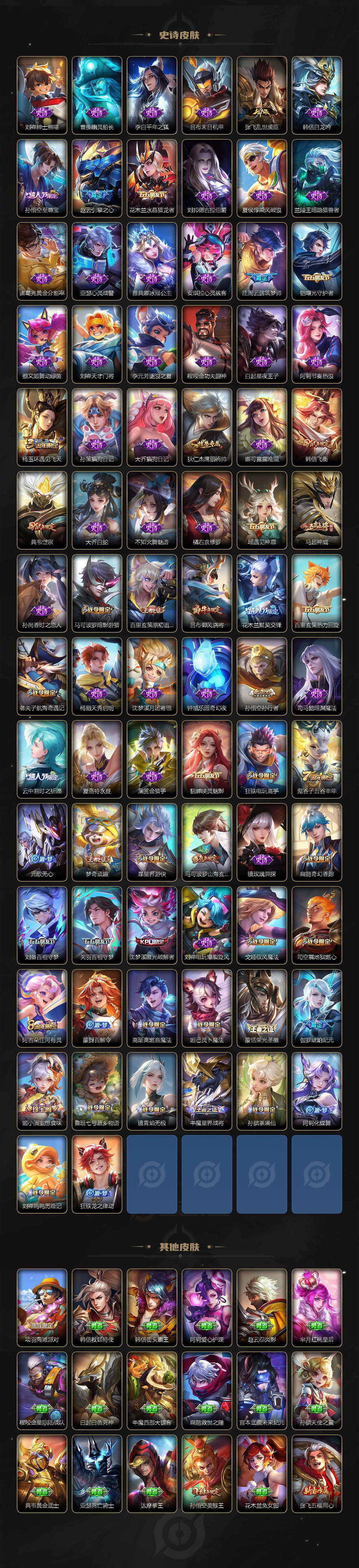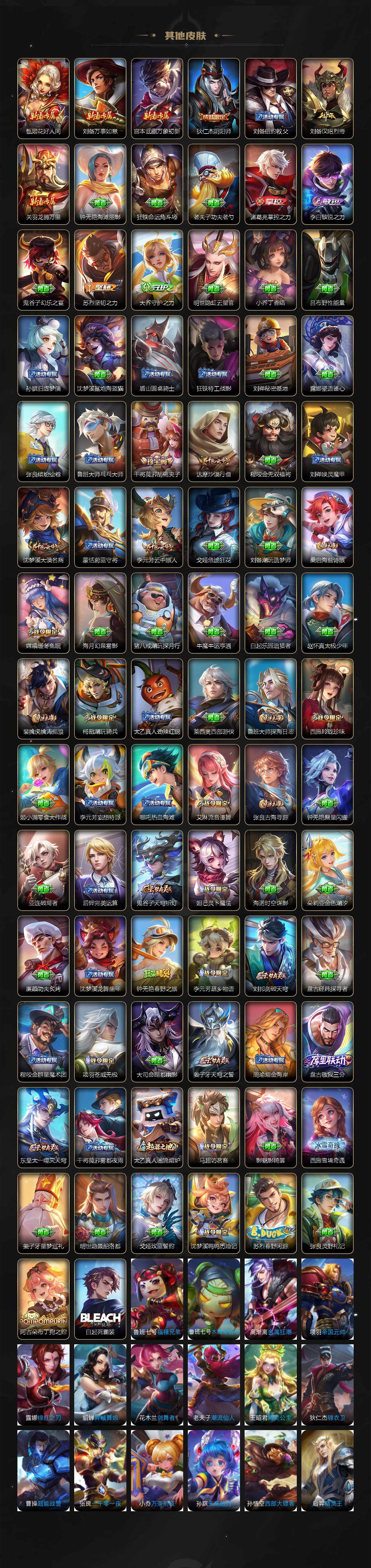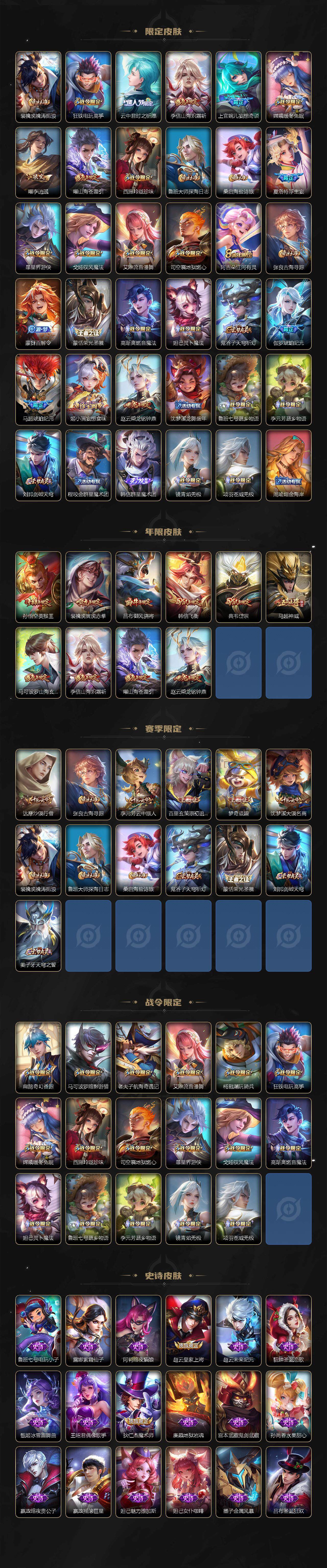 【限定皮肤】:姜子牙天穹之誓,狄仁杰阴阳师,赵云皇家上将,赵云引擎之心,庄周云端筑梦师,扁鹊奇幻香踪,吕布御风骁将,元歌无心,典韦岱宗,马可波罗暗影游猎,马可波罗深海之息,马可波罗山海玄木吟,马可波罗妄想实况,狄仁杰魔术师,狄仁杰神器狴犴令,达摩沙漠行僧,项羽海滩派对,老夫子航海奇遇记,关羽百相守梦,韩信飞衡,花木兰默契交锋,花木兰燃星之曲,孙悟空美猴王,孙悟空至尊宝,孙悟空零号赤焰,孙悟空孙行者,孙悟空齐天大圣,刘备百相守梦,张飞百相守梦,李元芳云中旅人,虞姬启明星使,虞姬无限倾心,杨玉环遇见飞天,杨戬潮玩骑兵,干将莫邪胡桃夹子,鬼谷子五谷丰年,诸葛亮鹤羽星尊,百里玄策原初追逐者,梦奇顽趣,沈梦溪大漠名商,沈梦溪匿光破解者,裴擒虎寅虎赤拳,裴擒虎擒涛扼浪,狂铁电玩高手,云中君时之祈愿,李信山海炽霜斩,上官婉儿妄想奇谈,嫦娥暖冬兔眠,曜李逍遥 ,曜山海苍雷引,西施玲珑珍味,鲁班大师探海日志,桑启海盐诗旅,夏洛特浮生妄,暃星界游侠,戈娅驭风魔法,艾琳流音漫舞,司空震地狱燃心,阿古朵江河有灵,张良古海寻踪,蒙犽百解令,蒙恬荣光圣徽,高渐离燃音魔法,妲己灵卜魔法,鬼谷子天穹祈灯,伽罗琥珀纪元,马超琥珀纪元,姬小满妄想食味,赵云乘龙铭钟鼎,沈梦溪龙舞盛年,鲁班七号蔬乡物语,李元芳蔬乡物语,刘邦剑破天穹,程咬金群星魔术团,韩信群星魔术团,镜青焰无极,项羽苍威无极,周瑜熔金海岸