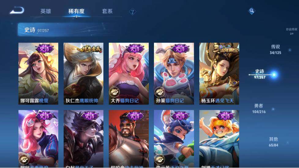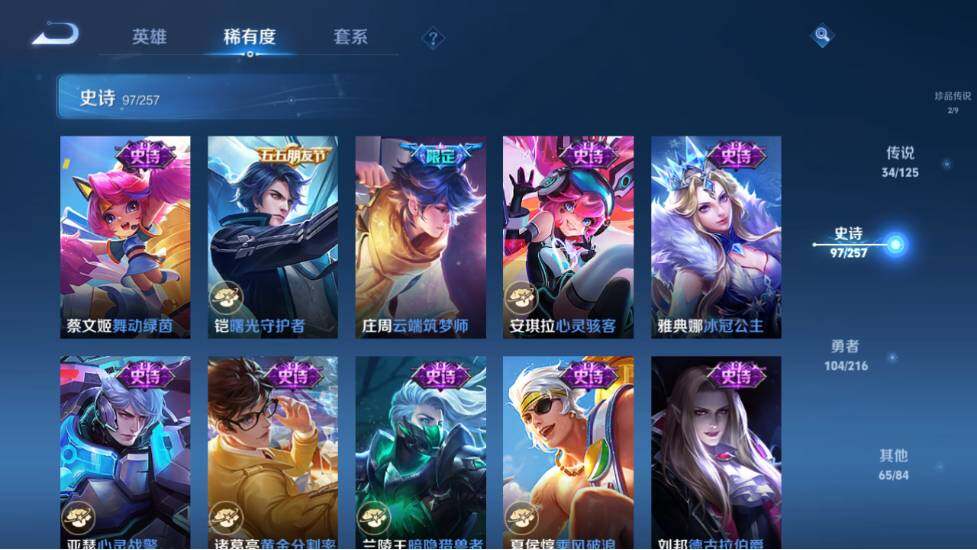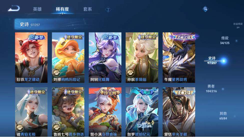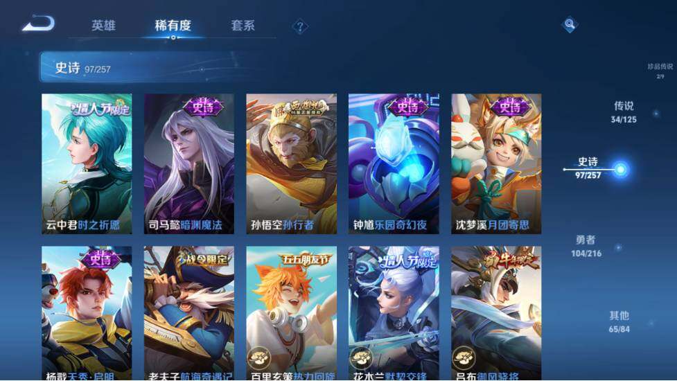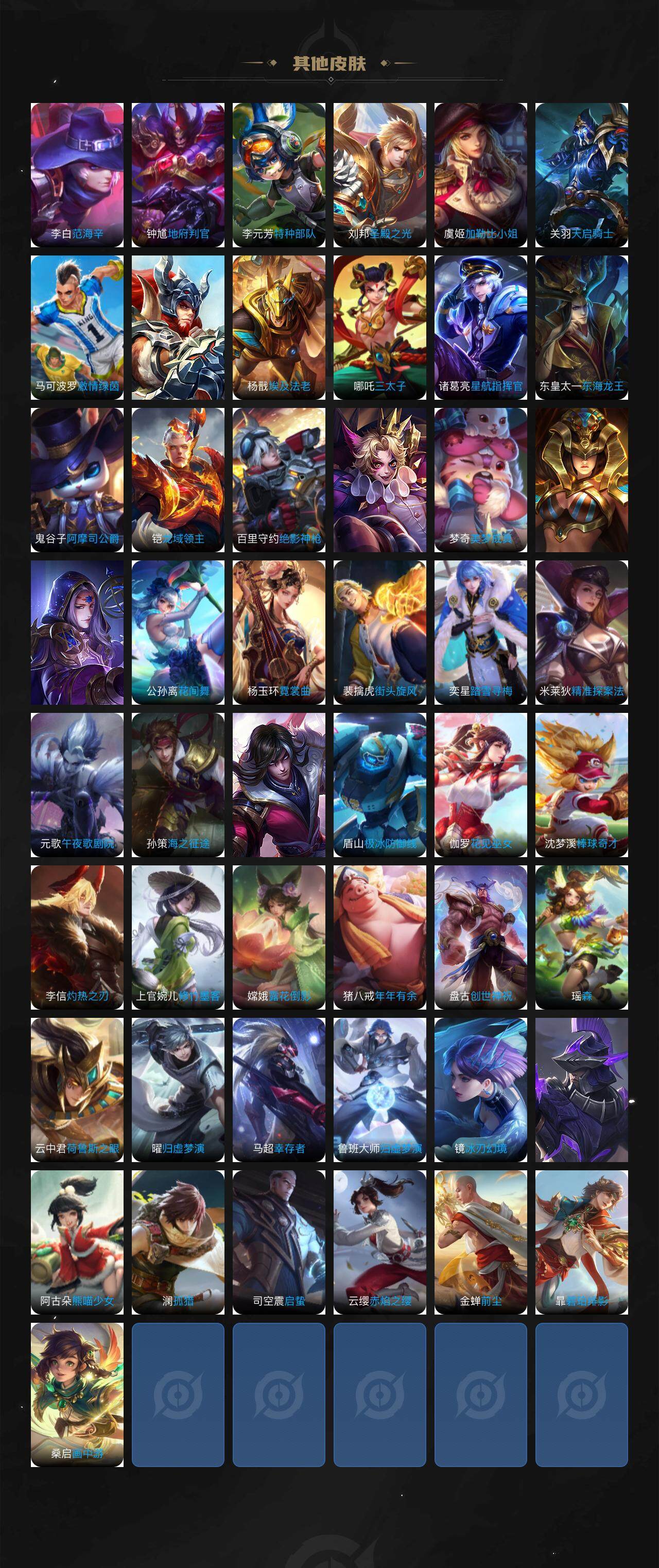 【限定皮肤】:姜子牙天穹之誓,狄仁杰阴阳师,赵云皇家上将,赵云引擎之心,庄周云端筑梦师,扁鹊奇幻香踪,吕布御风骁将,元歌无心,典韦岱宗,马可波罗暗影游猎,马可波罗深海之息,马可波罗山海玄木吟,马可波罗妄想实况,狄仁杰魔术师,狄仁杰神器狴犴令,达摩沙漠行僧,项羽海滩派对,老夫子航海奇遇记,关羽百相守梦,韩信飞衡,花木兰默契交锋,花木兰燃星之曲,孙悟空美猴王,孙悟空至尊宝,孙悟空零号赤焰,孙悟空孙行者,孙悟空齐天大圣,刘备百相守梦,张飞百相守梦,李元芳云中旅人,虞姬启明星使,虞姬无限倾心,杨玉环遇见飞天,杨戬潮玩骑兵,干将莫邪胡桃夹子,鬼谷子五谷丰年,诸葛亮鹤羽星尊,百里玄策原初追逐者,梦奇顽趣,沈梦溪大漠名商,沈梦溪匿光破解者,裴擒虎寅虎赤拳,裴擒虎擒涛扼浪,狂铁电玩高手,云中君时之祈愿,李信山海炽霜斩,上官婉儿妄想奇谈,嫦娥暖冬兔眠,曜李逍遥 ,曜山海苍雷引,西施玲珑珍味,鲁班大师探海日志,桑启海盐诗旅,夏洛特浮生妄,暃星界游侠,戈娅驭风魔法,艾琳流音漫舞,司空震地狱燃心,阿古朵江河有灵,张良古海寻踪,蒙犽百解令,蒙恬荣光圣徽,高渐离燃音魔法,妲己灵卜魔法,鬼谷子天穹祈灯,伽罗琥珀纪元,马超琥珀纪元,姬小满妄想食味,赵云乘龙铭钟鼎,沈梦溪龙舞盛年,鲁班七号蔬乡物语,李元芳蔬乡物语,刘邦剑破天穹,程咬金群星魔术团,韩信群星魔术团,镜青焰无极,项羽苍威无极,周瑜熔金海岸