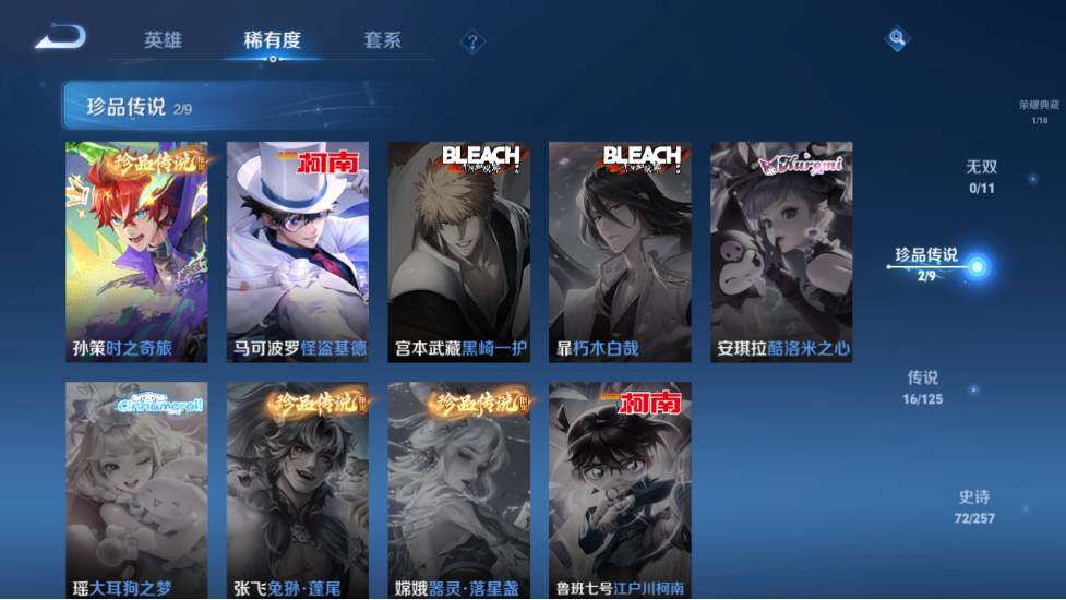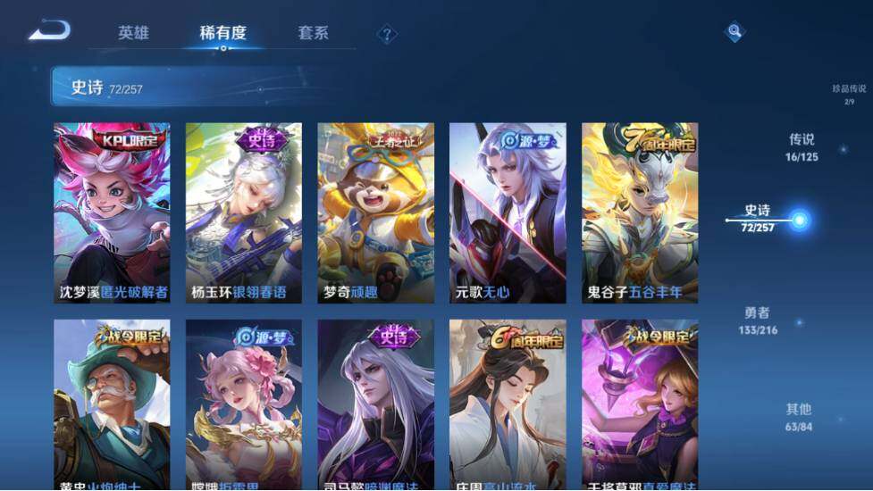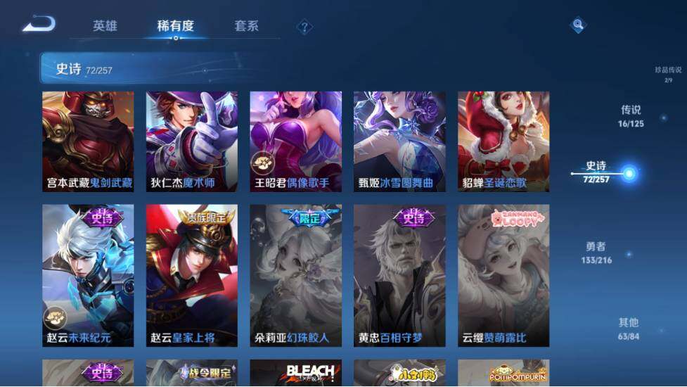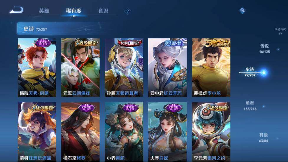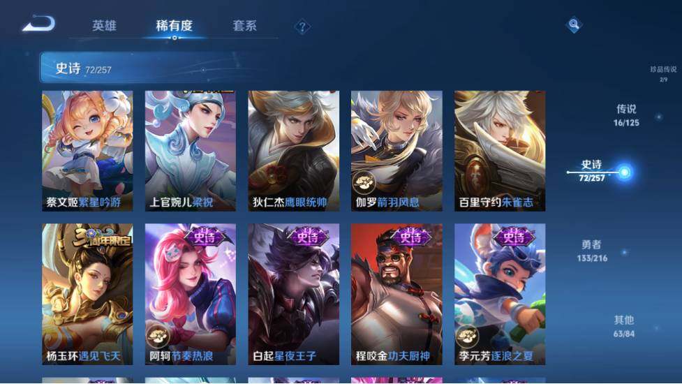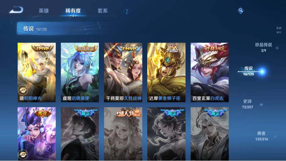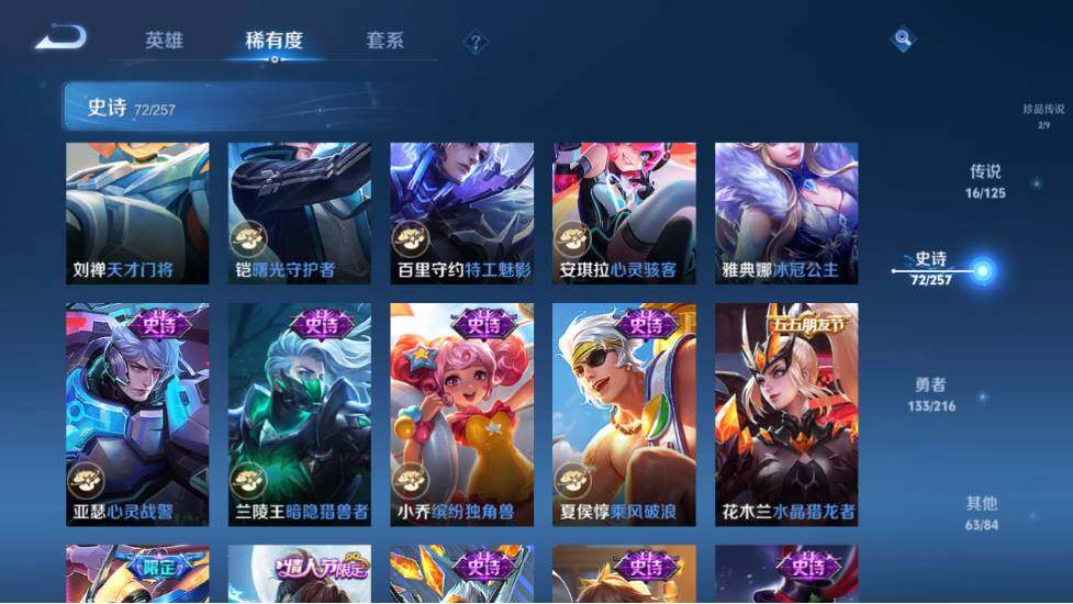 - PX_2091743-46 安卓QQ/尊贵铂金/226皮肤/123英雄/1典藏/0珍品无双/0无双/1珍品传说/7传说/59史诗/8稀有英雄 【1 珍品传说】怪盗基德 马可波罗, 【1 典藏皮肤】鸣剑·曳影 李白, 【7 传说皮肤】李逍遥 曜,地狱火 孙悟空,云鹰飞将 曜,神器·狴犴令 狄仁杰,挚爱之约 孙策,淬星耀世 赵云,鸣野蒿 桑启, 【59 史诗皮肤】白昼王子 嬴政,紫霞仙子 露娜,高山