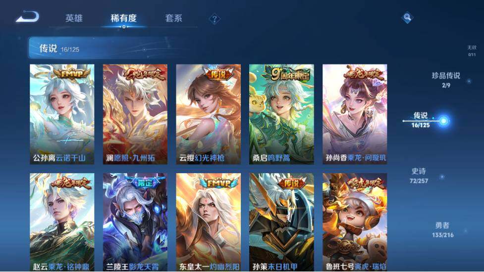 【传说皮肤】:貂蝉仲夏夜之梦,百里玄策白虎志,达摩黄金狮子座,干将莫邪久胜战神,虞姬启明星使,镜炽阳神光,鲁班七号寅虎瑞焰,孙策末日机甲,东皇太一灼幽烈阳,兰陵王影龙天霄,赵云乘龙铭钟鼎,孙尚香乘龙问璇玑,桑启鸣野蒿,云缨幻光神枪,澜愿照九州拓,公孙离云诺千山