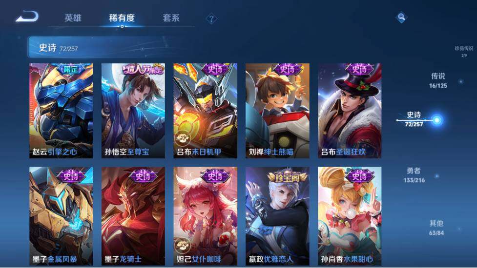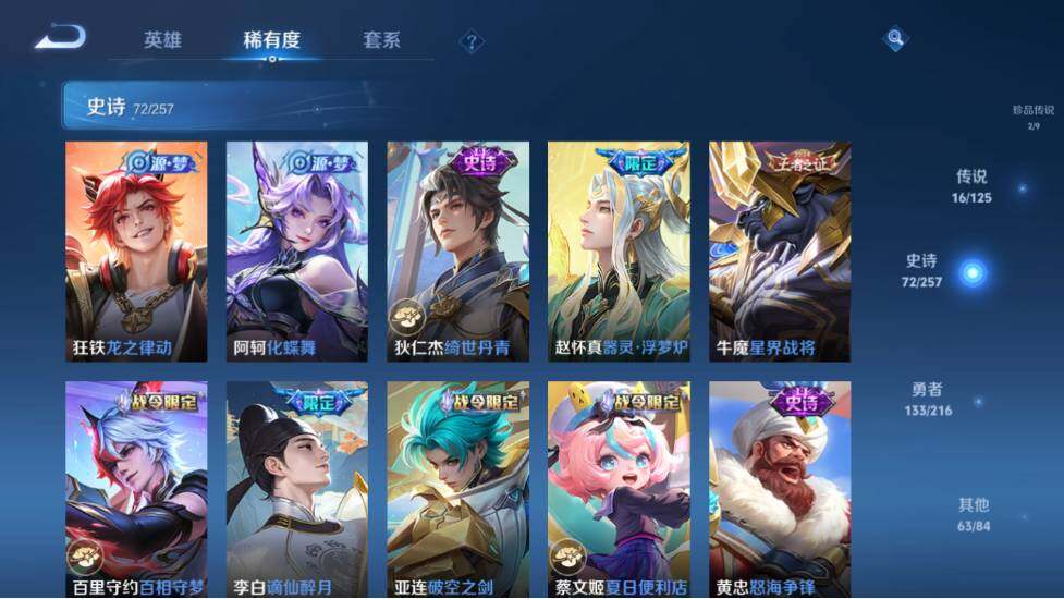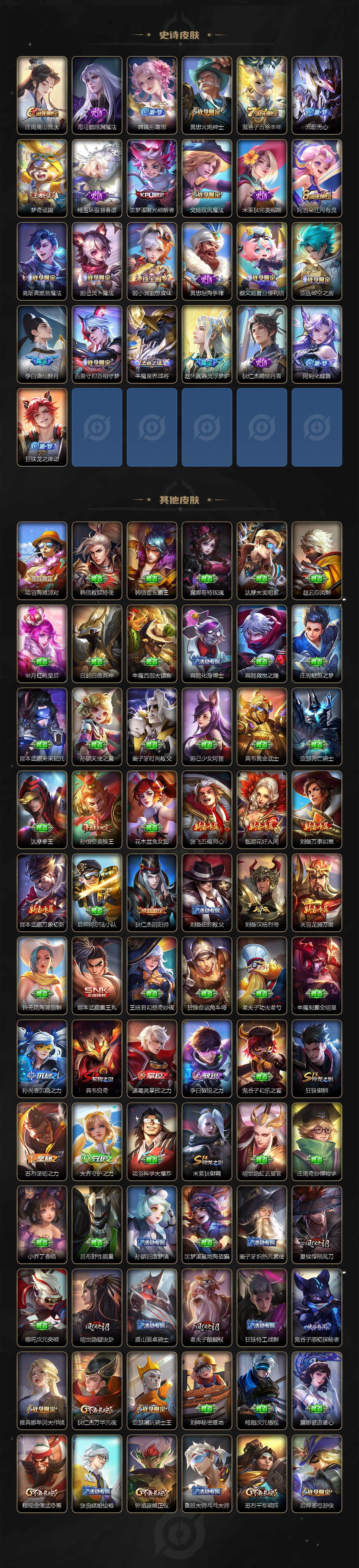 【限定皮肤】:蔡文姬夏日便利店,虞姬夏日便利店,姜子牙天穹之誓,李白谪仙醉月,狄仁杰阴阳师,赵云皇家上将,赵云引擎之心,嬴政优雅恋人,鲁班七号寅虎瑞焰,庄周高山流水,孙膑天狼运算者,白起夜都怪侠,芈月幻夜卜梦,元歌云间偶戏,元歌无心,夏侯惇朔风刀,典韦穷奇,狄仁杰魔术师,狄仁杰万华元夜,达摩沙漠行僧,项羽海滩派对,老夫子醍醐杖,程咬金演武夺筹,兰陵王影龙天霄,兰陵王金庭之子,亚瑟潮玩骑士王,孙悟空美猴王,孙悟空至尊宝,后羿圣弓游侠,李元芳银河之约,李元芳云中旅人,虞姬启明星使,钟馗驱傩正仪,杨玉环遇见飞天,干将莫邪真爱魔法,雅典娜单词大作战,蔡文姬繁星吟游,鬼谷子原初探秘者,鬼谷子五谷丰年,黄忠火炮绅士,苏烈千军破阵,百里玄策白虎志,百里守约朱雀志,梦奇顽趣,沈梦溪大漠名商,沈梦溪匿光破解者,明世隐疑决卦,裴擒虎李小龙,裴擒虎擒涛扼浪,狂铁御狮,米莱狄御霄,云中君纤云弄巧,上官婉儿梁祝,嫦娥拒霜思,西施玲珑珍味,蒙犽狂想玩偶喵,鲁班大师探海日志,桑启海盐诗旅,戈娅驭风魔法,艾琳流音漫舞,阿古朵江河有灵,张良古海寻踪,高渐离燃音魔法,妲己灵卜魔法,鬼谷子天穹祈灯,姬小满妄想食味,孙尚香乘龙问璇玑,赵云乘龙铭钟鼎,沈梦溪龙舞盛年,刘邦剑破天穹,程咬金群星魔术团,周瑜熔金海岸