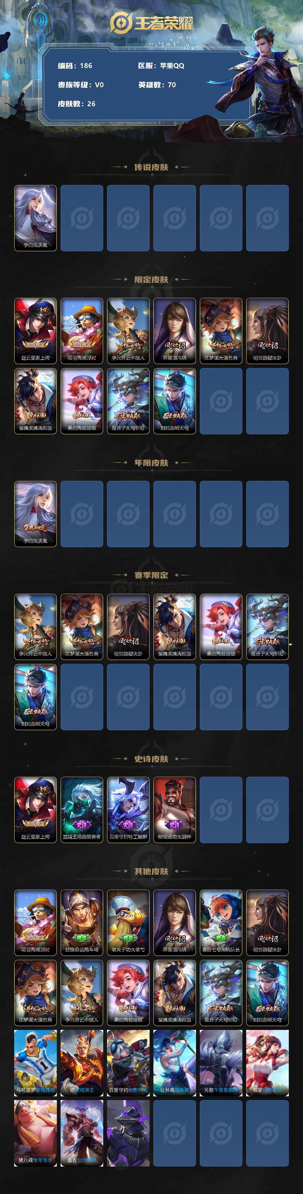 - PX_2095380-92 安卓QQ/永恒钻石/170皮肤/122英雄/0典藏/0珍品无双/1无双/0珍品传说/11传说/40史诗/7稀有英雄 【1 无双皮肤】器灵·螭龙剑 曜, 【11 传说皮肤】逐花归海 澜,浮生妄 夏洛特,地狱之眼 宫本武藏,祈雪灵祝 公孙离,末日机甲 孙尚香,末日机甲 孙策,一念神魔 李信,战鼓燎原 典韦,妄想实况 马可波罗,愿照·九州拓 澜,鸣野蒿 桑启, 【40 史诗皮