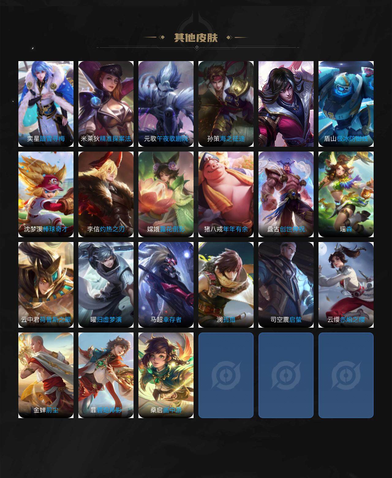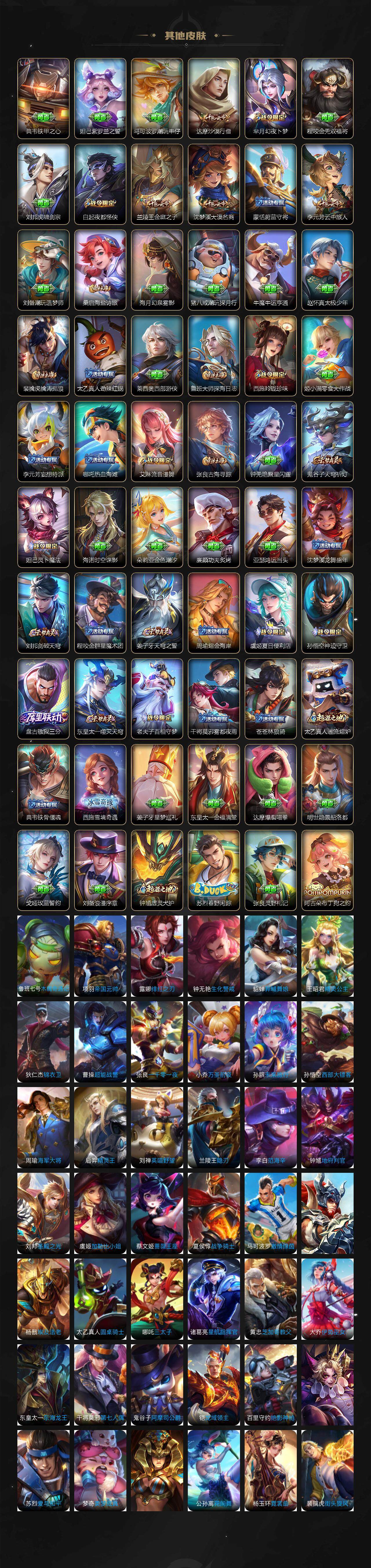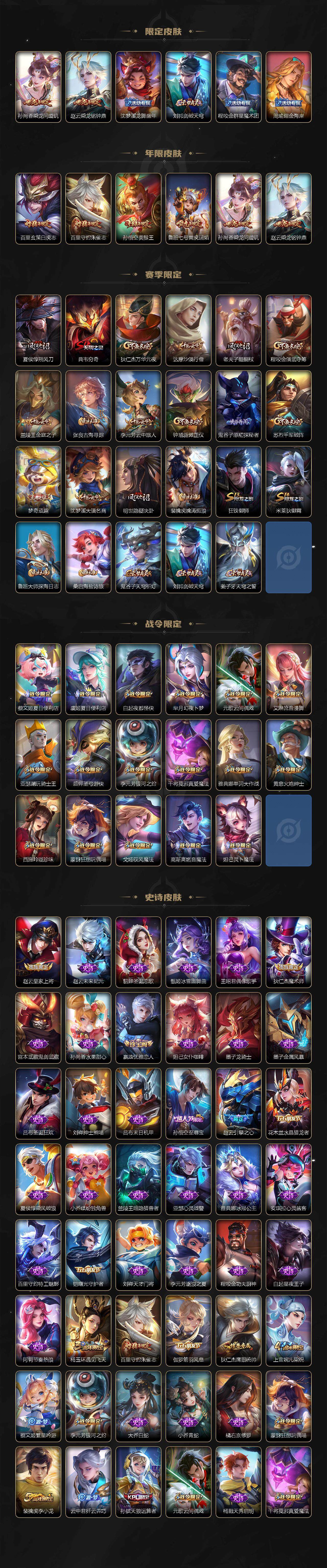 【赛季限定】:夏侯惇朔风刀,典韦穷奇,狄仁杰万华元夜,达摩沙漠行僧,老夫子醍醐杖,程咬金演武夺筹,兰陵王金庭之子,张良古海寻踪,李元芳云中旅人,钟馗驱傩正仪,鬼谷子原初探秘者,苏烈千军破阵,梦奇顽趣,沈梦溪大漠名商,明世隐疑决卦,裴擒虎擒涛扼浪,狂铁御狮,米莱狄御霄,鲁班大师探海日志,