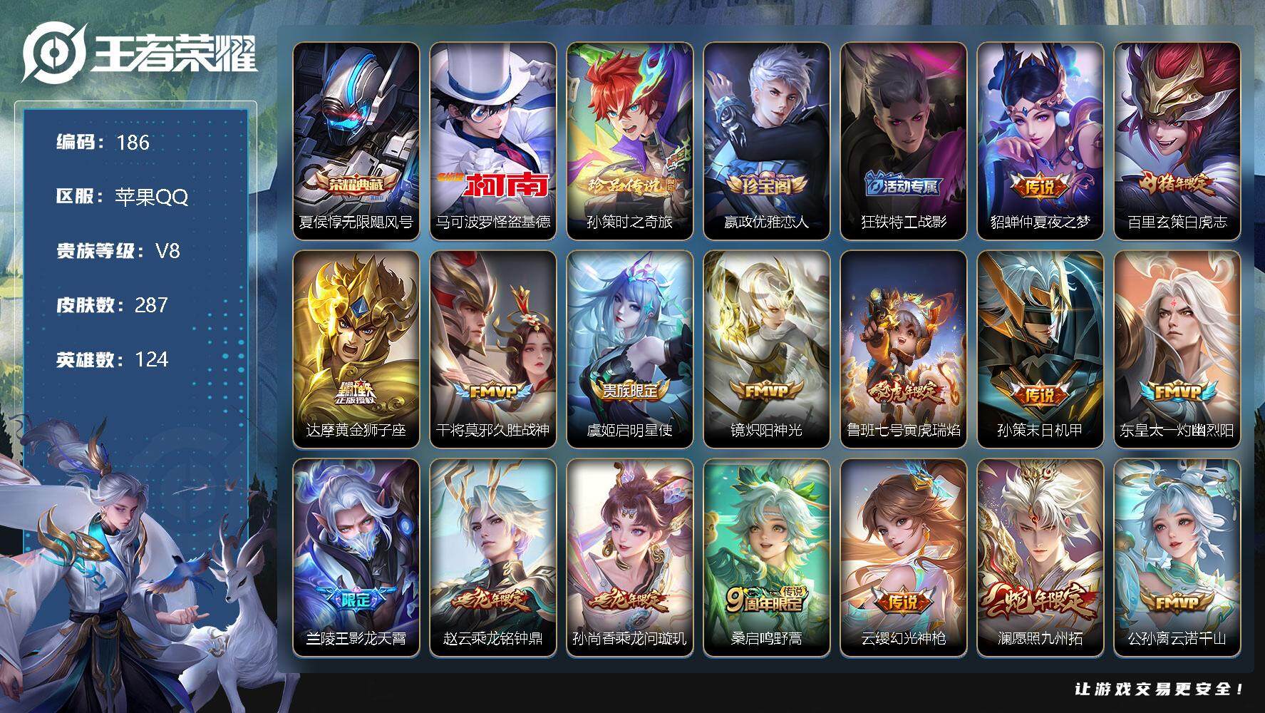 [10957731]【商品标题】:苹果Q-V5-永恒钻石II段位-124英雄-287皮肤-1典藏-0珍品无双-0无双-2珍品传说-16传说-72史诗