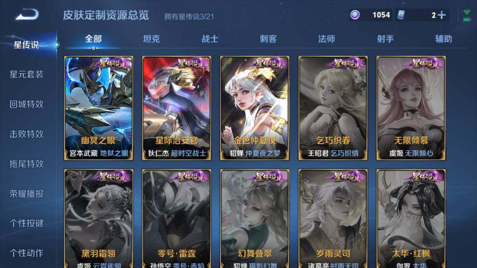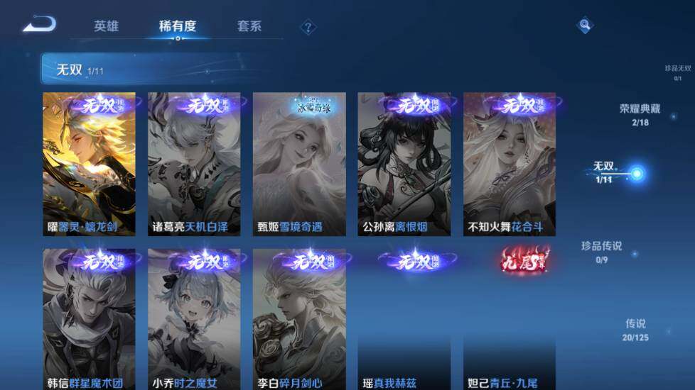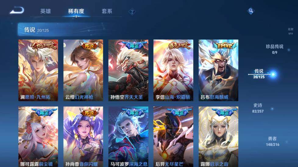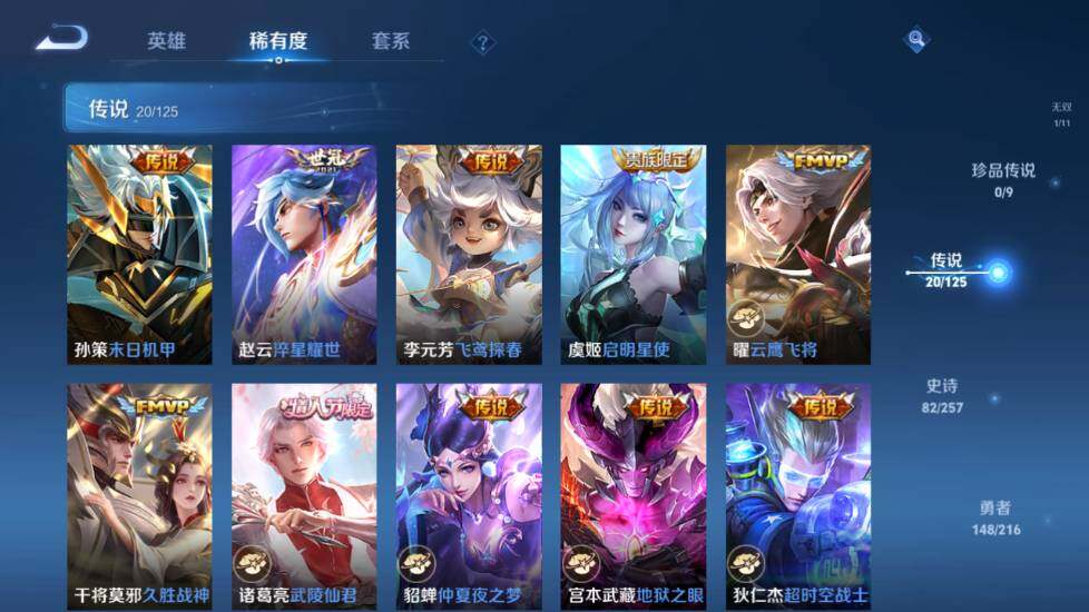 【传说皮肤】:狄仁杰超时空战士,宫本武藏地狱之眼,貂蝉仲夏夜之梦,诸葛亮武陵仙君,干将莫邪久胜战神,曜云鹰飞将,虞姬启明星使,李元芳飞鸢探春,赵云淬星耀世,孙策末日机甲,露娜启示之音,后羿无尽星芒,马可波罗深海之息,孙尚香音你闪耀,娜可露露前尘镜,吕布怒海麟威,李信山海炽霜斩,孙悟空齐天大圣,云缨幻光神枪,澜愿照九州拓