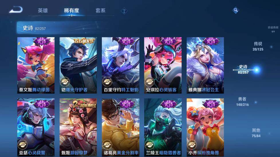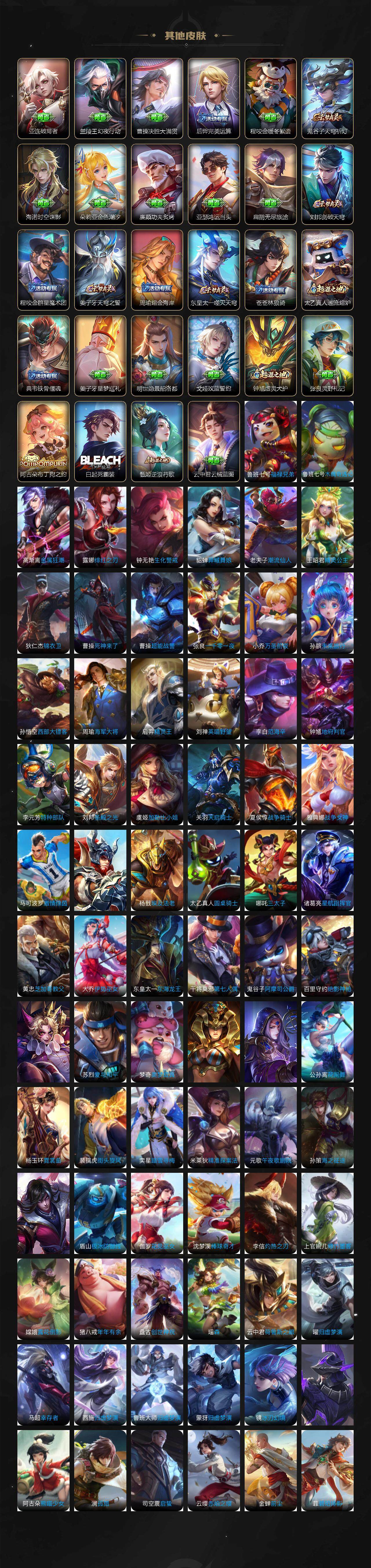 李元芳逐浪之夏,孙策猫狗日记,露娜紫霞仙子,诸葛亮黄金分割率,王昭君偶像歌手,韩信白龙吟,项羽苍穹之光,孙尚香时之恋人,阿轲暗夜猫娘,雅典娜冰冠公主,吕布末日机甲,鲁班七号电玩小子,橘右京修罗,墨子龙骑士,嬴政摇滚巨星,刘禅绅士熊喵,刘禅天才门将,白起星夜王子,安琪拉心灵骇客,刘邦德古拉伯爵,兰陵王暗隐猎兽者,曹操幽灵船长,宫本武藏鬼剑武藏,亚瑟心灵战警,蔡文姬舞动绿茵,廉颇地狱岩魂,小乔缤纷独角兽,夏侯惇乘风破浪,花木兰水晶猎龙者,铠曙光守护者,墨子金属风暴,百里玄策原初追逐者,吕布圣诞狂欢,貂蝉圣诞恋歌,百里守约特工魅影,嫦娥拒霜思,雅典娜黎明之约,李白千年之狐,澜赏金猎手,艾琳奇遇舞章,刘禅电玩·爆裂旋风,李白谪仙醉月,赵怀真器灵·浮梦炉