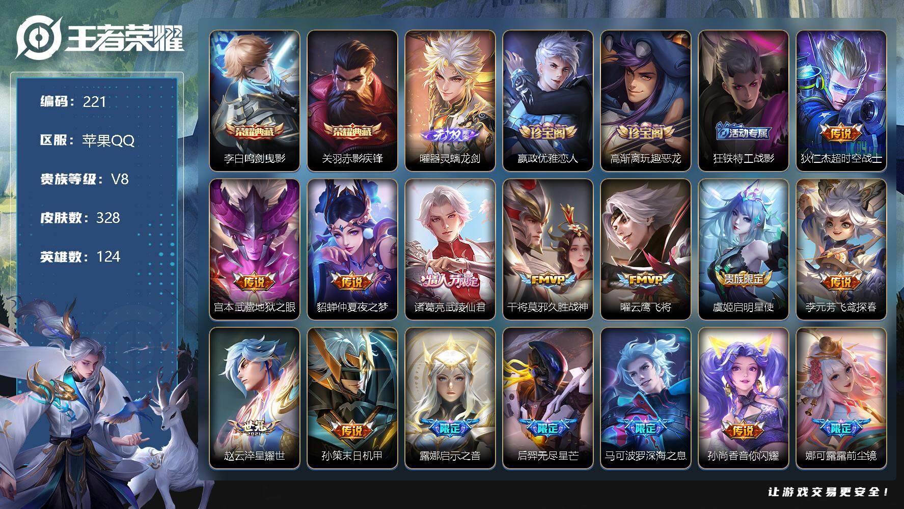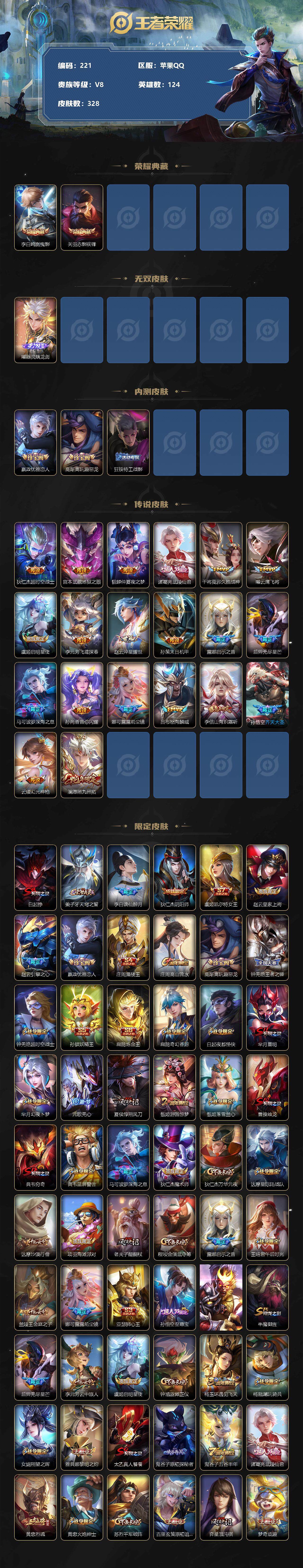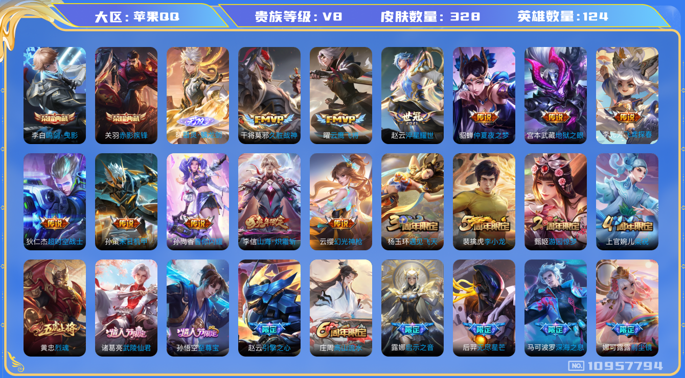 [10957794]【商品标题】:苹果Q-V8-最强王者段位-124英雄-328皮肤-2典藏-0珍品无双-1无双-0珍品传说-20传说-82史诗