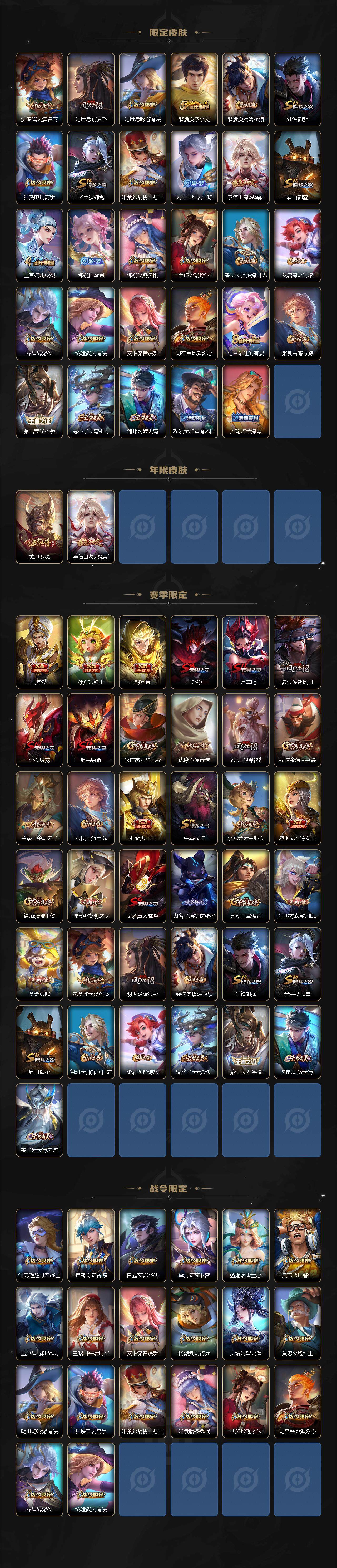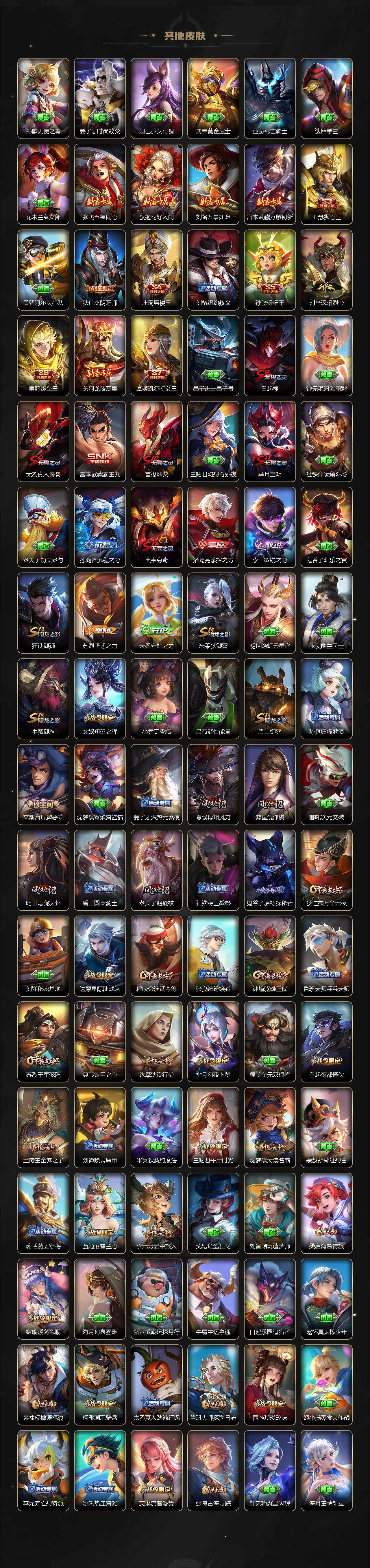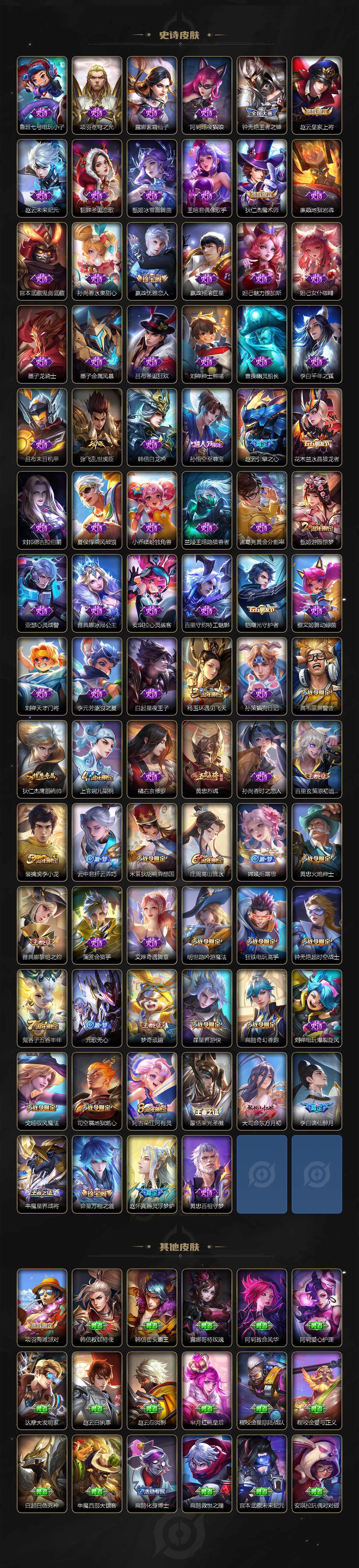【限定皮肤】:白起狰,姜子牙天穹之誓,李白谪仙醉月,狄仁杰阴阳师,虞姬凯尔特女王,赵云皇家上将,赵云引擎之心,嬴政优雅恋人,庄周蜃楼王,庄周高山流水,高渐离玩趣恶龙,钟无艳王者之锤,钟无艳超时空战士,孙膑妖精王,扁鹊炼金王,扁鹊奇幻香踪,白起夜都怪侠,芈月重明,芈月幻夜卜梦,元歌无心,夏侯惇朔风刀,甄姬游园惊梦,甄姬落雪兰心,曹操烛龙,典韦穷奇,典韦蓝屏警告,马可波罗深海之息,狄仁杰魔术师,狄仁杰万华元夜,达摩星际陆战队,达摩沙漠行僧,项羽海滩派对,老夫子醍醐杖,程咬金演武夺筹,露娜启示之音,王昭君午后时光,兰陵王金庭之子,娜可露露前尘镜,亚瑟狮心王,孙悟空至尊宝,孙悟空齐天大圣,牛魔御旌,后羿无尽星芒,李元芳云中旅人,虞姬启明星使,钟馗驱傩正仪,杨玉环遇见飞天,杨戬潮玩骑兵,女娲朔望之晖,雅典娜黎明之约,太乙真人饕餮,鬼谷子原初探秘者,鬼谷子五谷丰年,诸葛亮武陵仙君,黄忠烈魂,黄忠火炮绅士,苏烈千军破阵,百里玄策原初追逐者,弈星混沌棋,梦奇顽趣,沈梦溪大漠名商,明世隐疑决卦,明世隐吟游魔法,裴擒虎李小龙,裴擒虎擒涛扼浪,狂铁御狮,狂铁电玩高手,米莱狄御霄,米莱狄胡桃异想国,云中君纤云弄巧,李信山海炽霜斩,盾山御銮,上官婉儿梁祝,嫦娥拒霜思,嫦娥暖冬兔眠,西施玲珑珍味,鲁班大师探海日志,桑启海盐诗旅,暃星界游侠,戈娅驭风魔法,艾琳流音漫舞,司空震地狱燃心,阿古朵江河有灵,张良古海寻踪,蒙恬荣光圣徽,鬼谷子天穹祈灯,刘邦剑破天穹,程咬金群星魔术团,周瑜熔金海岸