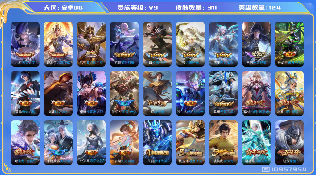 [10957954]【商品标题】:安卓Q-V9-至尊星耀IV段位-124英雄-311皮肤-2典藏-0珍品无双-0无双-0珍品传说-29传说-104史诗
