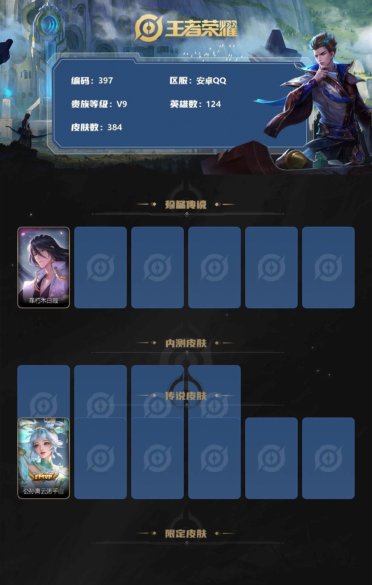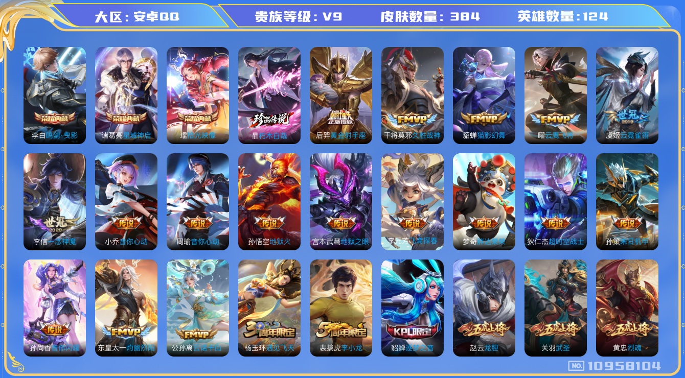 [10958104]【商品标题】:安卓Q-V9-至尊星耀IV段位-124英雄-384皮肤-3典藏-0珍品无双-0无双-1珍品传说-31传说-131史诗