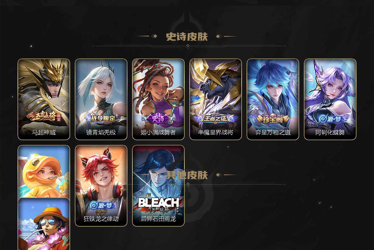 裴擒虎李小龙,貂蝉逐梦之音,赵云龙胆,关羽武圣,黄忠烈魂,张飞虎魄,马超神威,伽罗太华,裴擒虎天狼狩猎者,花木兰瑞麟志,苏烈玄武志,项羽霸王别姬,小乔纯白花嫁,孙悟空大圣娶亲,露娜一生所爱,花木兰默契交锋,兰陵王默契交锋,孙悟空至尊宝,妲己时之彼端,猪八戒猪悟能,廉颇寅虎·御盾,甄姬女儿国国王,镜匿光追影者,韩信傲雪梅枪,鲁班七号寅虎·瑞焰,孙膑寅虎·展翼,杨玉环寅虎·心曲,裴擒虎寅虎·赤拳,云中君时之祈愿,瑶时之祈愿,女娲补天,马可波罗深海之息,金蝉唐三藏,娜可露露前尘镜,橘右京枫霜尽,王昭君星穹之声,上官婉儿神器·万象笔,盾山梦圆繁星,西施至美·乘鲤谣