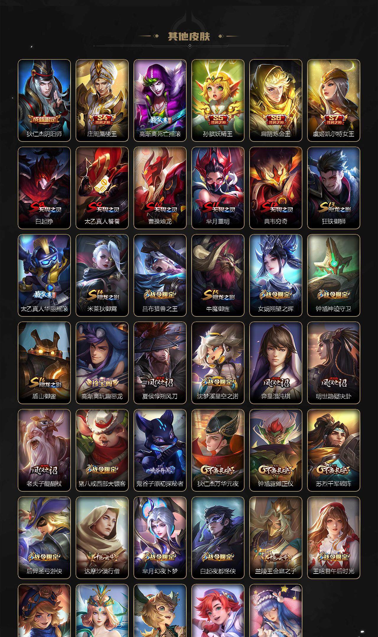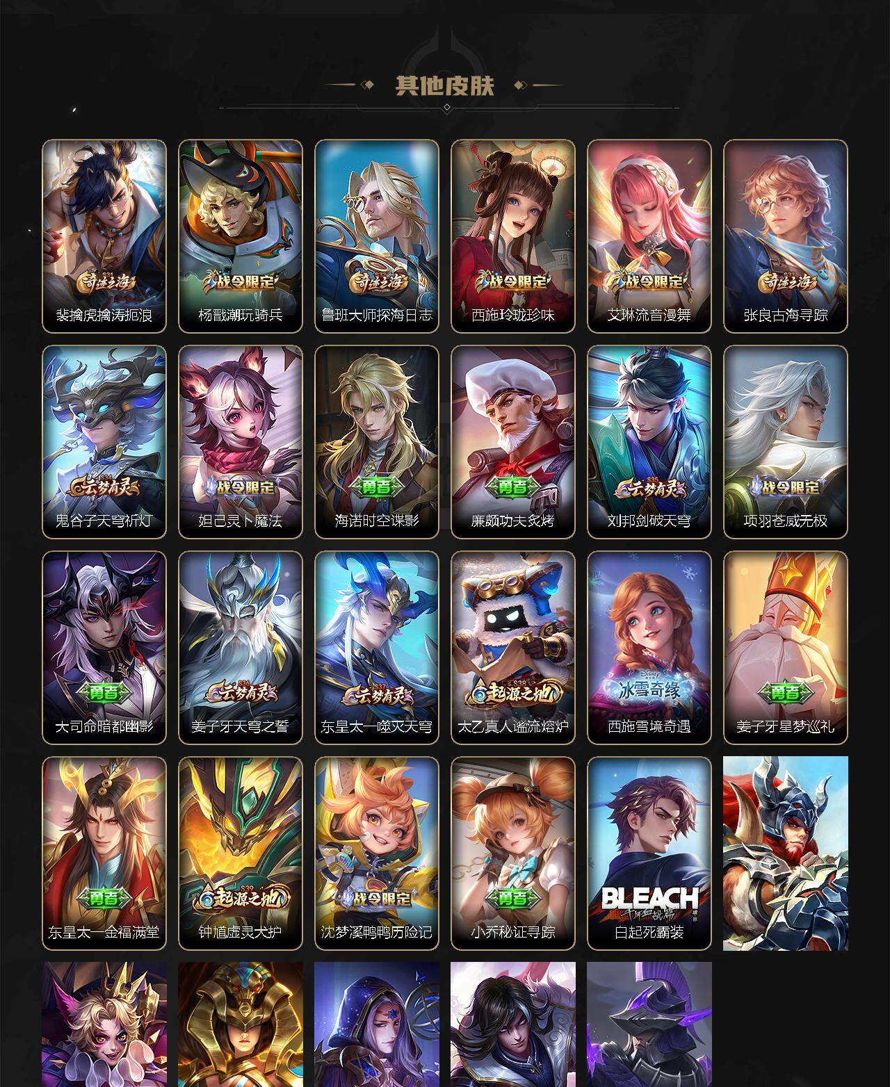 【限定皮肤】:白起狰,姜子牙天穹之誓,狄仁杰阴阳师,小乔纯白花嫁,虞姬凯尔特女王,廉颇寅虎御盾,赵云皇家上将,赵云龙胆,妲己时之彼端,嬴政白昼王子,鲁班七号狮舞东方,鲁班七号寅虎瑞焰,庄周蜃楼王,庄周高山流水,高渐离死亡摇滚,高渐离玩趣恶龙,钟无艳超时空战士,孙膑妖精王,孙膑寅虎展翼,扁鹊炼金王,扁鹊奇幻香踪,白起夜都怪侠,芈月重明,芈月幻夜卜梦,吕布猎兽之王,元歌无心,夏侯惇朔风刀,甄姬女儿国国王,甄姬落雪兰心,曹操烛龙,典韦穷奇,典韦蓝屏警告,马可波罗暗影游猎,马可波罗深海之息,狄仁杰魔术师,狄仁杰万华元夜,达摩沙漠行僧,项羽海滩派对,项羽霸王别姬,老夫子醍醐杖,关羽武圣,貂蝉逐梦之音,露娜一生所爱,韩信傲雪梅枪,王昭君午后时光,王昭君星穹之声,兰陵王默契交锋,兰陵王金庭之子,花木兰瑞麟志,花木兰默契交锋,娜可露露前尘镜,橘右京枫霜尽,孙悟空至尊宝,孙悟空大圣娶亲,孙悟空齐天大圣,牛魔御旌,后羿圣弓游侠,刘备百相守梦,张飞虎魄,李元芳银河之约,李元芳云中旅人,虞姬启明星使,钟馗神迹守卫,钟馗驱傩正仪,杨玉环遇见飞天,杨玉环寅虎心曲,杨戬潮玩骑兵,女娲朔望之晖,女娲补天,干将莫邪真爱魔法,雅典娜黎明之约,蔡文姬繁星吟游,太乙真人饕餮,太乙真人华丽摇滚,鬼谷子原初探秘者,鬼谷子五谷丰年,黄忠烈魂,黄忠火炮绅士,苏烈玄武志,苏烈千军破阵,百里玄策原初追逐者,弈星混沌棋,梦奇顽趣,沈梦溪星空之诺,沈梦溪大漠名商,沈梦溪匿光破解者,明世隐疑决卦,明世隐