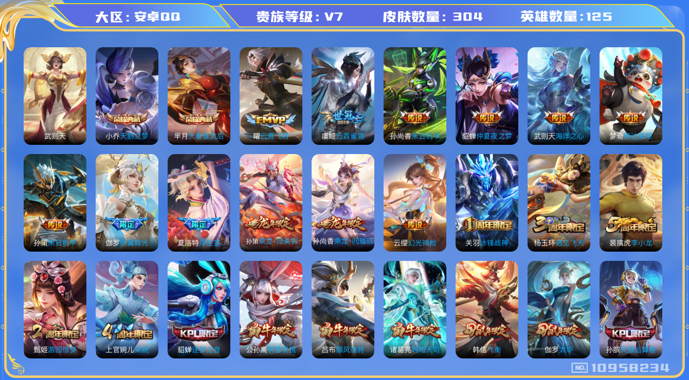 [10958234]【商品标题】:安卓Q-V7-至尊星耀III段位-125英雄-304皮肤-2典藏-0珍品无双-0无双-0珍品传说-20传说-95史诗