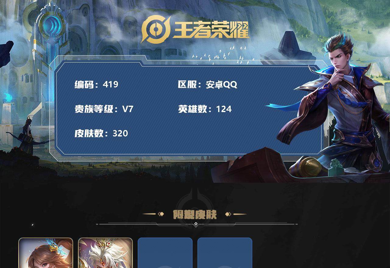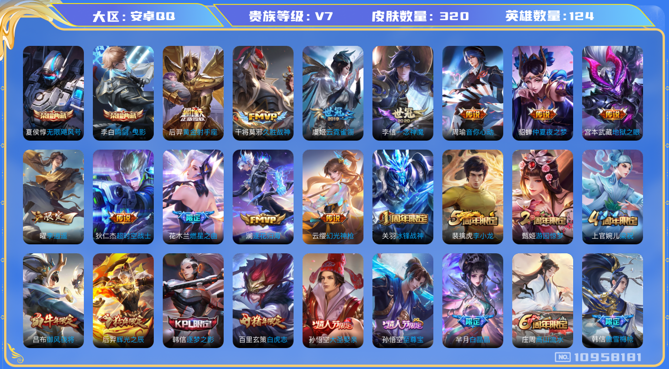 [10958181]【商品标题】:安卓Q-V7-永恒钻石II段位-124英雄-320皮肤-2典藏-0珍品无双-0无双-0珍品传说-16传说-104史诗