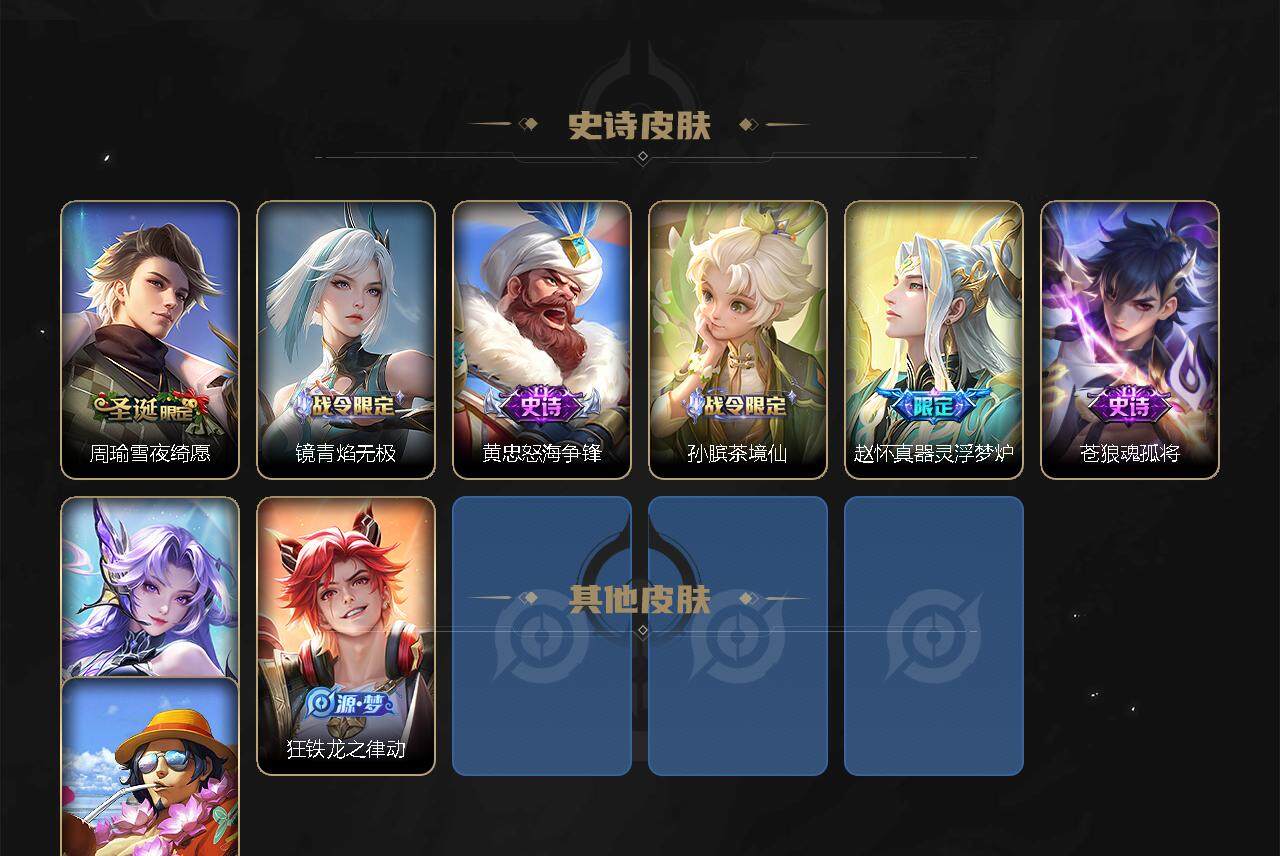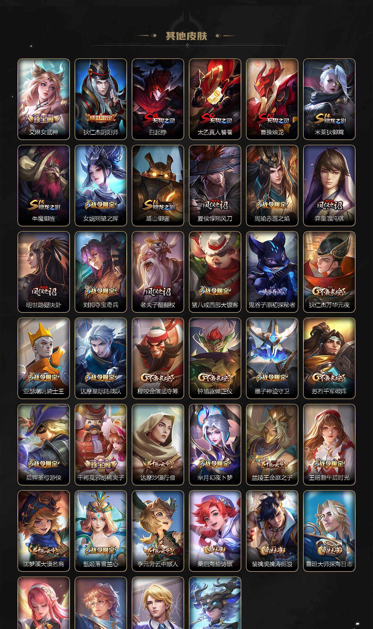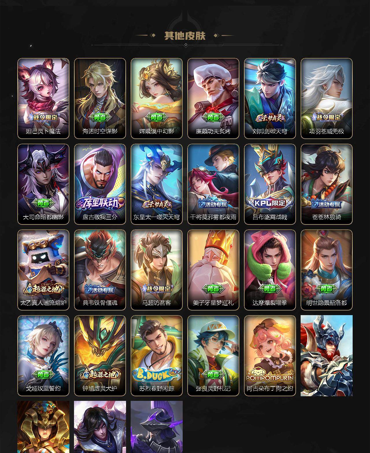 【限定皮肤】:白起狰,杨戬破阵退雄兵,狄仁杰阴阳师,赵云皇家上将,墨子神迹守卫,庄周高山流水,阿轲迷踪丽影,钟无艳王者之锤,钟无艳超时空战士,芈月白晶晶,芈月幻夜卜梦,吕布御风骁将,周瑜赤莲之焰,元歌云间偶戏,元歌无心,夏侯惇朔风刀,甄姬游园惊梦,甄姬落雪兰心,曹操烛龙,典韦蓝屏警告,马可波罗暗影游猎,马可波罗山海玄木吟,狄仁杰魔术师,狄仁杰万华元夜,达摩星际陆战队,达摩沙漠行僧,项羽海滩派对,老夫子醍醐杖,老夫子航海奇遇记,关羽冰锋战神,程咬金演武夺筹,刘邦夺宝奇兵,韩信逐梦之影,韩信傲雪梅枪,王昭君午后时光,兰陵王驯魔猎人,兰陵王金庭之子,花木兰燃星之曲,亚瑟潮玩骑士王,孙悟空至尊宝,孙悟空大圣娶亲,牛魔御旌,后羿辉光之辰,后羿圣弓游侠,李元芳云中旅人,虞姬启明星使,钟馗驱傩正仪,女娲朔望之晖,干将莫邪胡桃夹子,干将莫邪真爱魔法,太乙真人饕餮,鬼谷子原初探秘者,鬼谷子五谷丰年,黄忠火炮绅士,苏烈千军破阵,百里玄策白虎志,弈星混沌棋,沈梦溪大漠名商,明世隐疑决卦,裴擒虎李小龙,裴擒虎擒涛扼浪,狂铁电玩高手,米莱狄御霄,米莱狄胡桃异想国,云中君纤云弄巧,云中君时之祈愿,盾山御銮,猪八戒西部大镖客,上官婉儿梁祝,嫦娥拒霜思,曜李逍遥 ,鲁班大师探海日志,桑启海盐诗旅,暃星界游侠,艾琳女武神,艾琳流音漫舞,司空震地狱燃心,阿古朵江河有灵,张良古海寻踪,蒙犽百解令,高渐离燃音魔法,妲己灵卜魔法,鬼谷子天穹祈灯,伽罗琥珀纪元,姬小满妄想食味,沈梦溪龙舞盛年,鲁班七号蔬乡物语,李元芳蔬乡物语,刘邦剑破天穹,程咬金群星魔术团,镜青焰无极,项羽苍威无极,周瑜熔金海岸