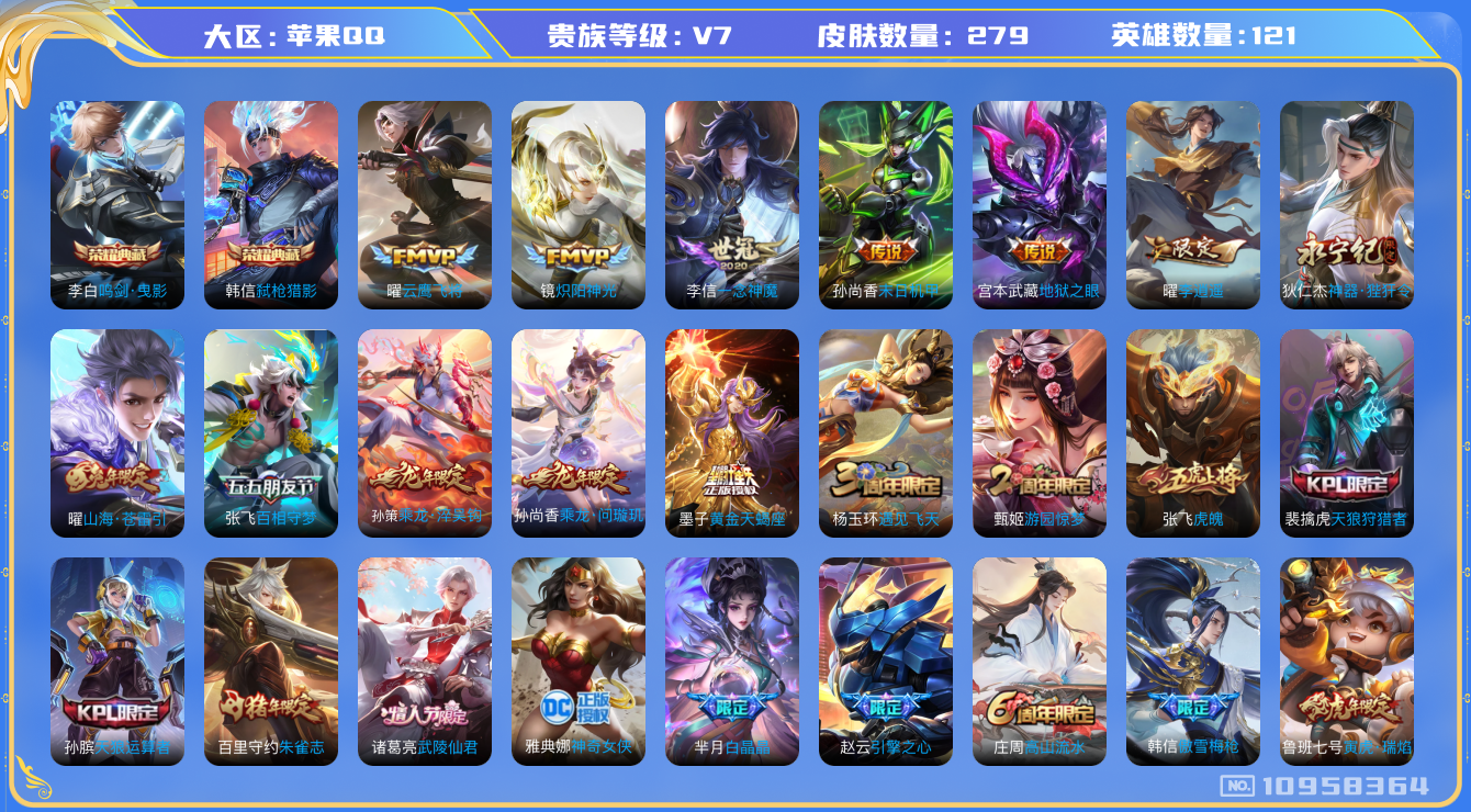 [10958364]【商品标题】:苹果Q-V7-至尊星耀IV段位-121英雄-279皮肤-2典藏-0珍品无双-0无双-0珍品传说-21传说-87史诗
