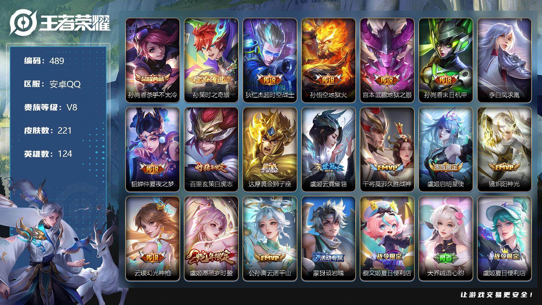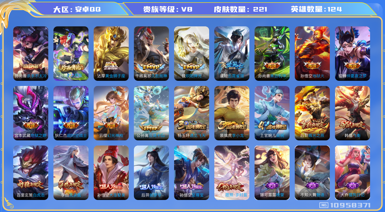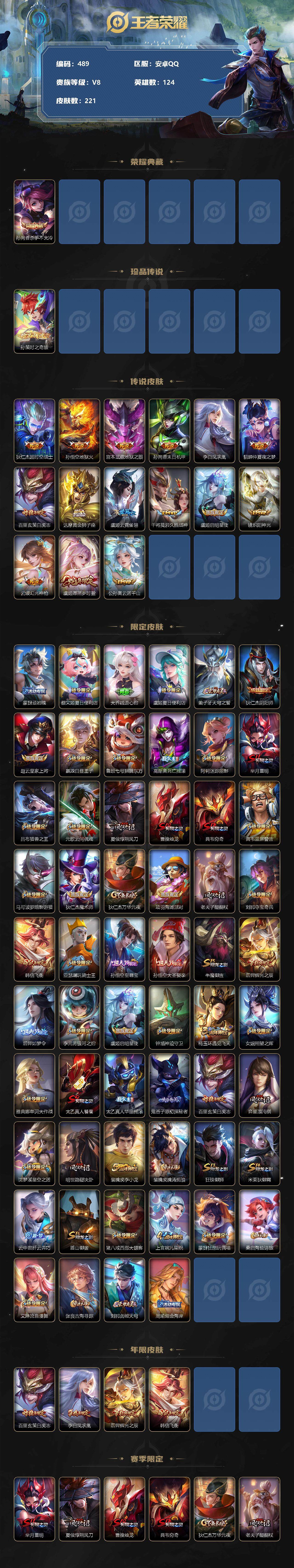 [10958371]【商品标题】:安卓Q-V8-荣耀黄金II段位-124英雄-221皮肤-1典藏-0珍品无双-0无双-1珍品传说-15传说-57史诗