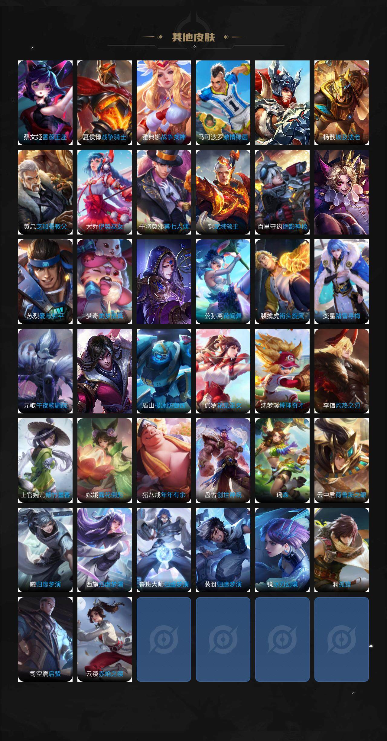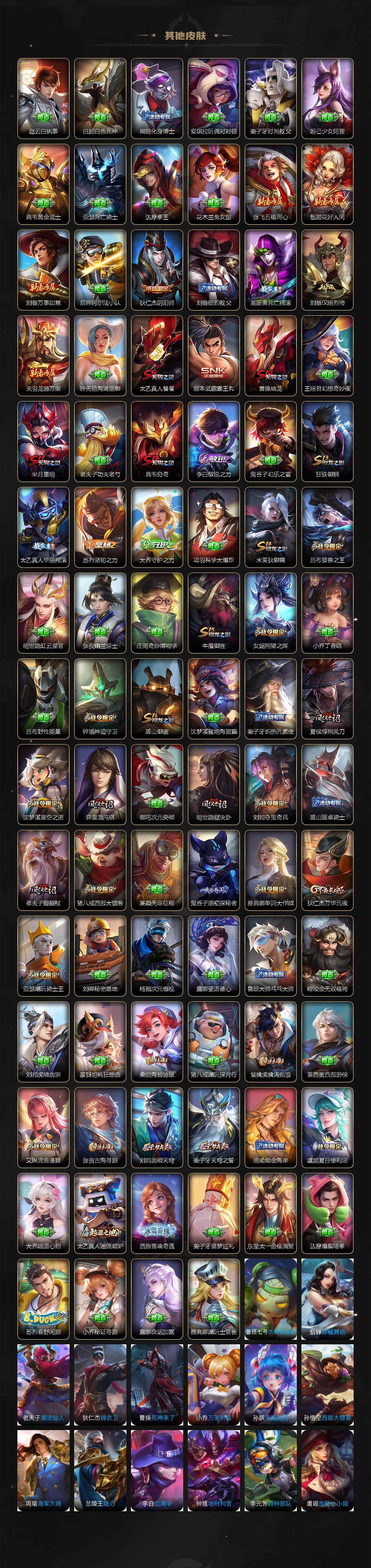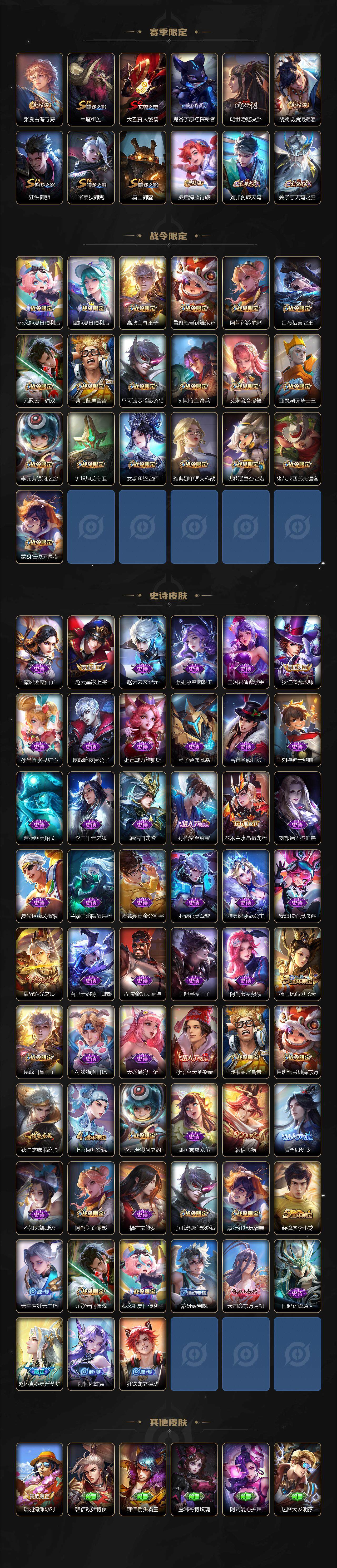 【赛季限定】:芈月重明,夏侯惇朔风刀,曹操烛龙,典韦穷奇,狄仁杰万华元夜,老夫子醍醐杖,张良古海寻踪,牛魔御旌,太乙真人饕餮,鬼谷子原初探秘者,弈星混沌棋,明世隐疑决卦,裴擒虎擒涛扼浪,狂铁御狮,米莱狄御霄,盾山御銮,桑启海盐诗旅,刘邦剑破天穹,姜子牙天穹之誓