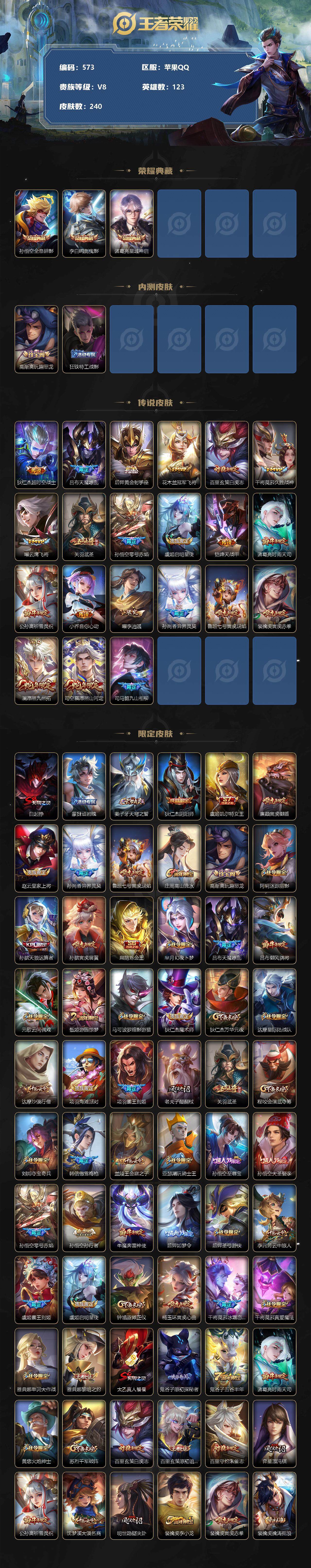 - [11808217]【商品标题】:苹果Q-V8-最强王者段位-125英雄-215皮肤-1典藏-0珍品无双-0无双-0珍品传说-18传说-68史诗 【荣耀典藏】:李白鸣剑曳影 【传说皮肤】:大司命死亡执政官,司空震愿照山河定,赵云乘龙铭钟鼎,马超琥珀纪元,铠琥珀纪元,澜逐花归海,夏洛特浮生妄,曜山海苍雷引,李白诗剑行,橘右京枫霜尽,马可波罗深海之息,马超无双飞将,曜李逍遥 ,镜炽阳神光,虞姬启明星使,李信一念神魔,花木兰冠军飞将,宫本武藏地狱之眼 【限定皮肤】:暃埋骨钱,蒙犽顽岩魄,蔡文姬夏日便利店,虞姬夏日便利店,姜子牙天穹之誓,狄仁杰阴阳师,赵云皇家上将,孙尚香蔷薇恋人,庄周高山流水,高渐离死亡摇滚,元歌无心,马可波罗深海之息,狄仁杰魔术师,达摩沙漠行僧,项羽海滩派对,韩信逐梦之影,韩信飞衡,韩信傲雪梅枪,王昭君午后时光,兰陵王金庭之子,橘右京枫霜尽,孙悟空孙行者,李元芳云中旅人,虞姬启明星使,钟馗驱傩正仪,雅典娜黎明之约,太乙真人华丽摇滚,鬼谷子五谷丰年,苏烈千军破阵,百里玄策原初追逐者,梦奇顽趣,沈梦溪大漠名商,裴擒虎擒涛扼浪,狂铁电玩高手,云中君纤云弄巧,嫦娥暖冬兔眠,曜李逍遥 ,曜山海苍雷引,西施玲珑珍味,鲁班大师探海日志,桑启海盐诗旅,夏洛特浮生妄,暃星界游侠,戈娅驭风魔法,艾琳流音漫舞,赵怀真鹤归松栖,司空震地狱燃心,阿古朵江河有灵,张良古海寻踪,蒙犽百解令,蒙恬荣光圣徽,鬼谷子天穹祈灯,铠琥珀纪元,马超琥珀纪元,赵云乘龙铭钟鼎,百里玄策超元猎域,沈梦溪龙舞盛年,鲁班七号蔬乡物语,李元芳蔬乡物语,刘邦剑破天穹,镜青焰无极,项羽苍威无极,刘备异域游侠,周瑜熔金海岸 【年限皮肤】:韩信飞衡,马超神威,曜山海苍雷引,赵云乘龙铭钟鼎 【赛季限定】:达摩沙漠行僧,兰陵王金庭之子,张良古海寻踪,李元芳云中旅人,钟馗驱傩正仪,雅典娜黎明之约,苏烈千军破阵,百里玄策原初追逐者,梦奇顽趣,沈梦溪大漠名商,裴擒虎擒涛扼浪,鲁班大师探海日志,桑启海盐诗旅,鬼谷子天穹祈灯,蒙恬荣光圣徽,刘邦剑破天穹,姜子牙天穹之誓 【战令限定】:蔡文姬夏日便利店,虞姬夏日便利店,王昭君午后时光,艾琳流音漫舞,狂铁电玩高手,嫦娥暖冬兔眠,西施玲珑珍味,司空震地狱燃心,暃星界游侠,戈娅驭风魔法,鲁班七号蔬乡物语,李元芳蔬乡物语,镜青焰无极,项羽苍威无极 【史诗皮肤】:露娜紫霞仙子,阿轲暗夜猫娘,赵云皇家上将,赵云