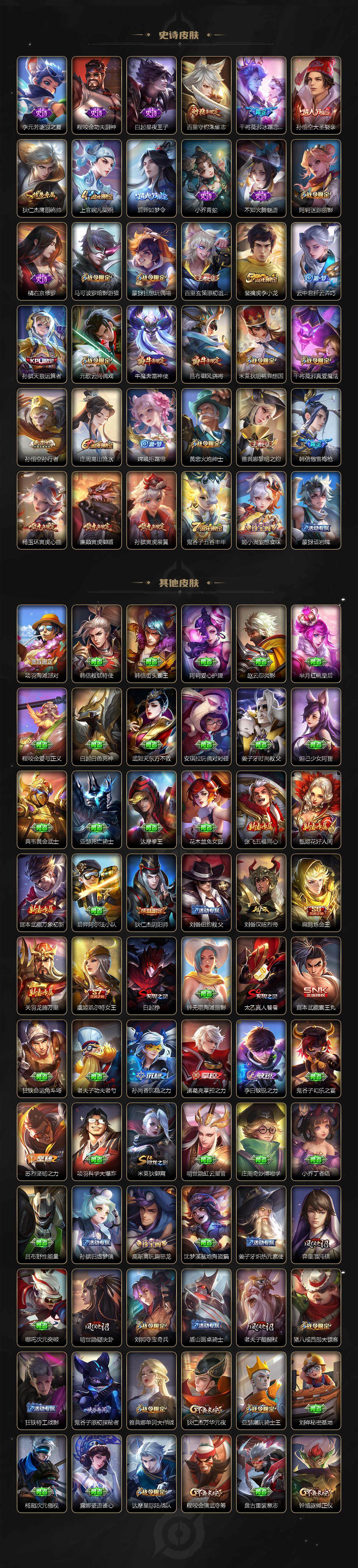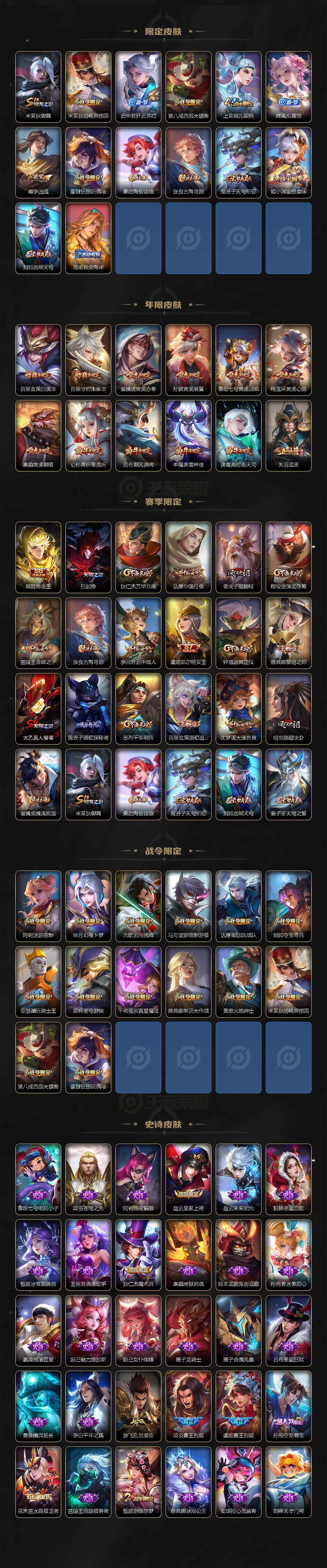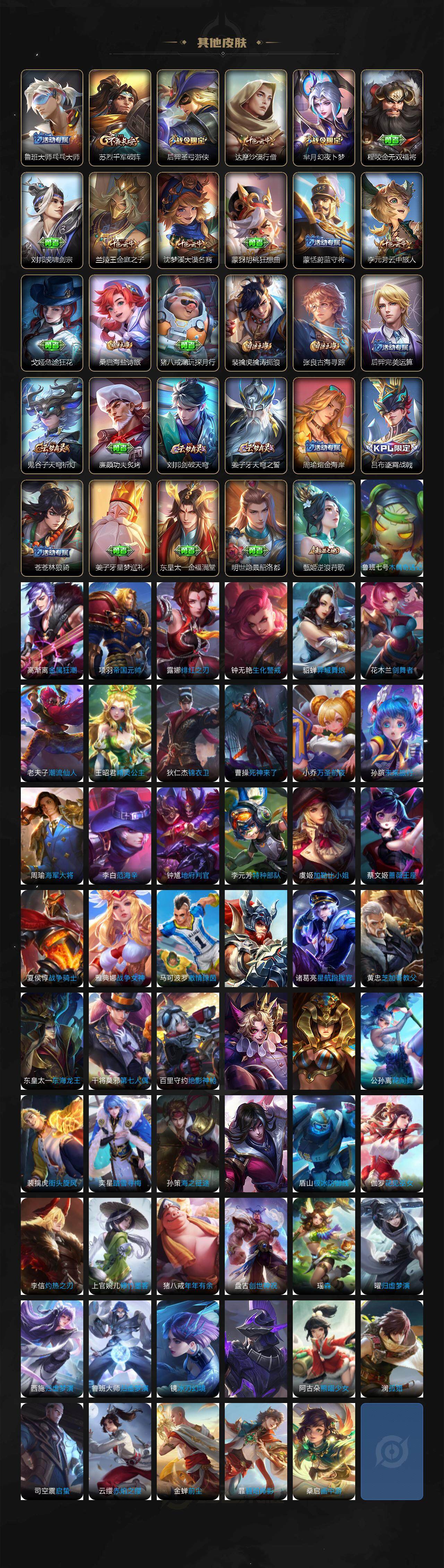 【限定皮肤】:白起狰,蒙犽顽岩魄,姜子牙天穹之誓,狄仁杰阴阳师,虞姬凯尔特女王,廉颇寅虎御盾,赵云皇家上将,孙尚香异界灵契,鲁班七号寅虎瑞焰,庄周高山流水,高渐离玩趣恶龙,阿轲迷踪丽影,孙膑天狼运算者,孙膑寅虎展翼,扁鹊炼金王,芈月幻夜卜梦,吕布天魔缭乱,吕布御风骁将,元歌云间偶戏,甄姬游园惊梦,马可波罗暗影游猎,狄仁杰魔术师,狄仁杰万华元夜,达摩星际陆战队,达摩沙漠行僧,项羽海滩派对,项羽霸王别姬,老夫子醍醐杖,关羽武圣,程咬金演武夺筹,刘邦夺宝奇兵,韩信傲雪梅枪,兰陵王金庭之子,亚瑟潮玩骑士王,孙悟空至尊宝,孙悟空大圣娶亲,孙悟空零号赤焰,孙悟空孙行者,牛魔奔雷神使,后羿如梦令,后羿圣弓游侠,李元芳云中旅人,虞姬霸王别姬,虞姬启明星使,钟馗驱傩正仪,杨玉环寅虎心曲,干将莫邪冰霜恋舞曲,干将莫邪真爱魔法,雅典娜单词大作战,雅典娜黎明之约,太乙真人饕餮,鬼谷子原初探秘者,鬼谷子五谷丰年,诸葛亮时雨天司,黄忠火炮绅士,苏烈千军破阵,百里玄策白虎志,百里玄策原初追逐者,百里守约朱雀志,弈星混沌棋,公孙离祈雪灵祝,沈梦溪大漠名商,明世隐疑决卦,裴擒虎李小龙,裴擒虎寅虎赤拳,裴擒虎擒涛扼浪,米莱狄御霄,米莱狄胡桃异想国,云中君纤云弄巧,猪八戒西部大镖客,上官婉儿梁祝,嫦娥拒霜思,曜李逍遥 ,蒙犽狂想玩偶喵,桑启海盐诗旅,张良古海寻踪,鬼谷子天穹祈灯,姬小满妄想食味,刘邦剑破天穹,周瑜熔金海岸