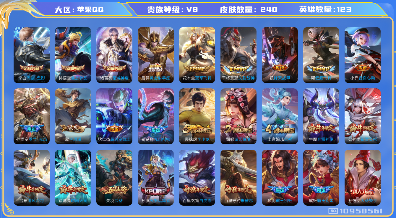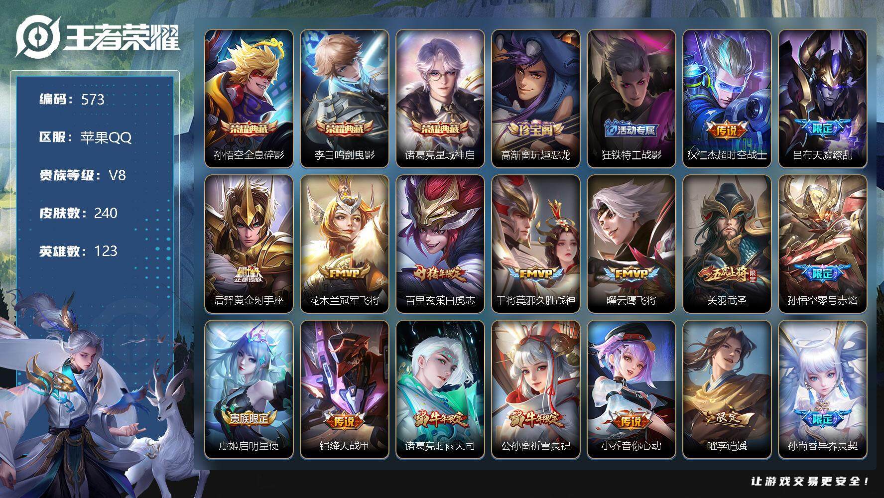 [10958561]【商品标题】:苹果Q-V8-永恒钻石II段位-123英雄-240皮肤-3典藏-0珍品无双-0无双-0珍品传说-21传说-66史诗