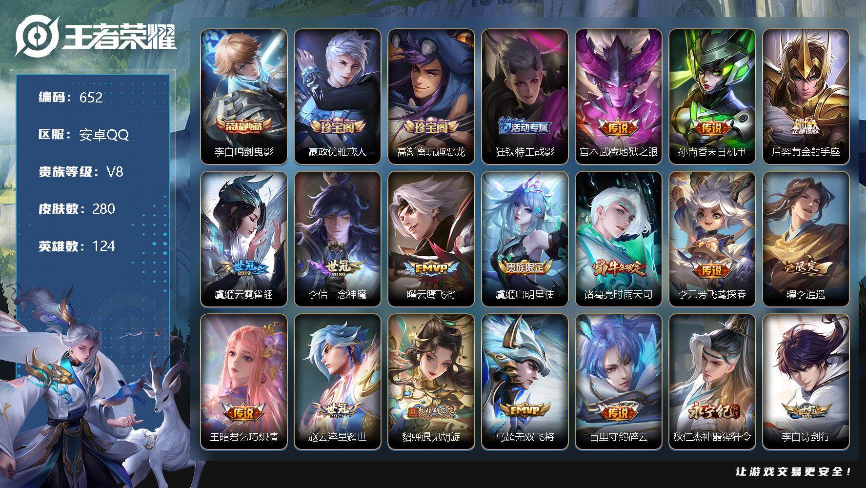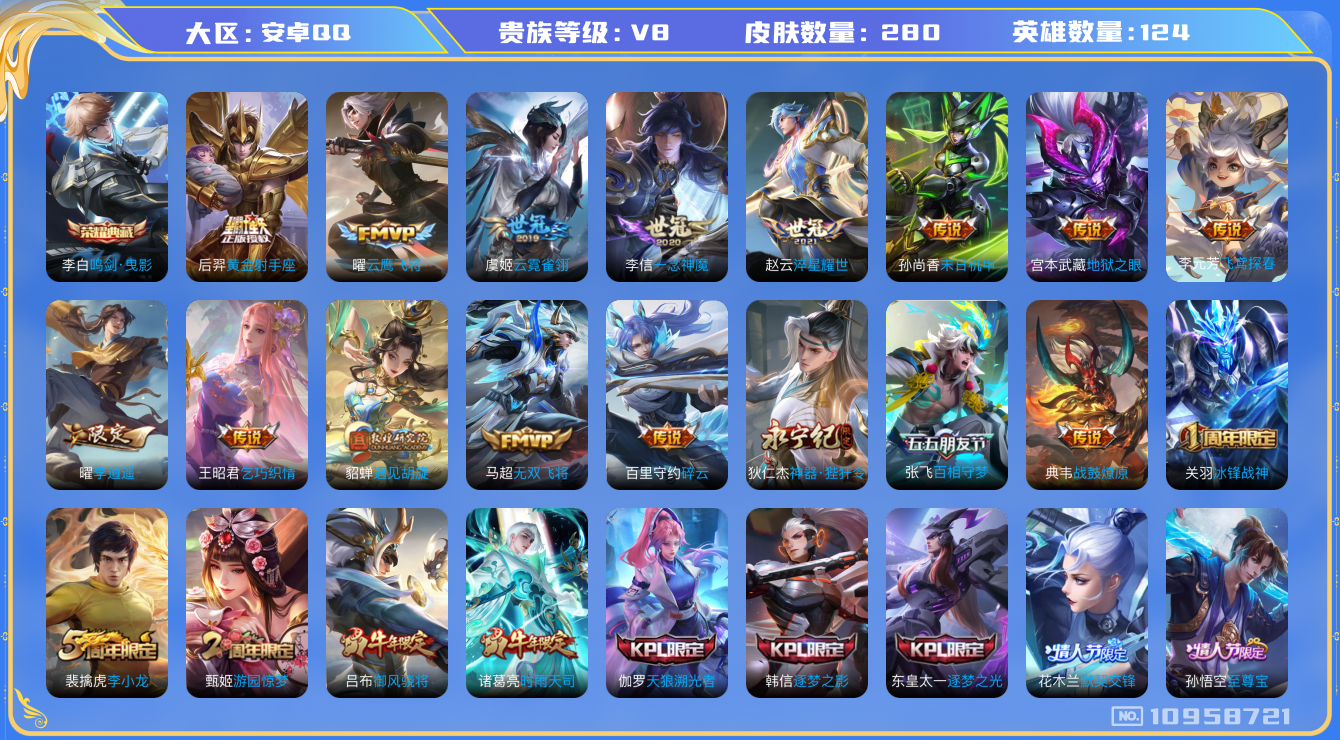 [10958721]【商品标题】:安卓Q-V8-永恒钻石II段位-124英雄-280皮肤-1典藏-0珍品无双-0无双-0珍品传说-23传说-91史诗