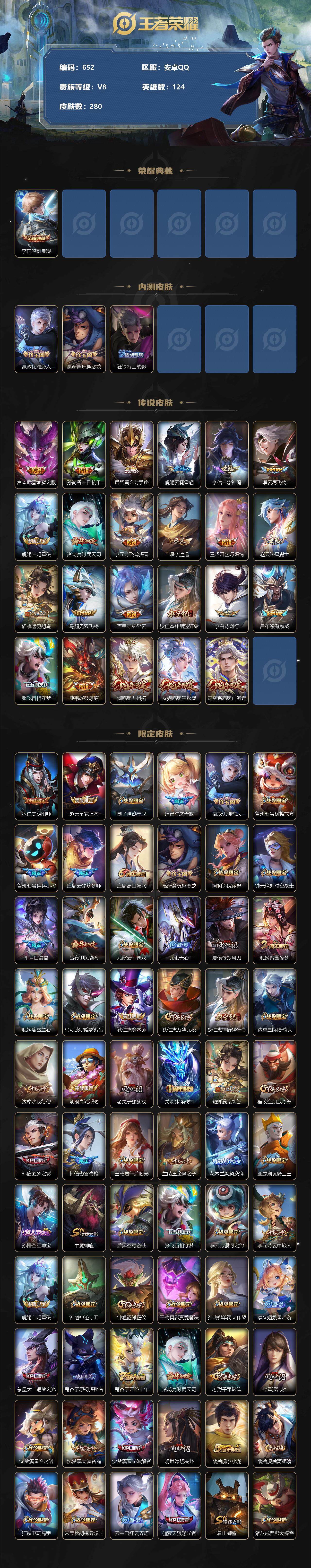 - [11445828]V8 1典藏 1珍品传说 13传说 124英雄 312皮肤 可修改实名 优质装备:活力突击,炽阳神光,末日机甲-孙尚香(绿蚂蚱),仲夏夜之梦(大飞蛾),淬星耀世,澜逐花归海 珍品传说:时之奇旅-孙策 传说皮:祥瑞亨通,幻光神枪 珍宝阁皮:妄想食味,玩趣恶龙 限定皮:愿照·九州拓(澜年限),愿照·岁时盈(虞姬年限),逐霄战戟,鸣野蒿,至尊宝,梅西,魔法小厨娘,遇见飞天,高山流水,五谷丰年,青龙志(铠年限),冰锋战神,游园惊梦,梁祝,天狼狩猎者,祈雪灵祝(雪兔子),李小龙,逐梦之影,朱雀志(守约年限),一生所爱,天魔缭乱,冰霜恋舞曲 史诗皮:器灵·浮梦炉,星界战将,蒙犽顽岩魄,百相守梦-百里守约,电玩小子(小书包),黄金分割率,千年之狐,江河有灵,高渐离燃音魔法,暗夜猫娘,冰冠公主,猫狗日记-孙策,乱世虎臣,节奏热浪,女仆咖啡,摇滚巨星,水果甜心,绅士熊喵,天才门将,星夜王子,心灵骇客,功夫厨神,德古拉伯爵,暗隐猎兽者,幽灵船长,鬼剑武藏,暗渊魔法,心灵战警,天秀·启明,舞动绿茵,地狱岩魂,纤云弄巧,繁星吟游(呼啦呼啦),拒霜思,缤纷独角兽,乘风破浪,逐浪之夏,月团寄思,水晶猎龙者,箭羽风息,金属风暴,原初追逐者,圣诞狂欢,圣诞恋歌,鹰眼统帅,暗夜贵公子,魅力维加斯,黎明之约,未来纪元-赵云
