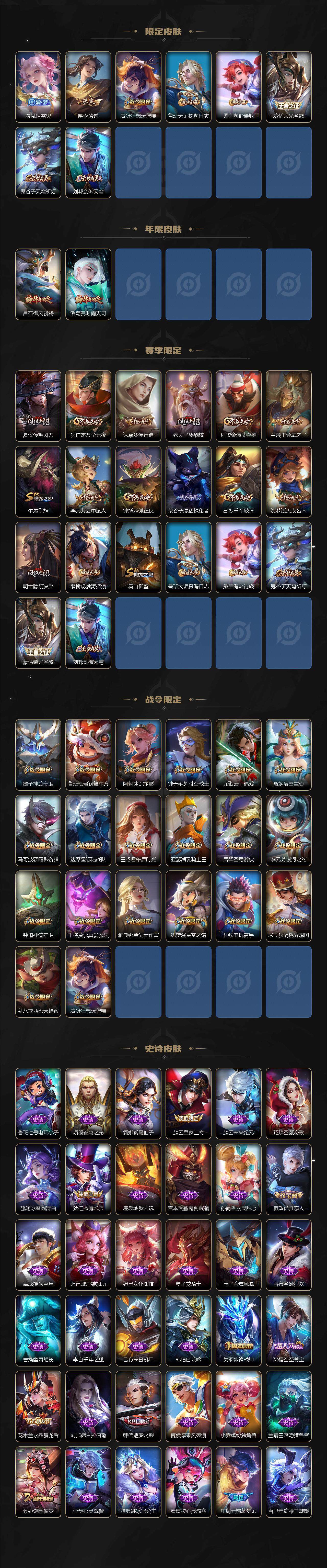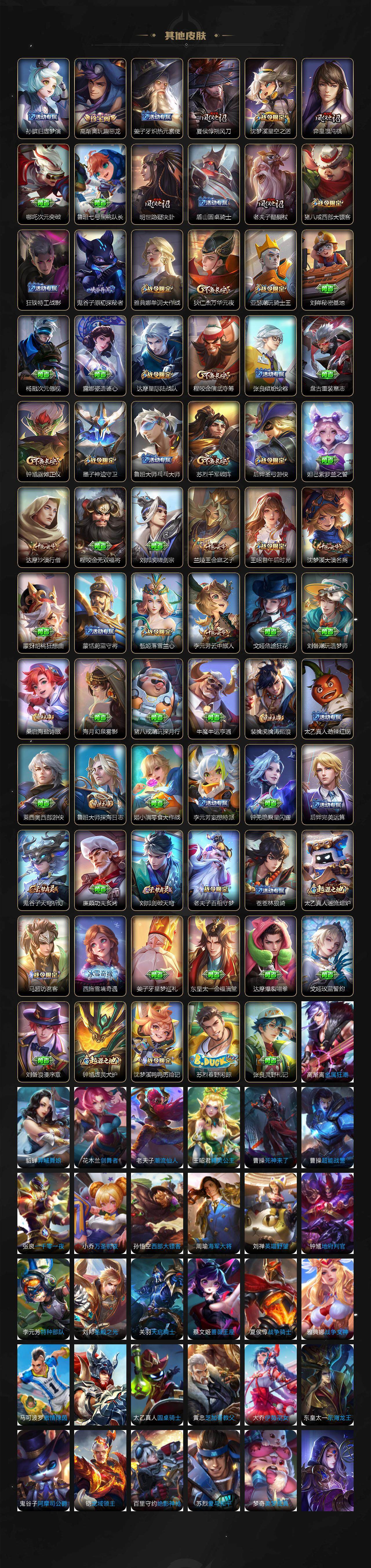 【限定皮肤】:狄仁杰阴阳师,赵云皇家上将,墨子神迹守卫,妲己时之奇旅,嬴政优雅恋人,鲁班七号狮舞东方,鲁班七号乒乒小将,庄周云端筑梦师,庄周高山流水,高渐离玩趣恶龙,阿轲迷踪丽影,钟无艳超时空战士,芈月白晶晶,吕布御风骁将,元歌云间偶戏,元歌无心,夏侯惇朔风刀,甄姬游园惊梦,甄姬落雪兰心,马可波罗暗影游猎,狄仁杰魔术师,狄仁杰万华元夜,狄仁杰神器狴犴令,达摩星际陆战队,达摩沙漠行僧,项羽海滩派对,老夫子醍醐杖,关羽冰锋战神,貂蝉遇见胡旋,程咬金演武夺筹,韩信逐梦之影,韩信傲雪梅枪,王昭君午后时光,兰陵王金庭之子,花木兰默契交锋,亚瑟潮玩骑士王,孙悟空至尊宝,牛魔御旌,后羿圣弓游侠,张飞百相守梦,李元芳银河之约,李元芳云中旅人,虞姬启明星使,钟馗神迹守卫,钟馗驱傩正仪,干将莫邪真爱魔法,雅典娜单词大作战,蔡文姬繁星吟游,东皇太一逐梦之光,鬼谷子原初探秘者,鬼谷子五谷丰年,诸葛亮时雨天司,苏烈千军破阵,弈星混沌棋,沈梦溪星空之诺,沈梦溪大漠名商,沈梦溪匿光破解者,明世隐疑决卦,裴擒虎李小龙,裴擒虎擒涛扼浪,狂铁电玩高手,米莱狄胡桃异想国,云中君纤云弄巧,伽罗天狼溯光者,盾山御銮,猪八戒西部大镖客,嫦娥拒霜思,曜李逍遥 ,蒙犽狂想玩偶喵,鲁班大师探海日志,桑启海盐诗旅,蒙恬荣光圣徽,鬼谷子天穹祈灯,刘邦剑破天穹