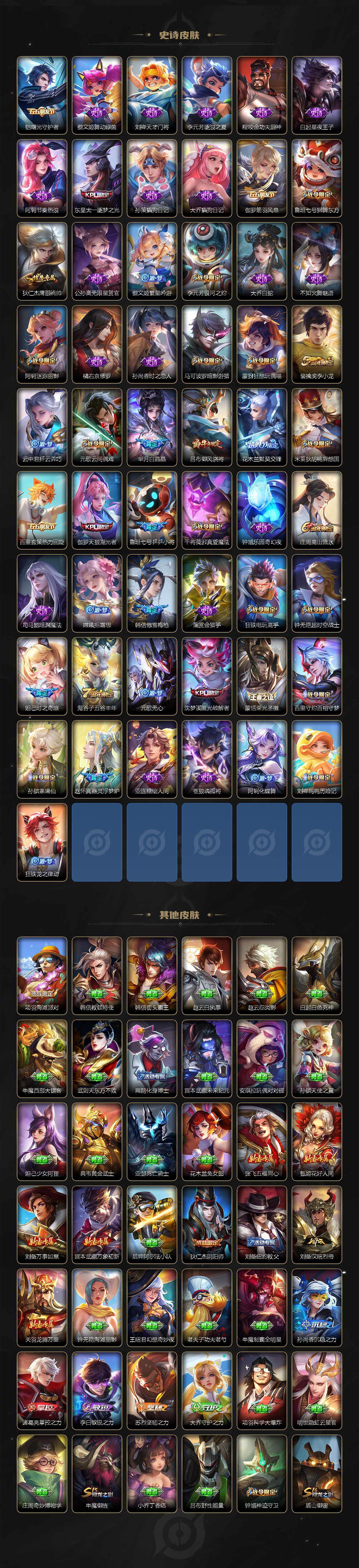 【传说皮肤】:宫本武藏地狱之眼,孙尚香末日机甲,后羿黄金射手座,虞姬云霓雀翎,李信一念神魔,曜云鹰飞将,虞姬启明星使,诸葛亮时雨天司,李元芳飞鸢探春,曜李逍遥 ,王昭君乞巧织情,赵云淬星耀世,貂蝉遇见胡旋,马超无双飞将,百里守约碎云,狄仁杰神器狴犴令,李白诗剑行,吕布怒海麟威,张飞百相守梦,典韦战鼓燎原,澜愿照九州拓,女娲愿照千秋盛,司空震愿照山河定