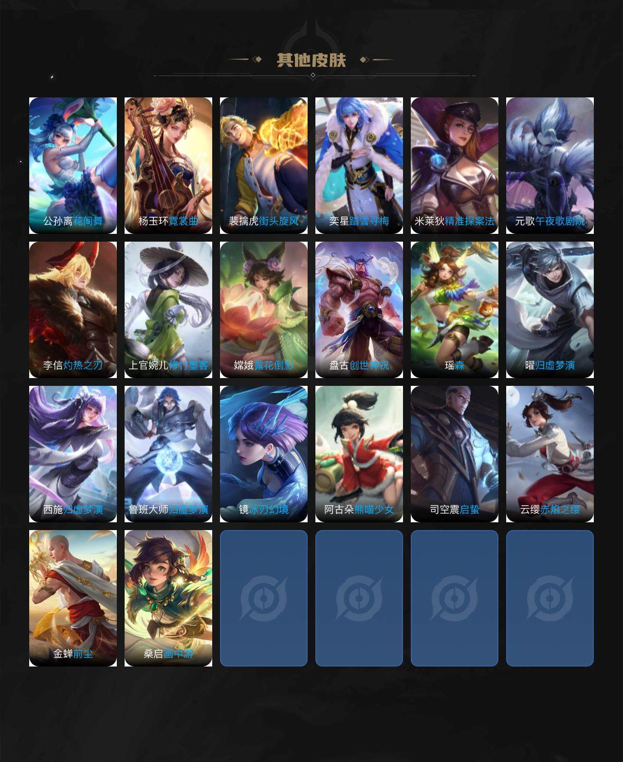 大乔白蛇,伽罗箭羽风息,李元芳逐浪之夏,不知火舞魅语,公孙离无限星赏官,大乔猫狗日记,孙策猫狗日记,阿轲节奏热浪,露娜紫霞仙子,韩信白龙吟,项羽苍穹之光,孙尚香时之恋人,雅典娜冰冠公主,吕布末日机甲,鲁班七号电玩小子,橘右京修罗,墨子龙骑士,嬴政摇滚巨星,刘禅天才门将,白起星夜王子,安琪拉心灵骇客,程咬金功夫厨神,刘邦德古拉伯爵,兰陵王暗隐猎兽者,曹操幽灵船长,宫本武藏鬼剑武藏,司马懿暗渊魔法,亚瑟心灵战警,钟馗乐园奇幻夜,蔡文姬舞动绿茵,廉颇地狱岩魂,小乔缤纷独角兽,夏侯惇乘风破浪,花木兰水晶猎龙者,铠曙光守护者,百里玄策热力回旋,墨子金属风暴,吕布圣诞狂欢,貂蝉圣诞恋歌,百里守约特工魅影,嫦娥拒霜思,李白千年之狐,澜赏金猎手,沈梦溪匿光破解者,赵怀真器灵·浮梦炉,亚连糖绘人间,苍狼魂孤将