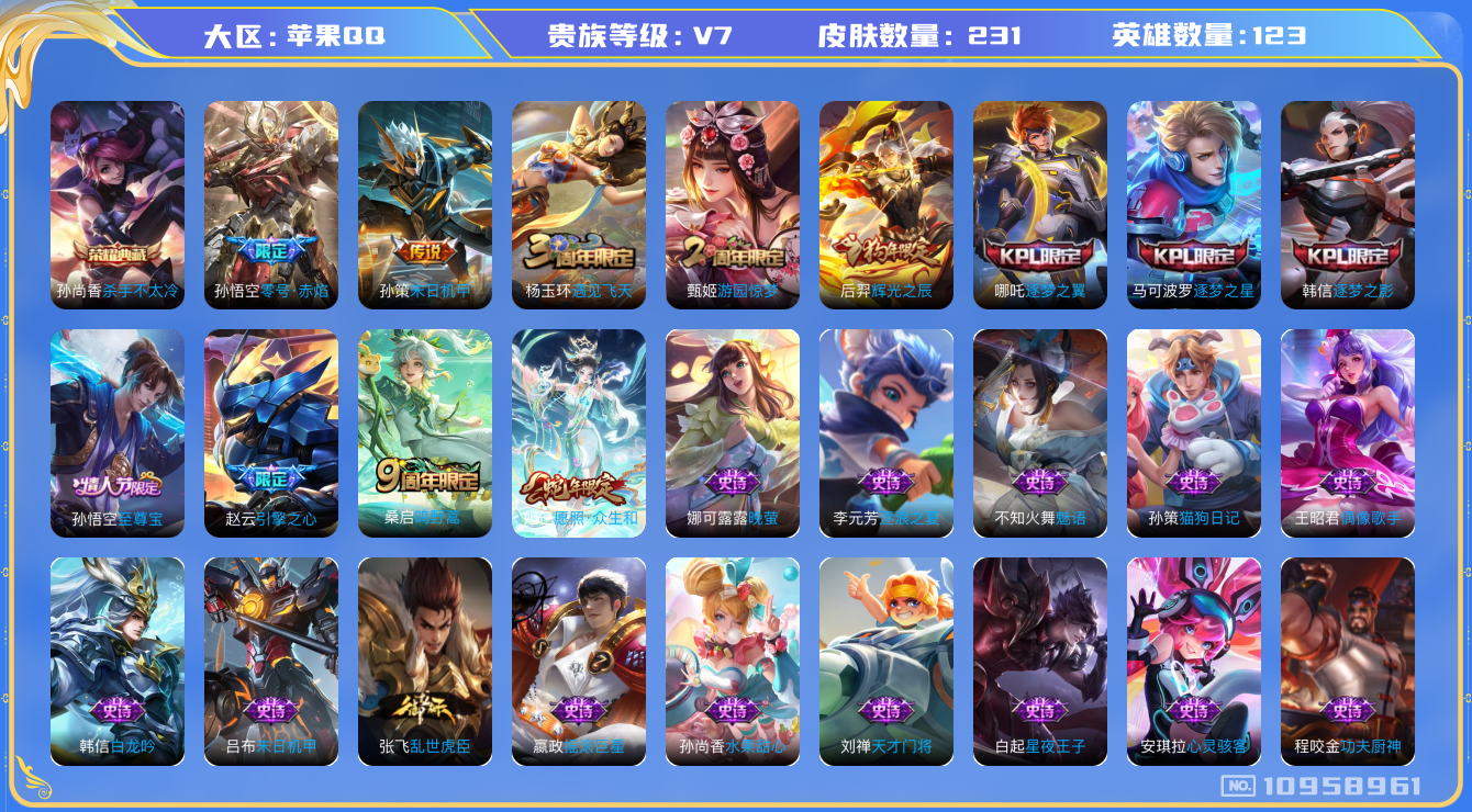 [10958961]【商品标题】:苹果Q-V7-永恒钻石III段位-123英雄-231皮肤-1典藏-0珍品无双-0无双-0珍品传说-5传说-54史诗