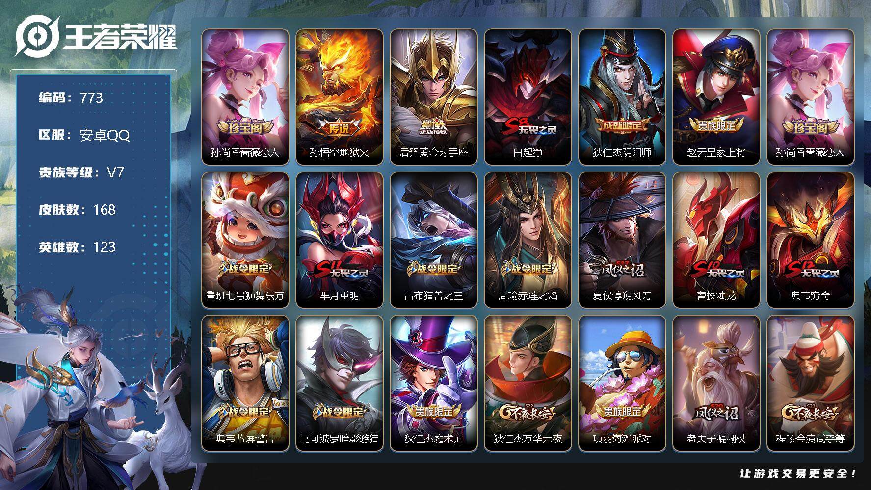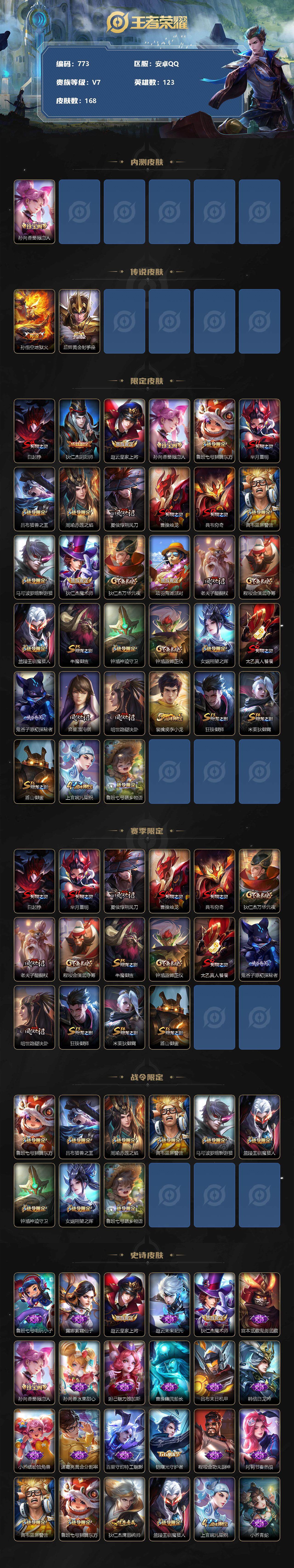 [10959081]【商品标题】:安卓Q-V7-至尊星耀III段位-123英雄-168皮肤-0典藏-0珍品无双-0无双-0珍品传说-2传说-34史诗