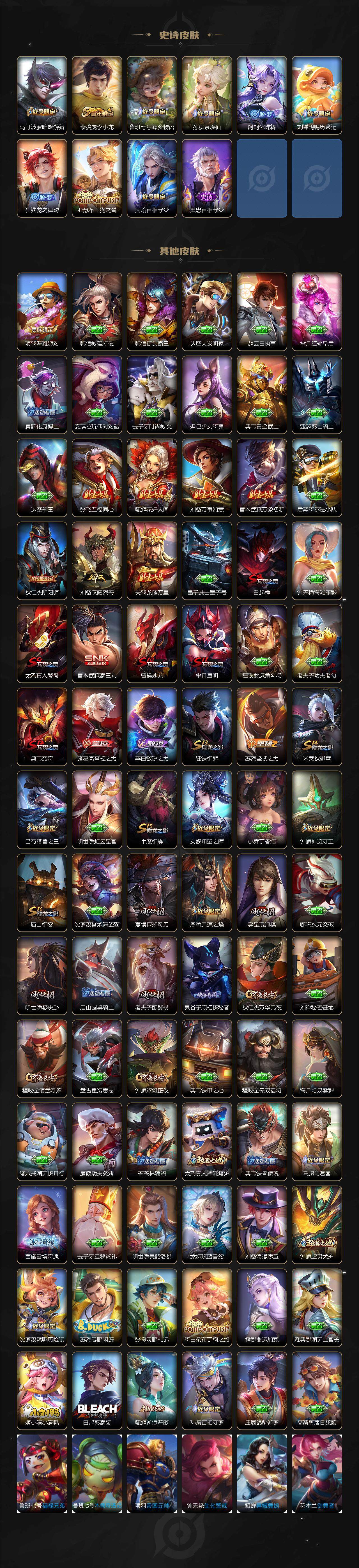 【史诗皮肤】:鲁班七号电玩小子,露娜紫霞仙子,赵云皇家上将,赵云未来纪元,狄仁杰魔术师,宫本武藏鬼剑武藏,孙尚香蔷薇恋人,孙尚香水果甜心,妲己魅力维加斯,曹操幽灵船长,吕布末日机甲,韩信白龙吟,小乔缤纷独角兽,诸葛亮黄金分割率,百里守约特工魅影,铠曙光守护者,程咬金功夫厨神,阿轲节奏热浪,典韦蓝屏警告,鲁班七号狮舞东方,狄仁杰鹰眼统帅,兰陵王驯魔猎人,上官婉儿梁祝,小乔青蛇,马可波罗暗影游猎,裴擒虎李小龙,鲁班七号蔬乡物语,孙膑茶境仙,阿轲化蝶舞,刘禅鸭鸭历险记,狂铁龙之律动,亚瑟布丁狗之誓,周瑜百相守梦,黄忠百相守梦