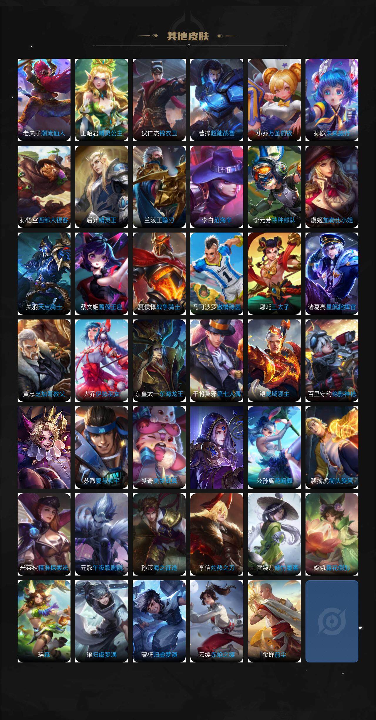 【其他皮肤】:项羽海滩派对,韩信教廷特使,韩信街头霸王,达摩大发明家,赵云白执事,芈月红桃皇后,扁鹊化身博士,安琪拉玩偶对对碰,姜子牙时尚教父,妲己少女阿狸,典韦黄金武士,亚瑟死亡骑士,达摩拳王,张飞五福同心,甄姬花好人间,刘备万事如意,宫本武藏万象初新,后羿阿尔法小队,狄仁杰阴阳师,刘备汉昭烈帝,关羽龙腾万里,墨子进击墨子号,白起狰,钟无艳海滩丽影,太乙真人饕餮,宫本武藏霸王丸,曹操烛龙,芈月重明,狂铁命运角斗场,老
