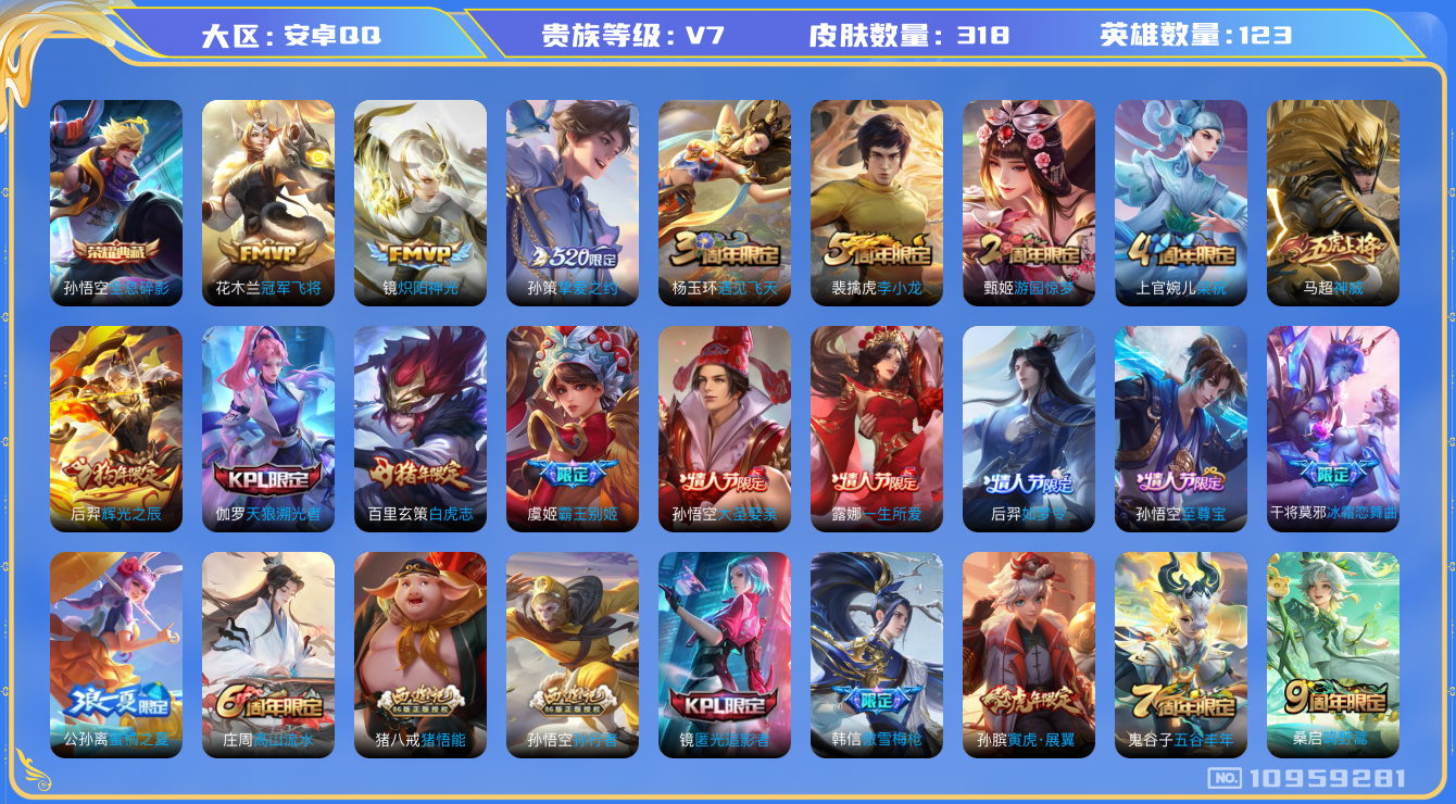 [10959281]【商品标题】:安卓Q-V7-永恒钻石V段位-123英雄-318皮肤-1典藏-0珍品无双-0无双-0珍品传说-6传说-95史诗