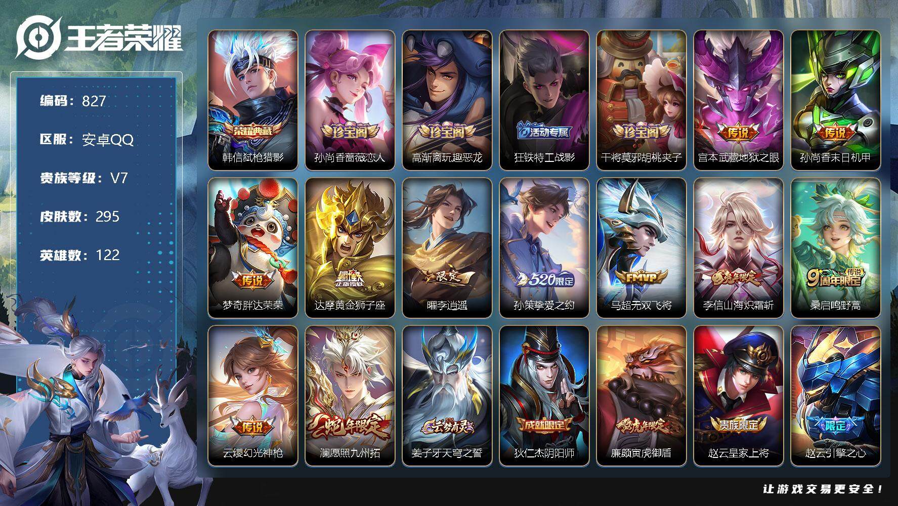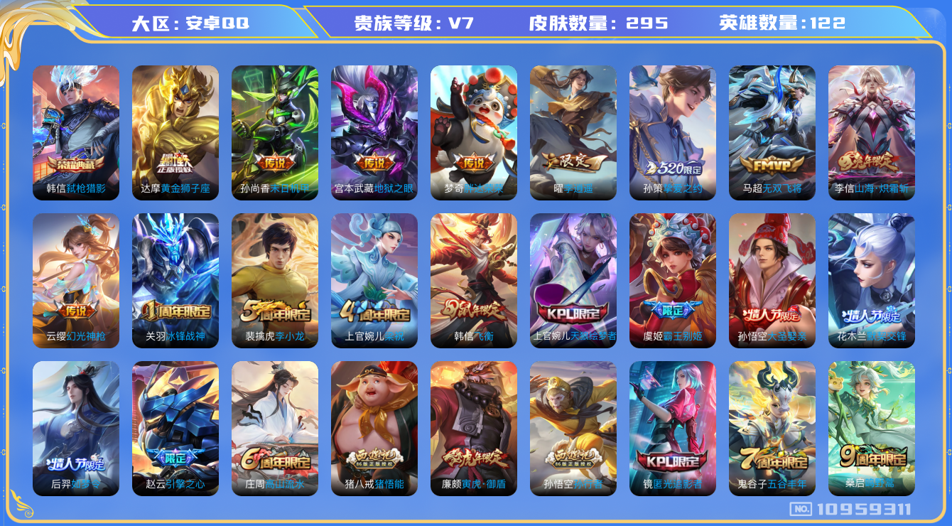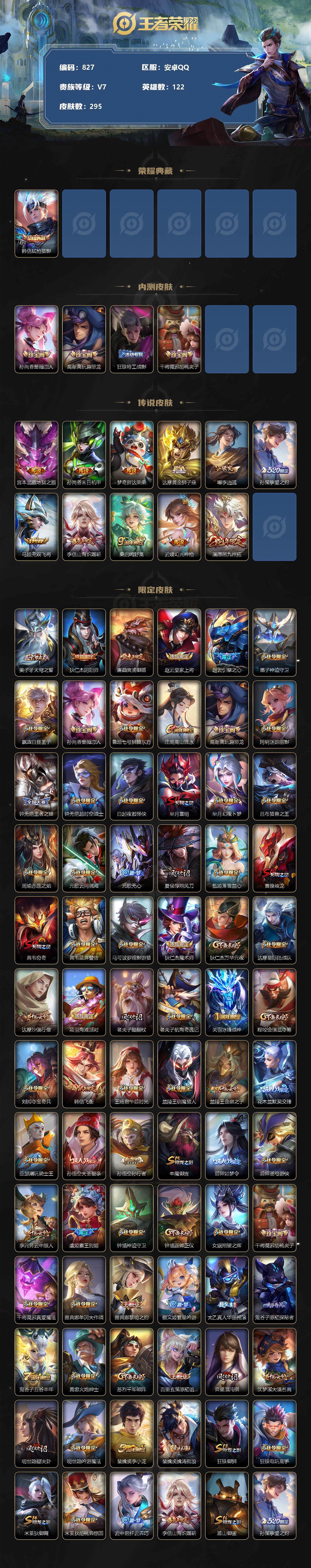 [10959311]【商品标题】:安卓Q-V5-永恒钻石I段位-122英雄-295皮肤-1典藏-0珍品无双-0无双-0珍品传说-11传说-95史诗