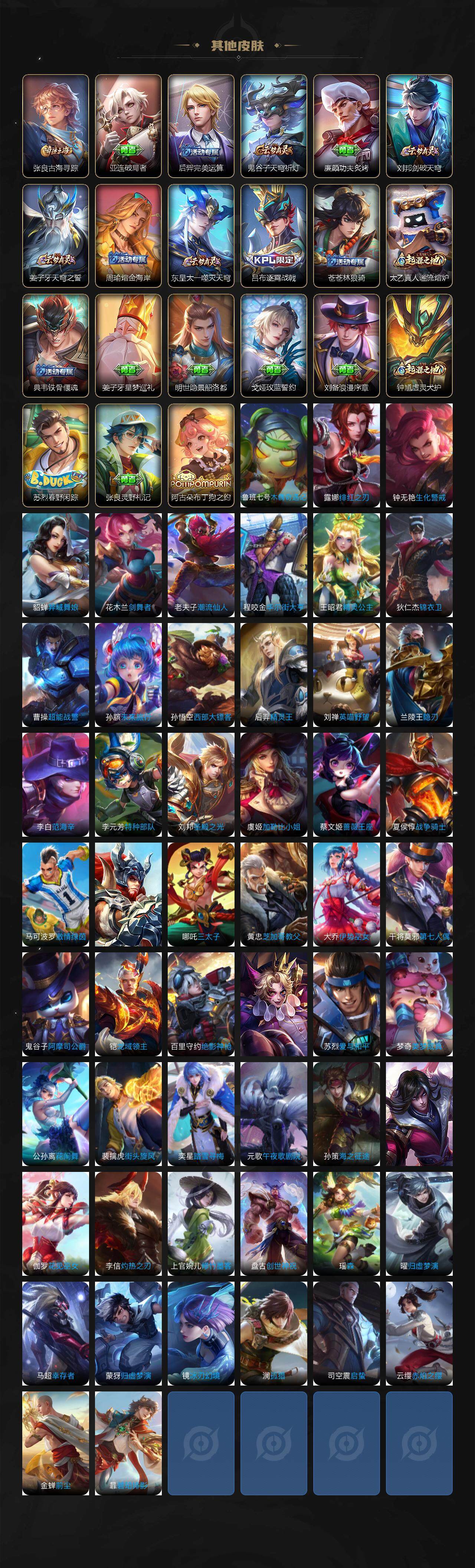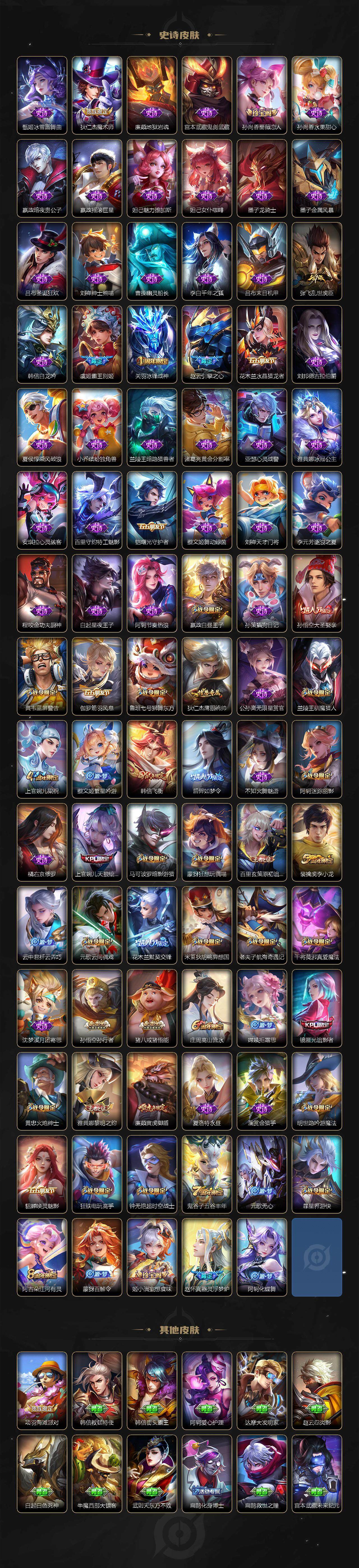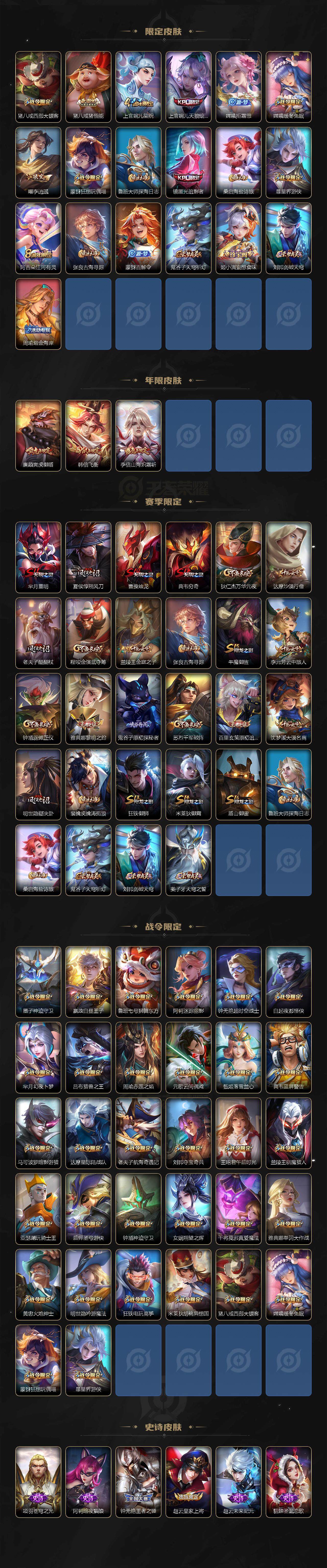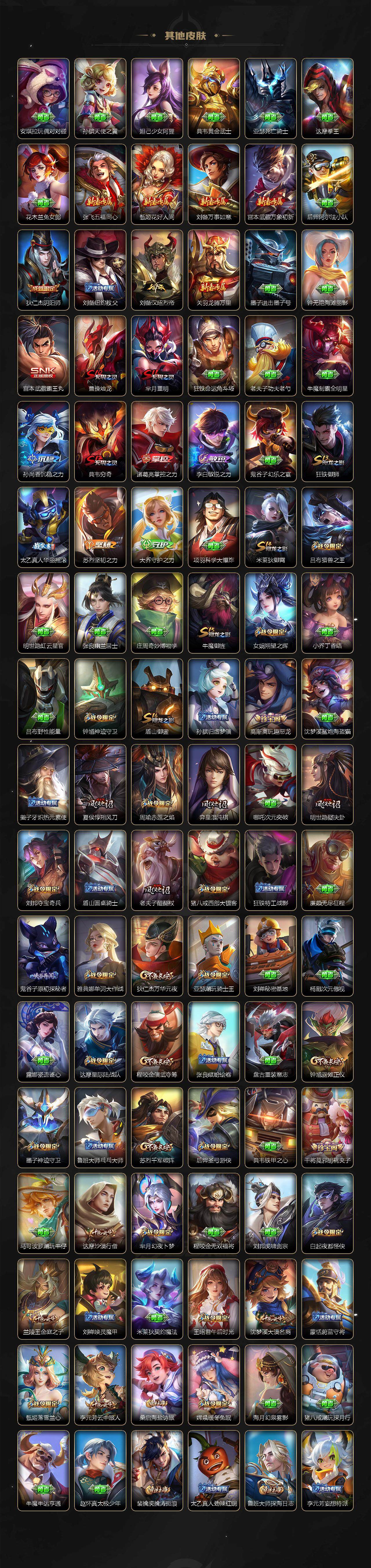 【限定皮肤】:姜子牙天穹之誓,狄仁杰阴阳师,廉颇寅虎御盾,赵云皇家上将,赵云引擎之心,墨子神迹守卫,嬴政白昼王子,孙尚香蔷薇恋人,鲁班七号狮舞东方,庄周高山流水,高渐离玩趣恶龙,阿轲迷踪丽影,钟无艳王者之锤,钟无艳超时空战士,白起夜都怪侠,芈月重明,芈月幻夜卜梦,吕布猎兽之王,周瑜赤莲之焰,元歌云间偶戏,元歌无心,夏侯惇朔风刀,甄姬落雪兰心,曹操烛龙,典韦穷奇,典韦蓝屏警告,马可波罗暗影游猎,狄仁杰魔术师,狄仁杰万华元夜,达摩星际陆战队,达摩沙漠行僧,项羽海滩派对,老夫子醍醐杖,老夫子航海奇遇记,关羽冰锋战神,程咬金演武夺筹,刘邦夺宝奇兵,韩信飞衡,王昭君午后时光,兰陵王驯魔猎人,兰陵王金庭之子,花木兰默契交锋,亚瑟潮玩骑士王,孙悟空大圣娶亲,孙悟空孙行者,牛魔御旌,后羿如梦令,后羿圣弓游侠,李元芳云中旅人,虞姬霸王别姬,钟馗神迹守卫,钟馗驱傩正仪,女娲朔望之晖,干将莫邪胡桃夹子,干将莫邪真爱魔法,雅典娜单词大作战,雅典娜黎明之约,蔡文姬繁星吟游,太乙真人华丽摇滚,鬼谷子原初探秘者,鬼谷子五谷丰年,黄忠火炮绅士,苏烈千军破阵,百里玄策原初追逐者,弈星混沌棋,沈梦溪大漠名商,明世隐疑决卦,明世隐吟游魔法,裴擒虎李小龙,裴擒虎擒涛扼浪,狂铁御狮,狂铁电玩高手,米莱狄御霄,米莱狄胡桃异想国,云中君纤云弄巧,李信山海炽霜斩,盾山御銮,孙策挚爱之约,猪八戒西部大镖客,猪八戒猪悟能,上官婉儿梁祝,上官婉儿天狼绘梦者,嫦娥拒霜思,嫦娥暖冬兔眠,曜李逍遥 ,蒙犽狂想玩偶喵,鲁班大师探海日志,镜匿光追影者,桑启海盐诗旅,暃星界游侠,阿古朵江河有灵,张良古海寻踪,蒙犽百解令,鬼谷子天穹祈灯,姬小满妄想食味,刘邦剑破天穹,周瑜熔金海岸