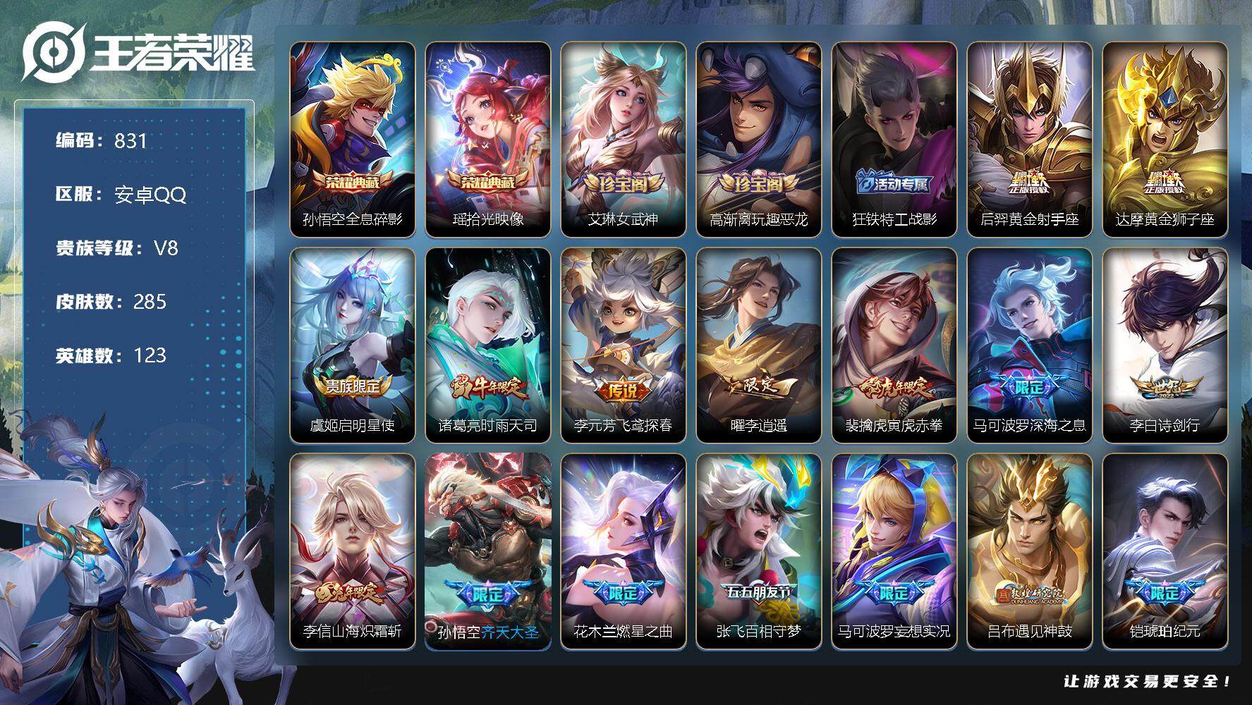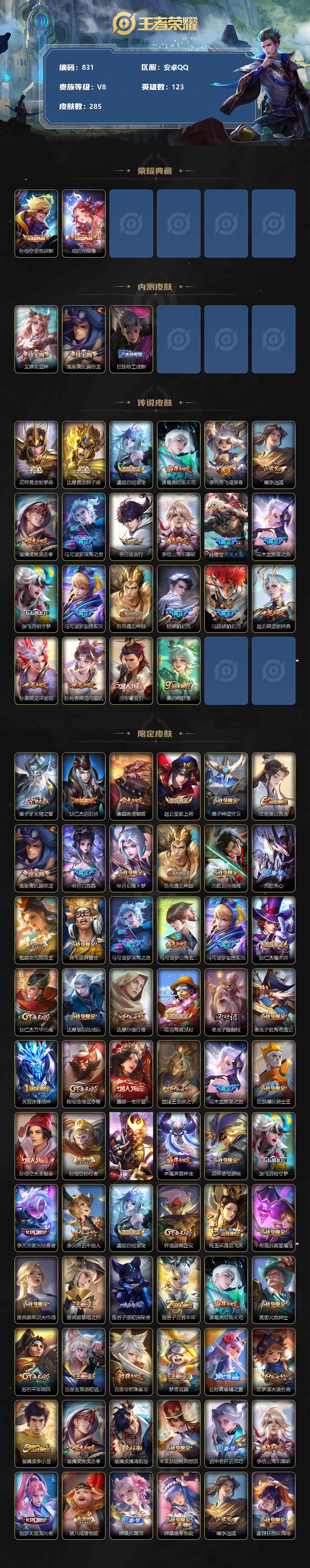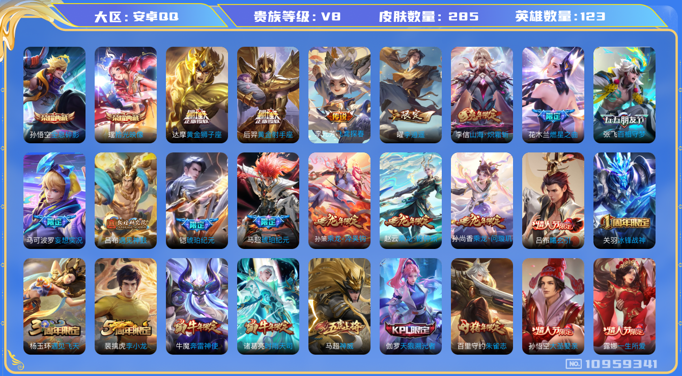 [10959341]【商品标题】:安卓Q-V4-至尊星耀I段位-123英雄-285皮肤-2典藏-0珍品无双-0无双-0珍品传说-22传说-93史诗