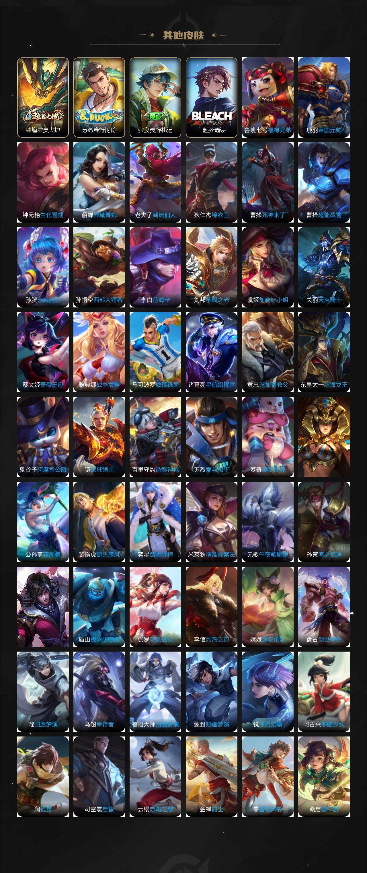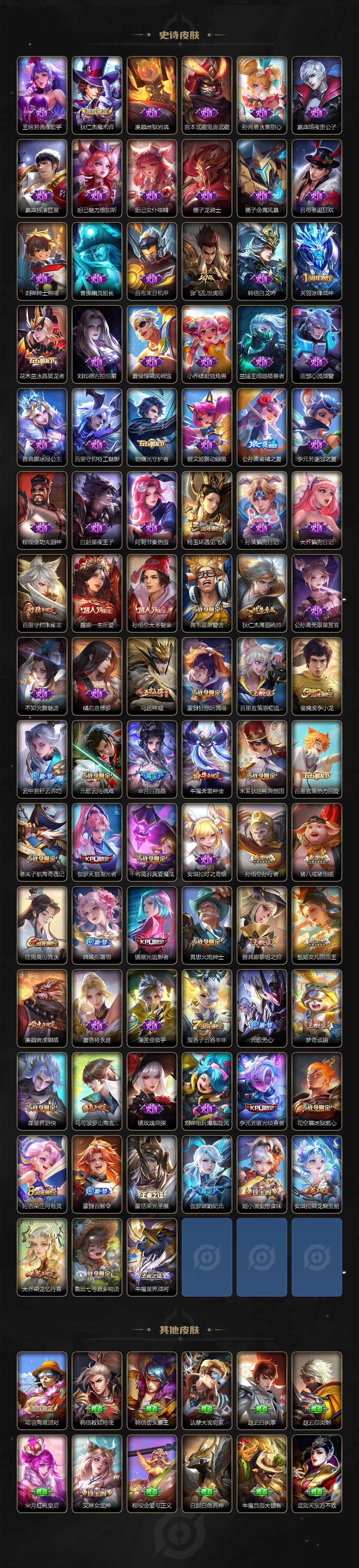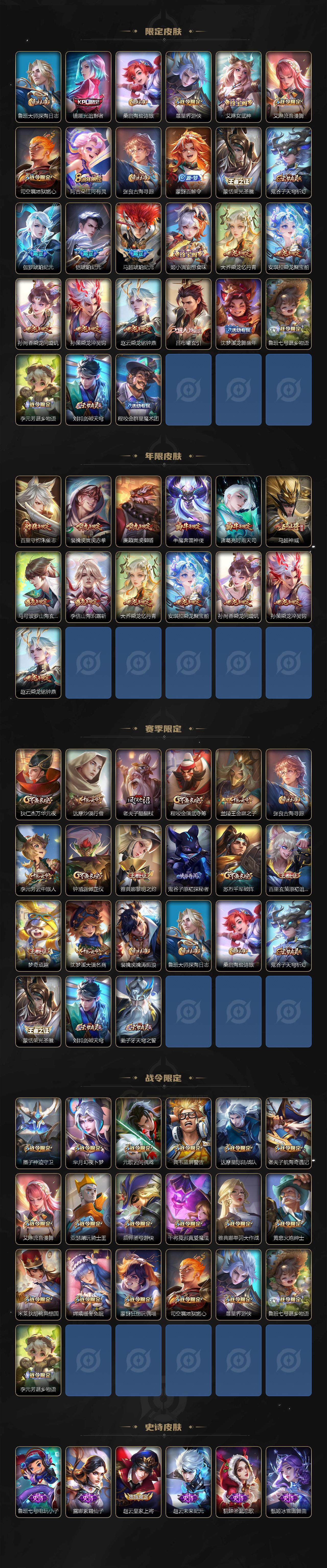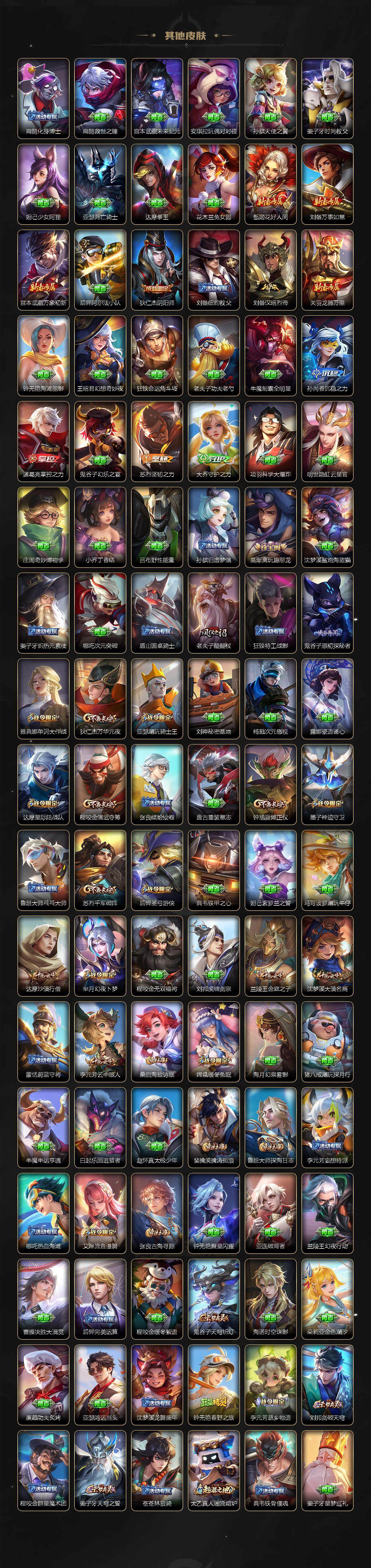 【限定皮肤】:姜子牙天穹之誓,狄仁杰阴阳师,廉颇寅虎御盾,赵云皇家上将,墨子神迹守卫,庄周高山流水,高渐离玩趣恶龙,芈月白晶晶,芈月幻夜卜梦,吕布遇见神鼓,元歌云间偶戏,元歌无心,甄姬女儿国国王,典韦蓝屏警告,马可波罗深海之息,马可波罗山海玄木吟,马可波罗妄想实况,狄仁杰魔术师,狄仁杰万华元夜,达摩星际陆战队,达摩沙漠行僧,项羽海滩派对,老夫子醍醐杖,老夫子航海奇遇记,关羽冰锋战神,程咬金演武夺筹,露娜一生所爱,兰陵王金庭之子,花木兰燃星之曲,亚瑟潮玩骑士王,孙悟空大圣娶亲,孙悟空孙行者,孙悟空齐天大圣,牛魔奔雷神使,后羿圣弓游侠,张飞百相守梦,李元芳匿光侦查者,李元芳云中旅人,虞姬启明星使,钟馗驱傩正仪,杨玉环遇见飞天,干将莫邪真爱魔法,雅典娜单词大作战,雅典娜黎明之约,鬼谷子原初探秘者,鬼谷子五谷丰年,诸葛亮时雨天司,黄忠火炮绅士,苏烈千军破阵,百里玄策原初追逐者,百里守约朱雀志,梦奇顽趣,公孙离蜜橘之夏,沈梦溪大漠名商,裴擒虎李小龙,裴擒虎寅虎赤拳,裴擒虎擒涛扼浪,米莱狄胡桃异想国,云中君纤云弄巧,李信山海炽霜斩,伽罗天狼溯光者,猪八戒猪悟能,嫦娥拒霜思,嫦娥暖冬兔眠,曜李逍遥 ,蒙犽狂想玩偶喵,鲁班大师探海日志,镜匿光追影者,桑启海盐诗旅,暃星界游侠,艾琳女武神,艾琳流音漫舞,司空震地狱燃心,阿古朵江河有灵,张良古海寻踪,蒙犽百解令,蒙恬荣光圣徽,鬼谷子天穹祈灯,伽罗琥珀纪元,铠琥珀纪元,马超琥珀纪元,姬小满妄想食味,大乔乘龙忆丹青,安琪拉乘龙聚宝船,孙尚香乘龙问璇玑,孙策乘龙淬吴钩,赵云乘龙铭钟鼎,吕布曦玄引,沈梦溪龙舞盛年,鲁班七号蔬乡物语,李元芳蔬乡物语,刘邦剑破天穹,程咬金群星魔术团