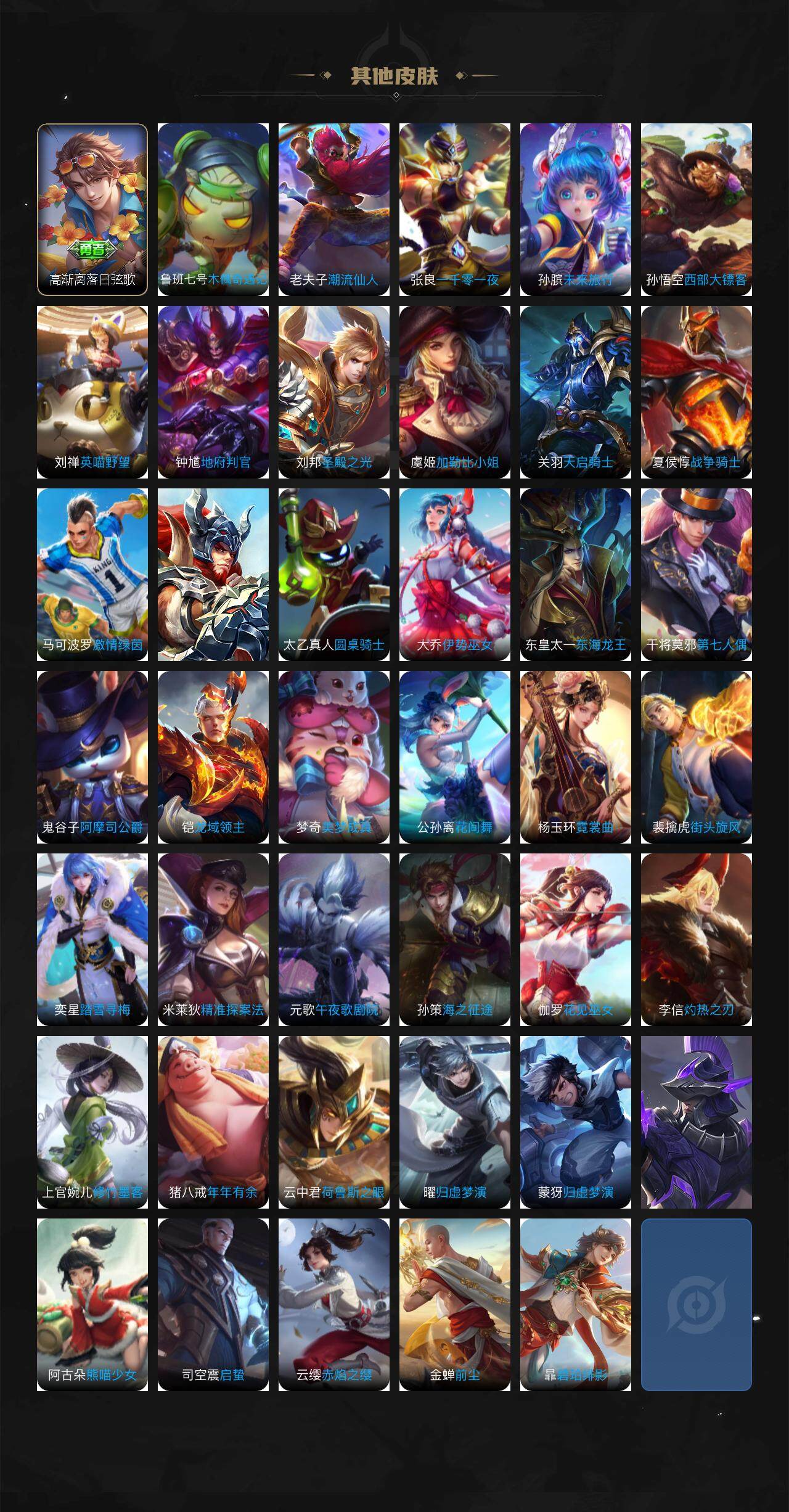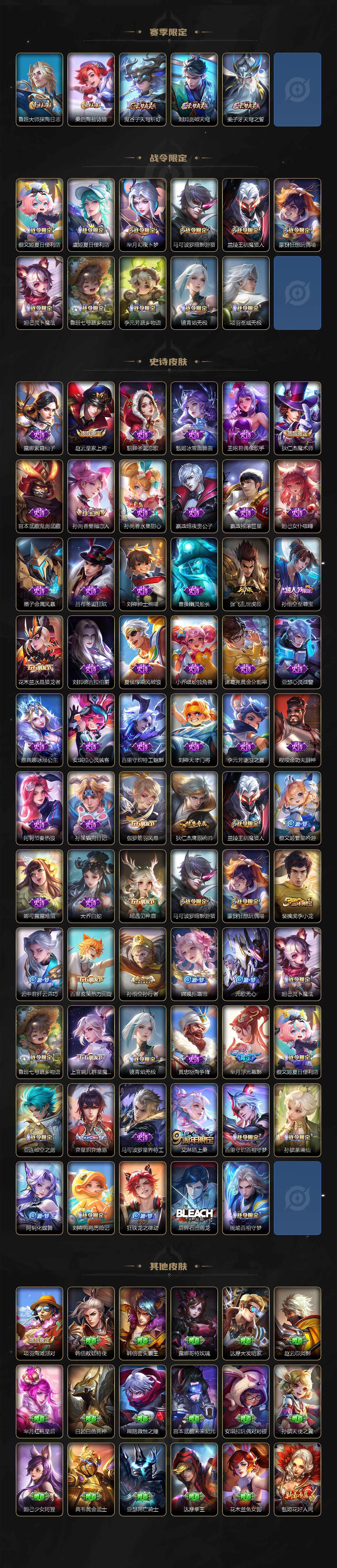 【赛季限定】:狄仁杰万华元夜,达摩沙漠行僧,程咬金演武夺筹,兰陵王金庭之子,张良古海寻踪,李元芳云中旅人,钟馗驱傩正仪,鬼谷子原初探秘者,苏烈千军破阵,弈星混沌棋,沈梦溪大漠名商,明世隐疑决卦,裴擒虎擒涛扼浪,鲁班大师探海日志,桑启海盐诗旅,鬼谷子天穹祈灯,刘邦剑破天穹,姜子牙天穹之誓