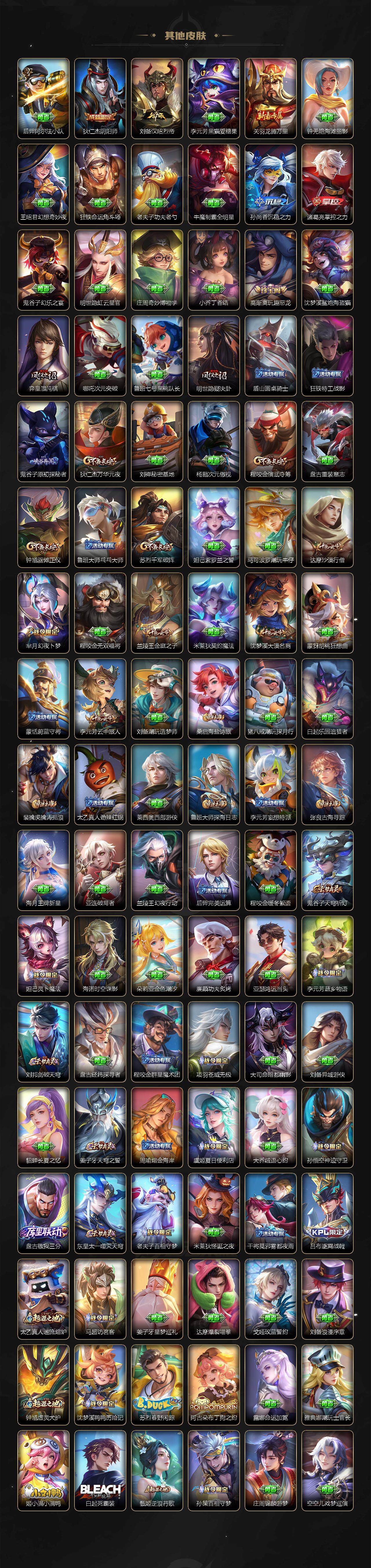【限定皮肤】:蔡文姬夏日便利店,大乔绒语心约,虞姬夏日便利店,姜子牙天穹之誓,狄仁杰阴阳师,赵云皇家上将,孙尚香蔷薇恋人,高渐离玩趣恶龙,芈月幻夜卜梦,元歌无心,马可波罗暗影游猎,狄仁杰魔术师,狄仁杰万华元夜,达摩沙漠行僧,项羽海滩派对,程咬金演武夺筹,兰陵王驯魔猎人,兰陵王金庭之子,孙悟空至尊宝,孙悟空孙行者,李元芳云中旅人,钟馗驱傩正仪,蔡文姬繁星吟游,鬼谷子原初探秘者,诸葛亮时雨天司,苏烈千军破阵,弈星混沌棋,沈梦溪大漠名商,明世隐疑决卦,裴擒虎李小龙,裴擒虎擒涛扼浪,云中君纤云弄巧,嫦娥拒霜思,蒙犽狂想玩偶喵,鲁班大师探海日志,桑启海盐诗旅,张良古海寻踪,妲己灵卜魔法,鬼谷子天穹祈灯,孙尚香乘龙问璇玑,鲁班七号蔬乡物语,李元芳蔬乡物语,刘邦剑破天穹,上官婉儿群星魔术团,程咬金群星魔术团,镜青焰无极,项羽苍威无极,刘备异域游侠,芈月浮光幕影,周瑜熔金海岸