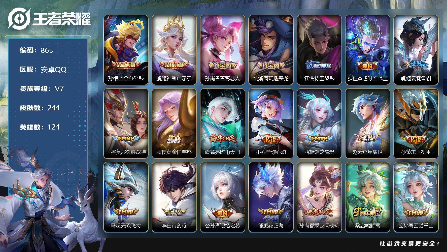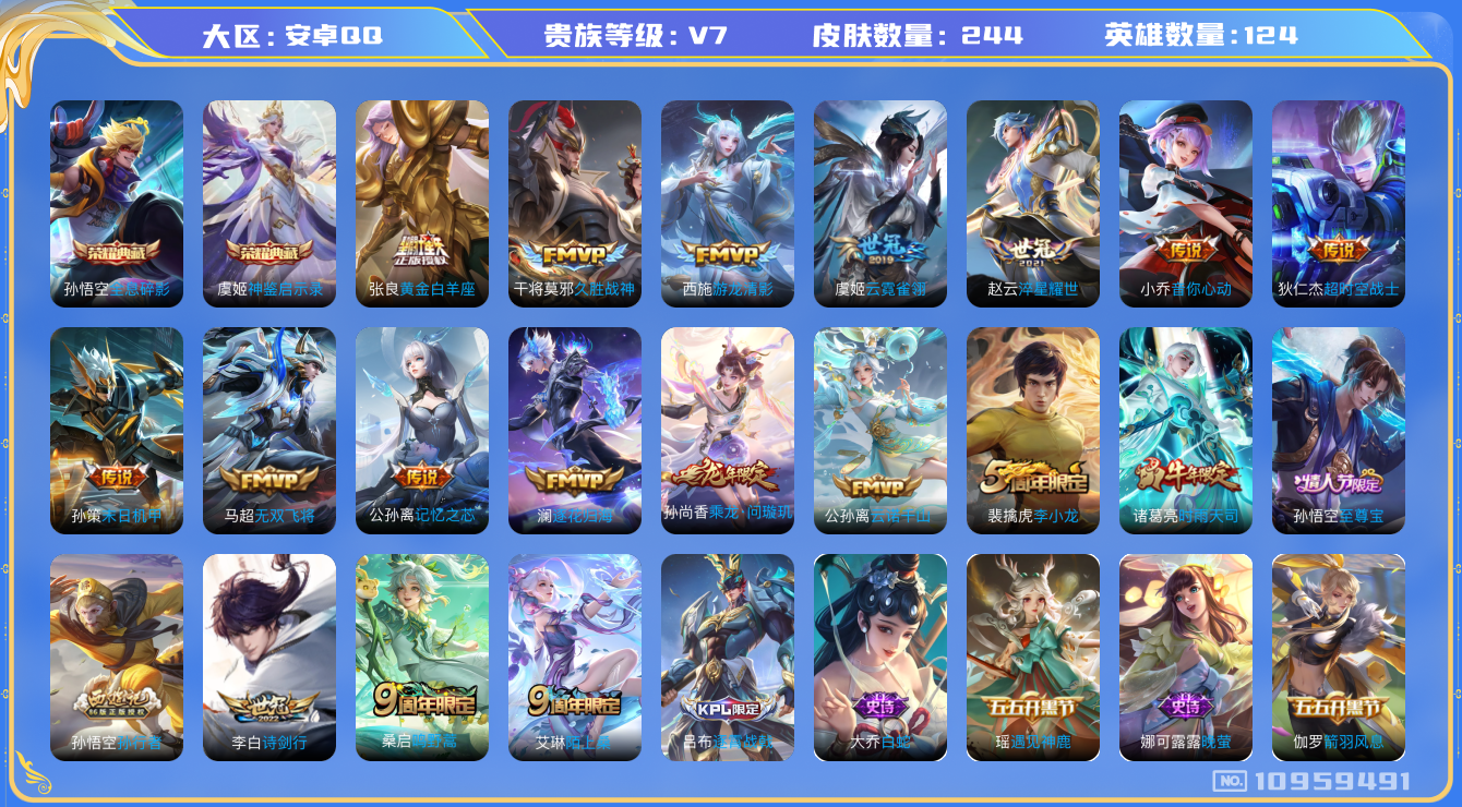 [10959491]【商品标题】:安卓Q-V7-至尊星耀I段位-124英雄-244皮肤-2典藏-0珍品无双-0无双-0珍品传说-16传说-64史诗