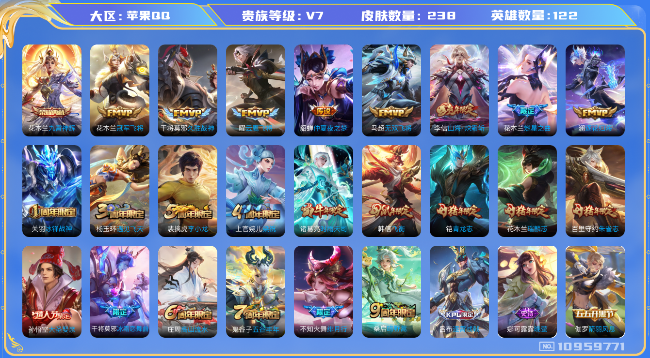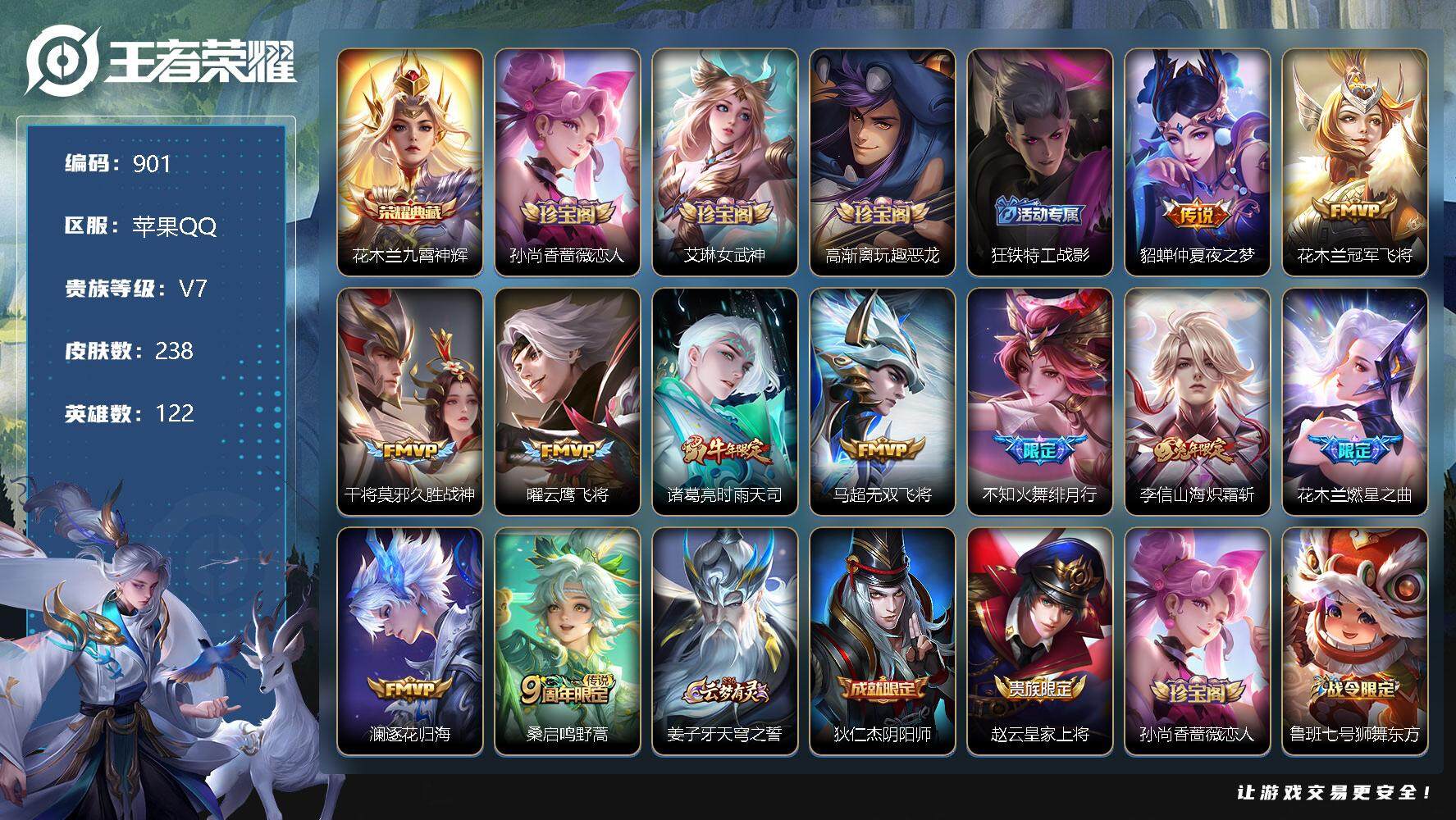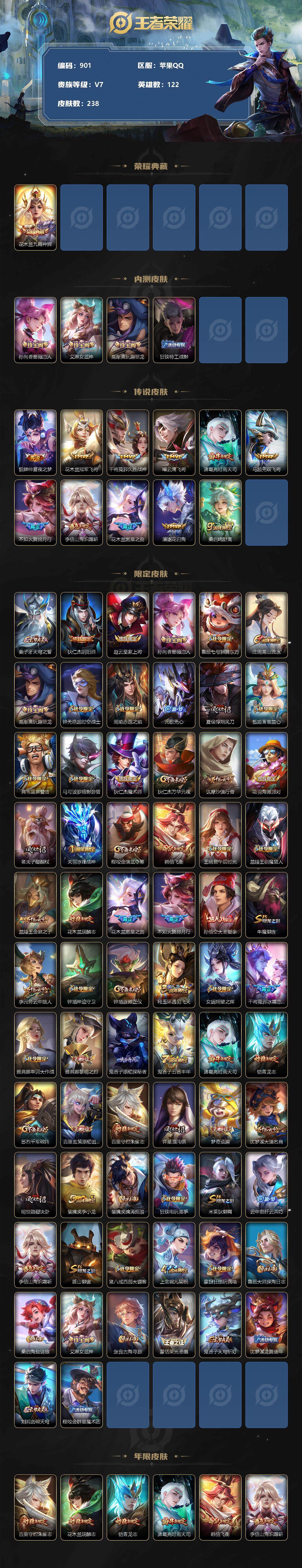 [10959771]【商品标题】:苹果Q-V6-至尊星耀II段位-122英雄-238皮肤-1典藏-0珍品无双-0无双-0珍品传说-11传说-66史诗
