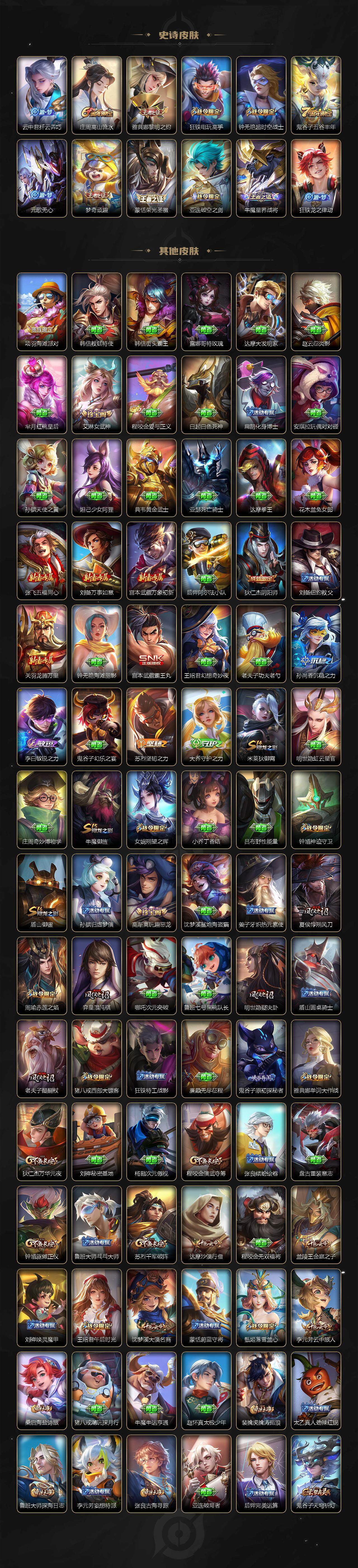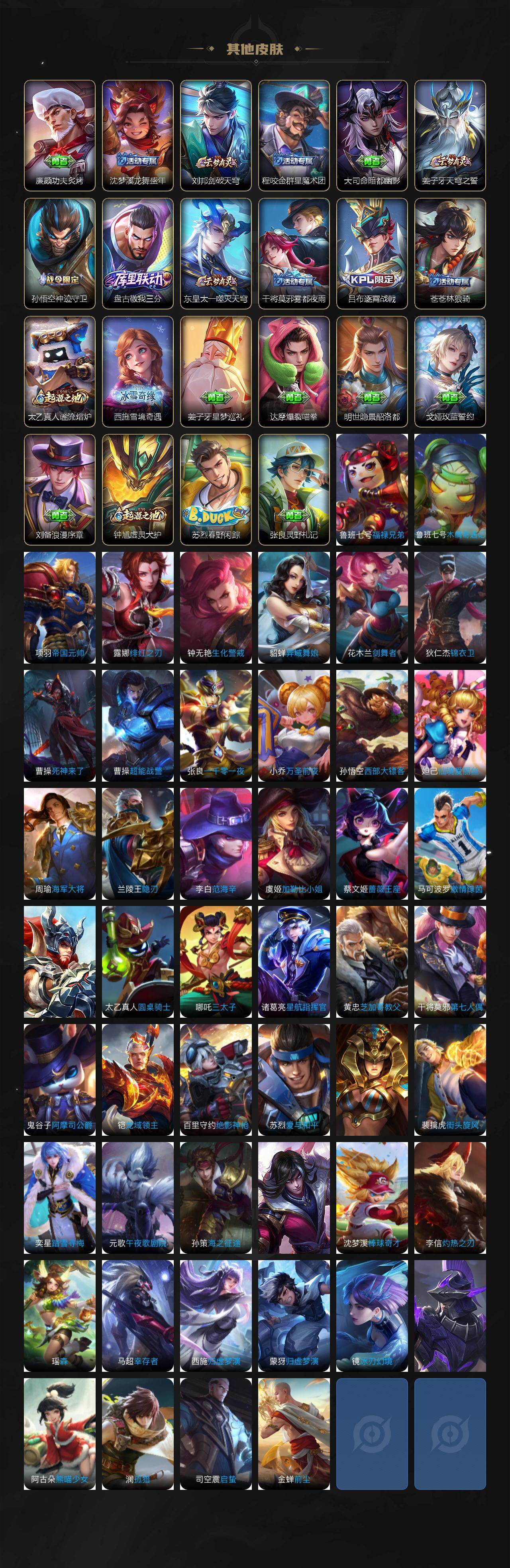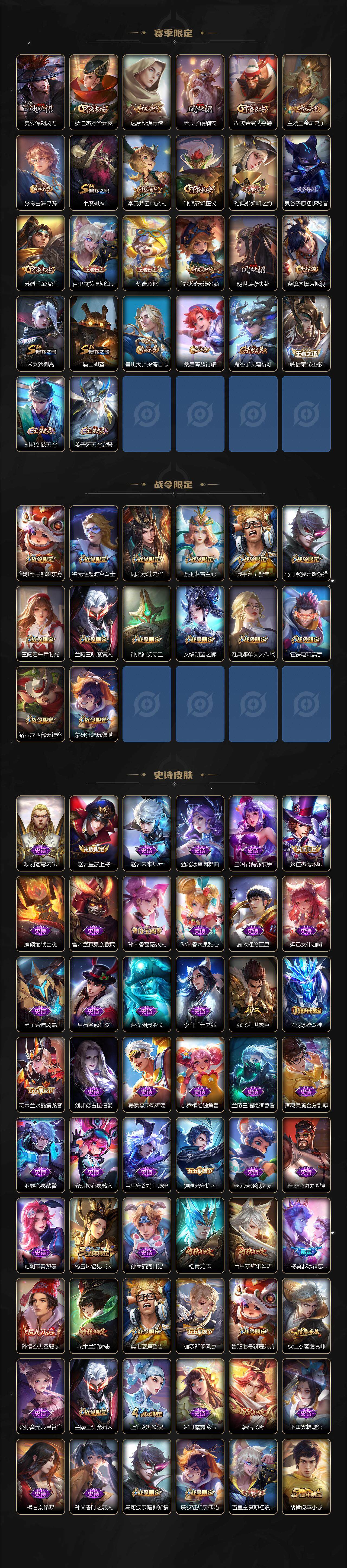 【限定皮肤】:姜子牙天穹之誓,狄仁杰阴阳师,赵云皇家上将,孙尚香蔷薇恋人,鲁班七号狮舞东方,庄周高山流水,高渐离玩趣恶龙,钟无艳超时空战士,周瑜赤莲之焰,元歌无心,夏侯惇朔风刀,甄姬落雪兰心,典韦蓝屏警告,马可波罗暗影游猎,狄仁杰魔术师,狄仁杰万华元夜,达摩沙漠行僧,项羽海滩派对,老夫子醍醐杖,关羽冰锋战神,程咬金演武夺筹,韩信飞衡,王昭君午后时光,兰陵王驯魔猎人,兰陵王金庭之子,花木兰瑞麟志,花木兰燃星之曲,不知火舞绯月行,孙悟空大圣娶亲,牛魔御旌,李元芳云中旅人,钟馗神迹守卫,钟馗驱傩正仪,杨玉环遇见飞天,女娲朔望之晖,干将莫邪冰霜恋舞曲,雅典娜单词大作战,雅典娜黎明之约,鬼谷子原初探秘者,鬼谷子五谷丰年,诸葛亮时雨天司,铠青龙志,苏烈千军破阵,百里玄策原初追逐者,百里守约朱雀志,弈星混沌棋,梦奇顽趣,沈梦溪大漠名商,明世隐疑决卦,裴擒虎李小龙,裴擒虎擒涛扼浪,狂铁电玩高手,米莱狄御霄,云中君纤云弄巧,李信山海炽霜斩,盾山御銮,猪八戒西部大镖客,上官婉儿梁祝,蒙犽狂想玩偶喵,鲁班大师探海日志,桑启海盐诗旅,艾琳女武神,张良古海寻踪,蒙恬荣光圣徽,鬼谷子天穹祈灯,沈梦溪龙舞盛年,刘邦剑破天穹,程咬金群星魔术团