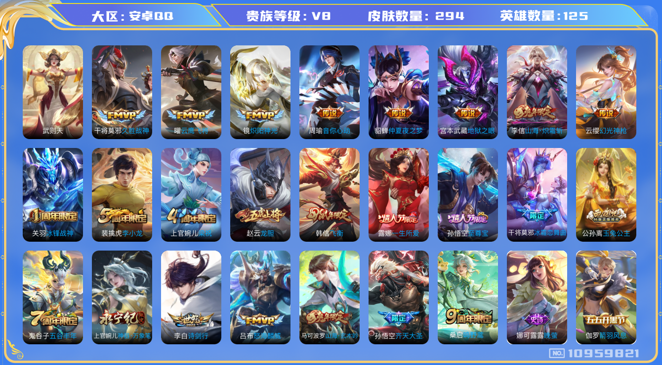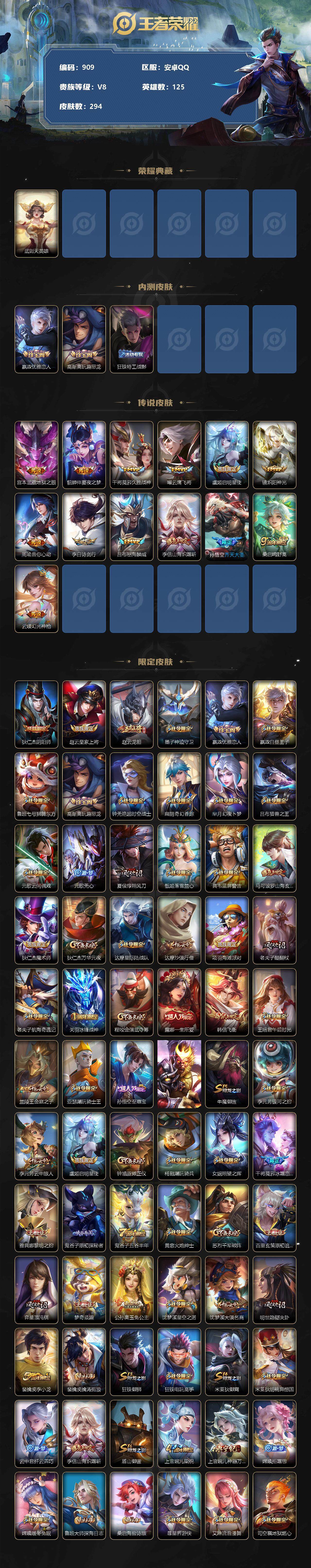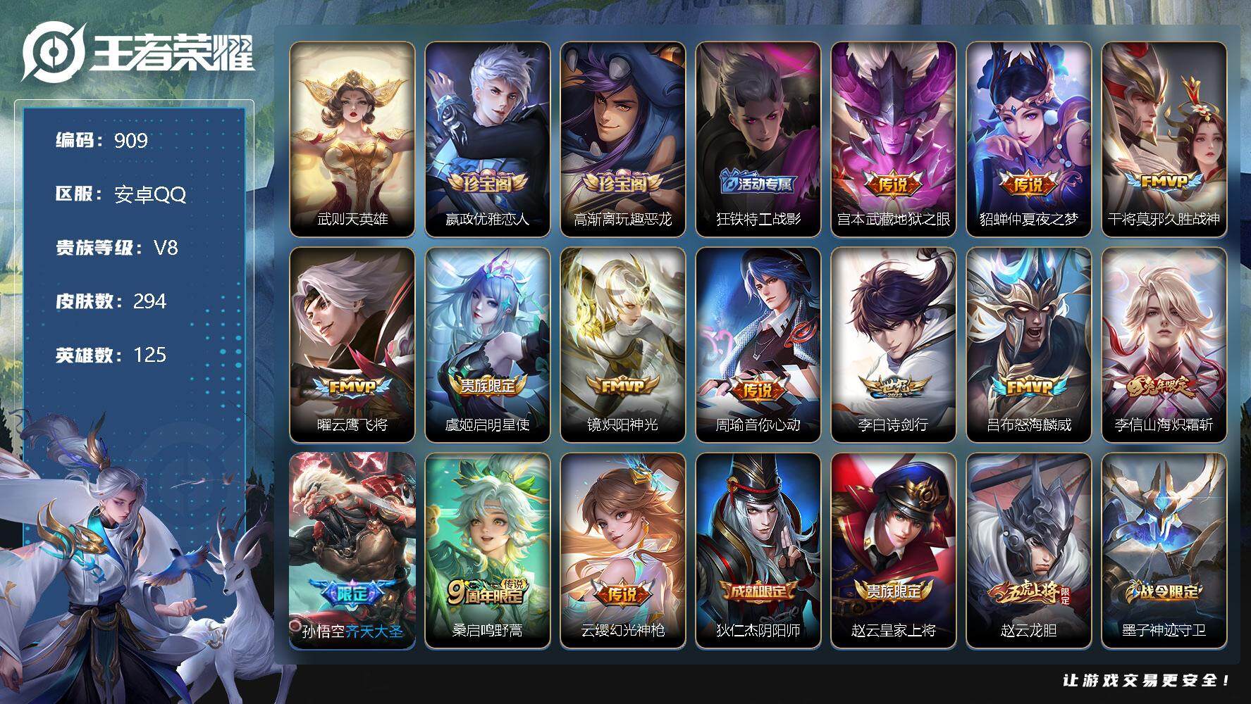 [10959821]【商品标题】:安卓Q-V8-最强王者段位-125英雄-294皮肤-0典藏-0珍品无双-0无双-0珍品传说-13传说-87史诗